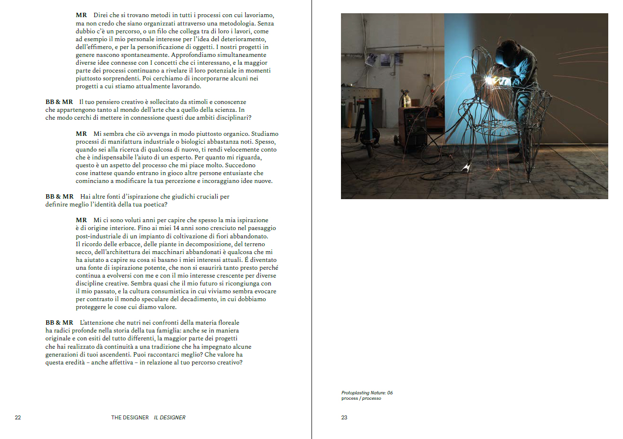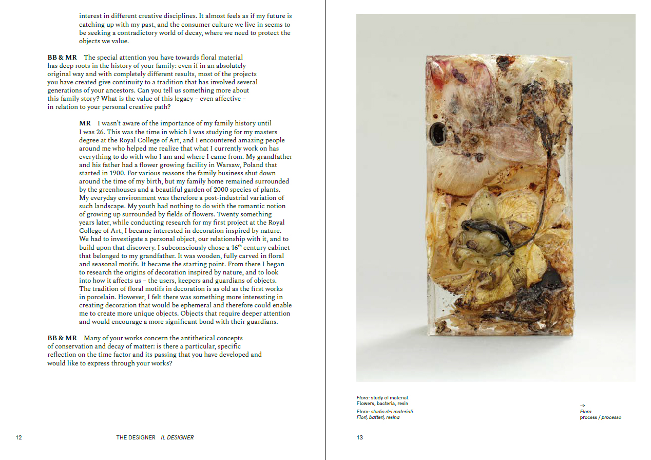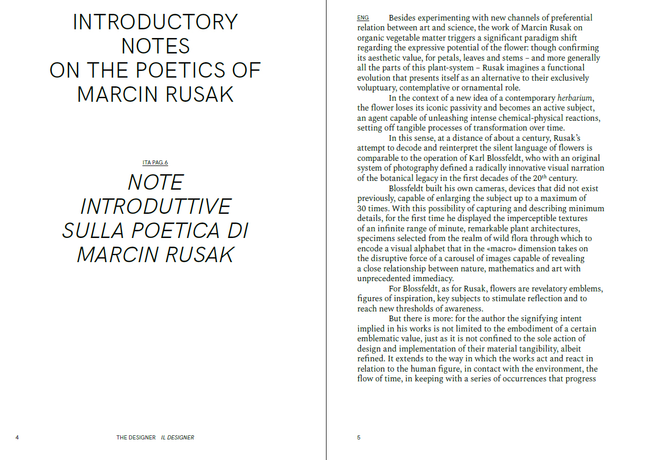 Beside testing new channels of preferential relationship between art and science as well as between artisanal and industrial manufacturing processes, the Polish designer is known for having contributed to the invention of formulas useful for accelerating or arresting the deterioration of organic floral matter; through the development of an absolutely original expressive language, Rusak's projects lead to unexpected results and material experiments, where a vital proliferation turns into deadly corruption and vice versa.
