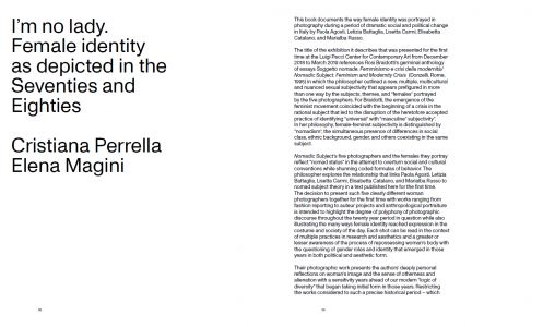 Soggetto nomade (Nomadic Subject) gathers, for the first time in one volume, shots taken by five Italian photographers between the mid 60s to the 80s. The photographs are giving glimpses on the way female subjectivity was lived, represented and interpreted back in the days, in a time of great social change in Italy. Years of transition from political radicalism to hedonism, the lead years were also years of great participation and civil conquests, mostly due to the