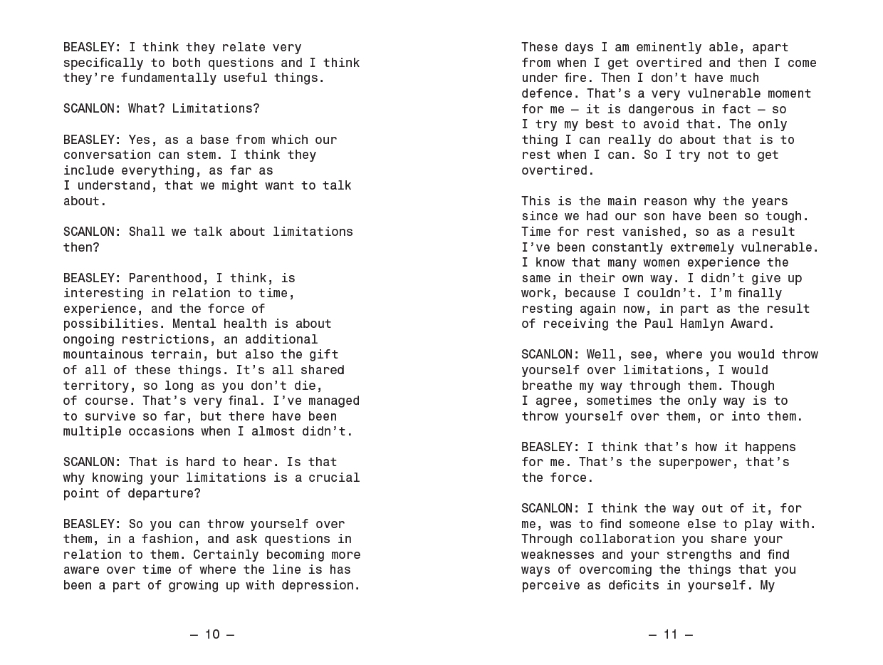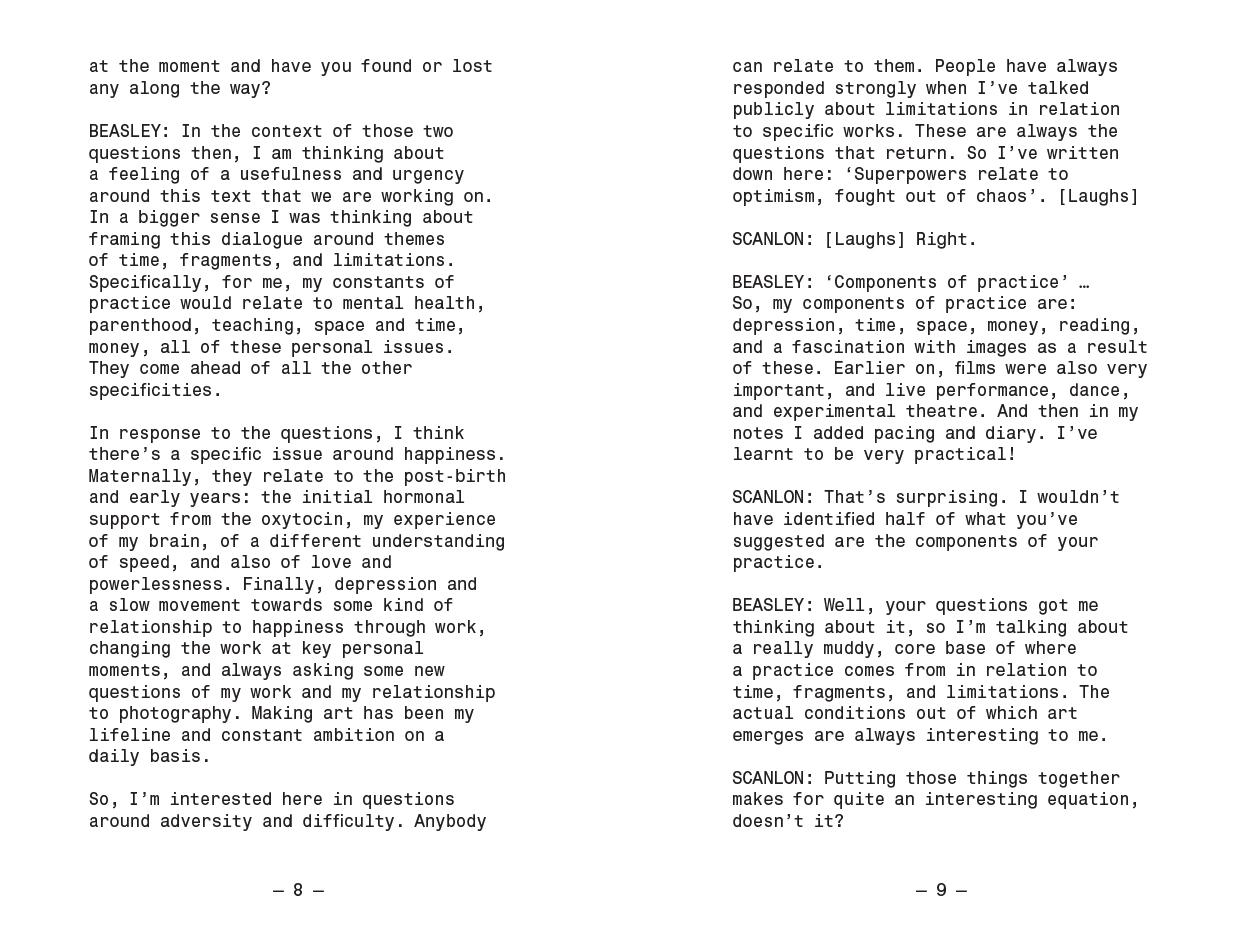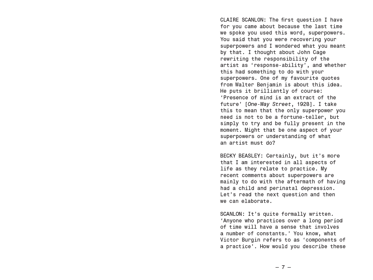 Around 1999, artist Becky Beasley began writing to her former tutor, Claire Scanlon, who kept her letters but never replied. Years later, in 2016, the two began to intermittently record their conversations, now as friends. Here they discuss their “components of practice”, which are as mundane as they are existential: space, time, literature, resistance, clarity, ambiguity, burrowing, parenthood, depression, and German Soup.