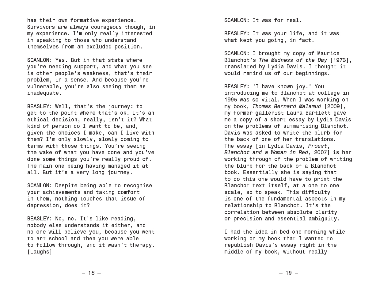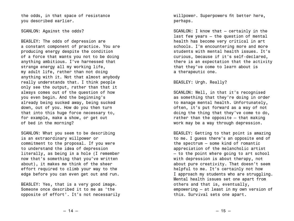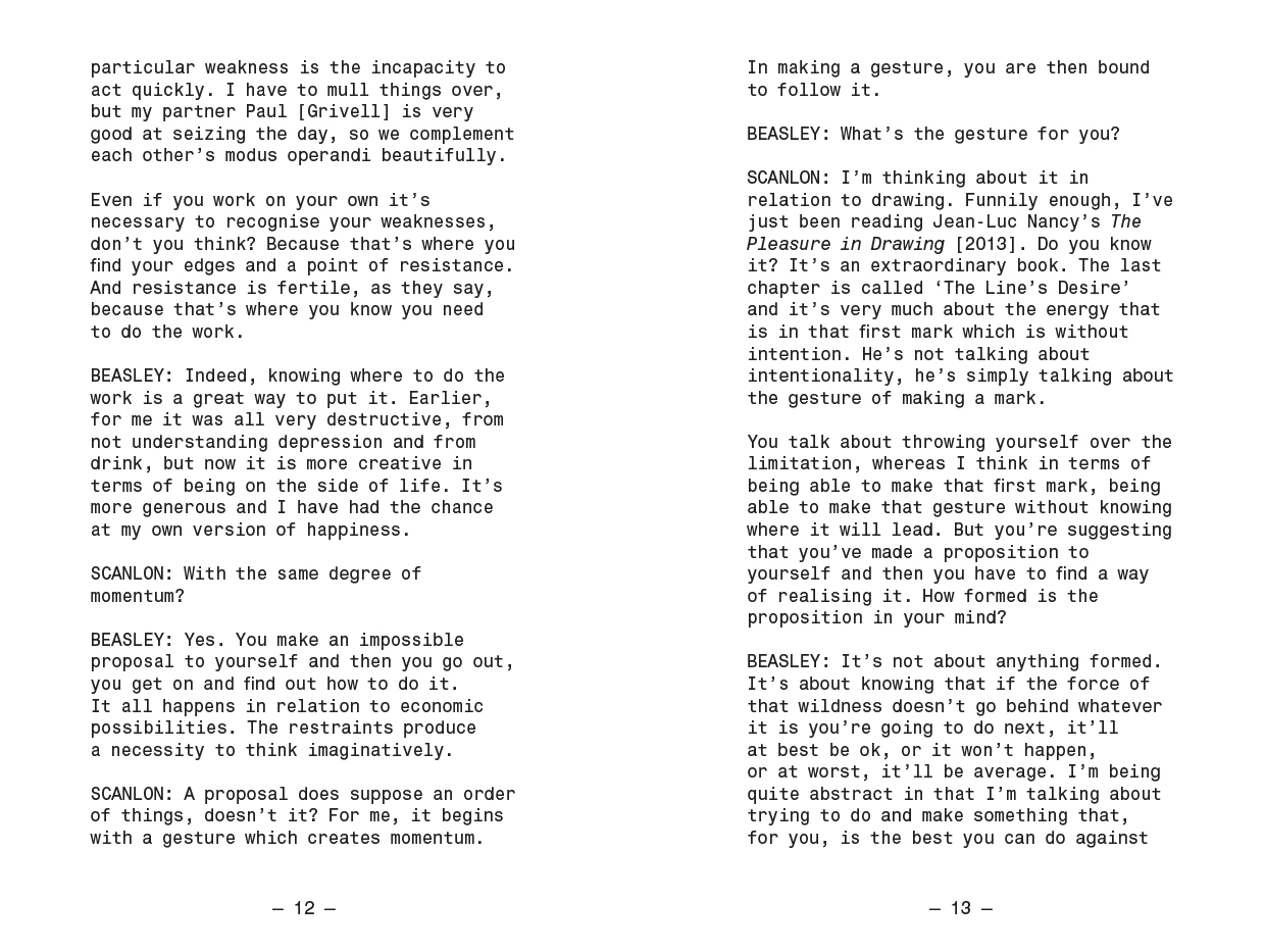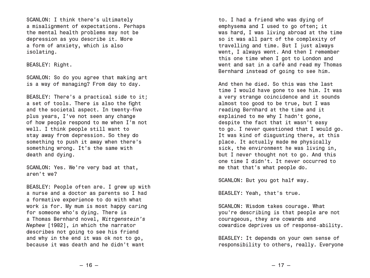 Around 1999, artist Becky Beasley began writing to her former tutor, Claire Scanlon, who kept her letters but never replied. Years later, in 2016, the two began to intermittently record their conversations, now as friends. Here they discuss their “components of practice”, which are as mundane as they are existential: space, time, literature, resistance, clarity, ambiguity, burrowing, parenthood, depression, and German Soup.