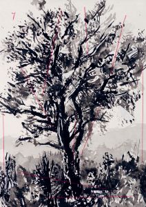 APOPTOSIS) proposes the drawing of a tree on the recto, three drawings and a text on the verso, recall his indignation at the death of a tree, a tree planted in his garden when he was a 9 year-old child. It should have lived up to a hundred or even two hundred years. The text ruminates on the inner sapling growing within us all that we hope will reach full fruition.