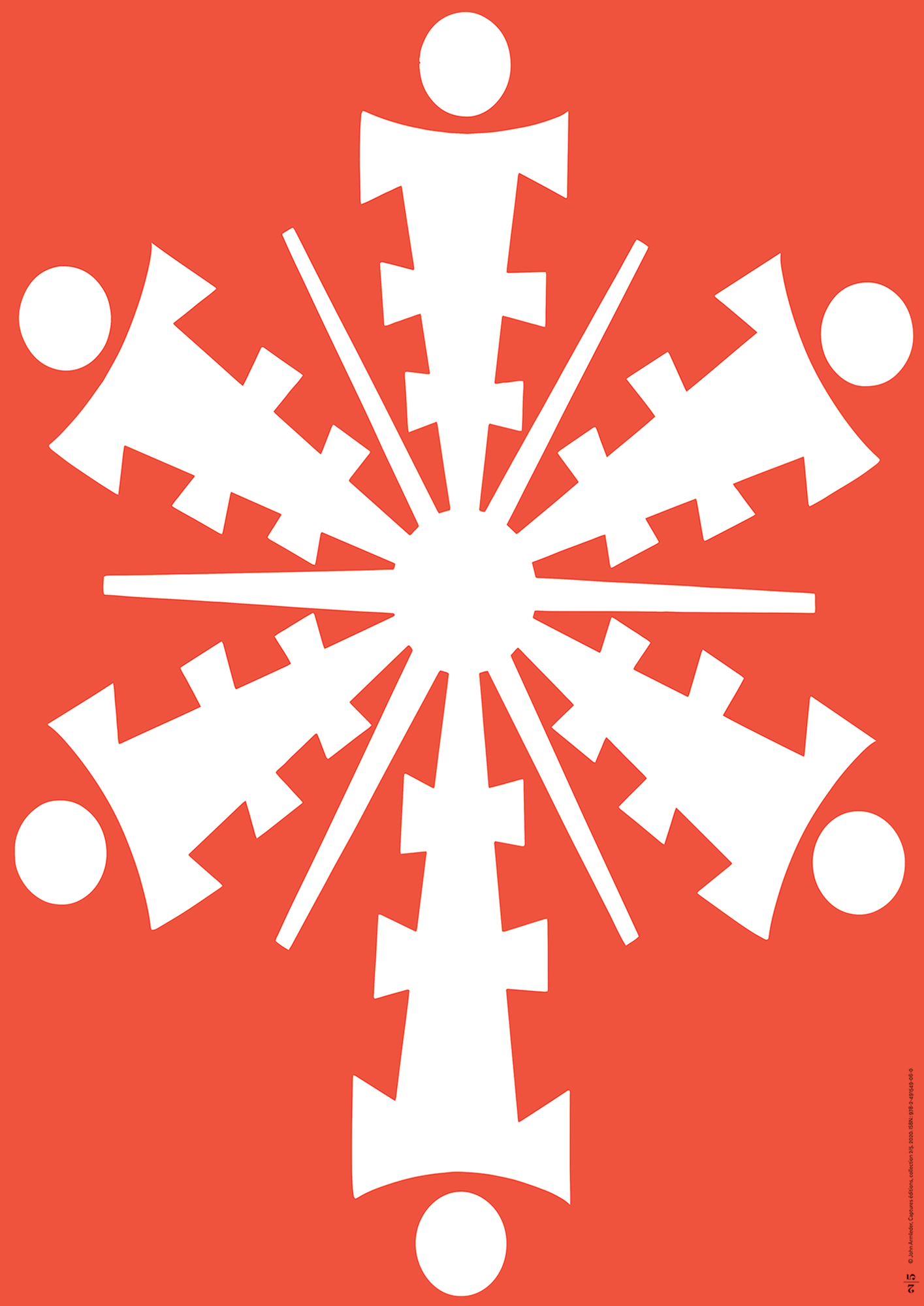 John M Armleder finds inspiration in a Tibetan drawing used for an exercise in eye gymnastics; the original image is treated in negative with the choice of a solid red surround. The folding on the A6 format is accompanied by an insert, a fragment of text from the Tibetan charter.