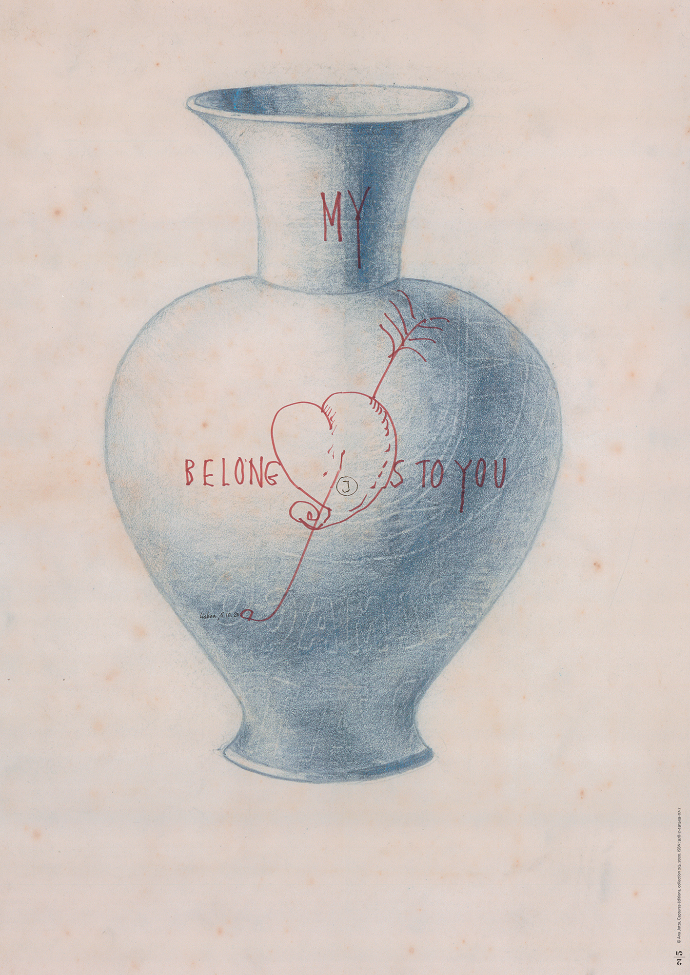 MY HEART BELONGS TO YOU) works over an existing drawing dating from the nineteen-fifties, unearthed at the flea market. This echoes her own experience when Portuguese high school students were invited to make life drawings on Almaço paper. The heart drawn on the vase also refers to a traditional motif used on Portuguese artisanal pottery.