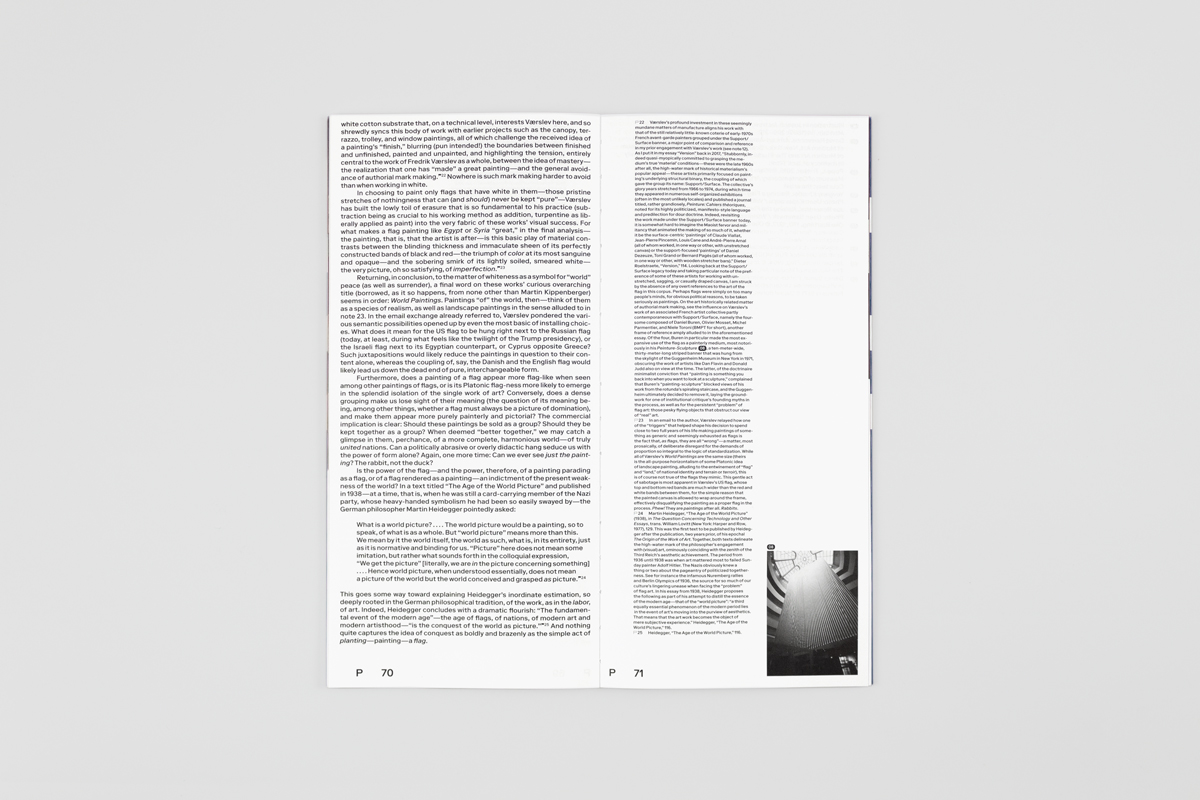 What does it mean to paint a flag and to paint it in 2020? Through art historical, sociocultural, and philosophical lenses, Dieter Roelstraete undertakes an investigation of vexillology—the study of flags—as a way to decipher World Paintings, the new series of works by Norwegian artist Fredrik Værslev depicting national flags.