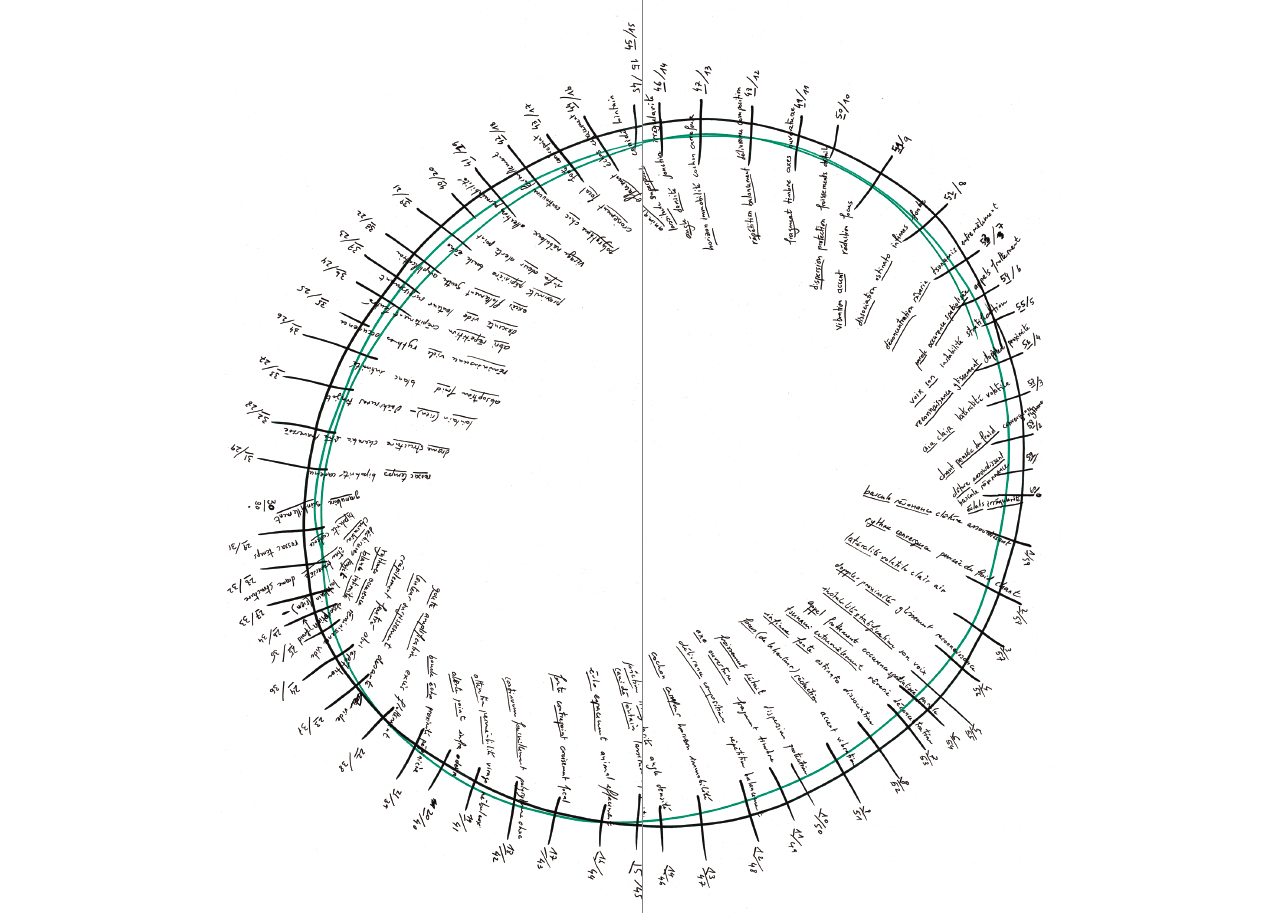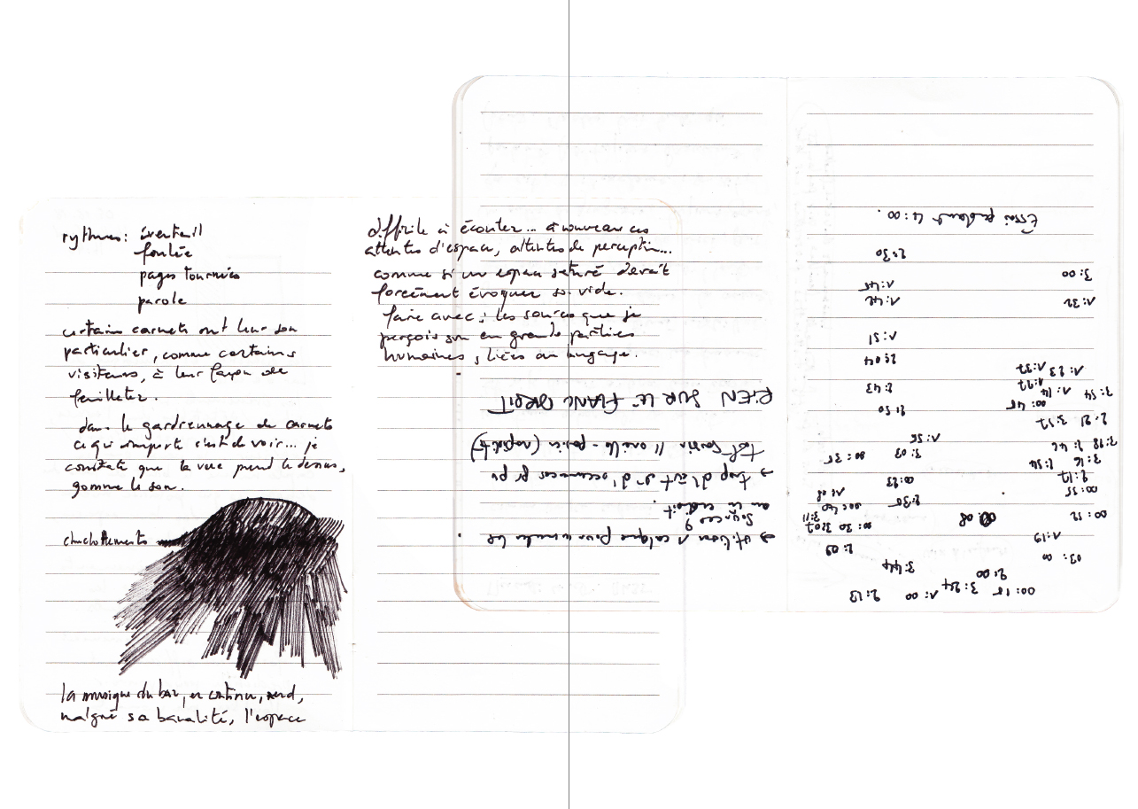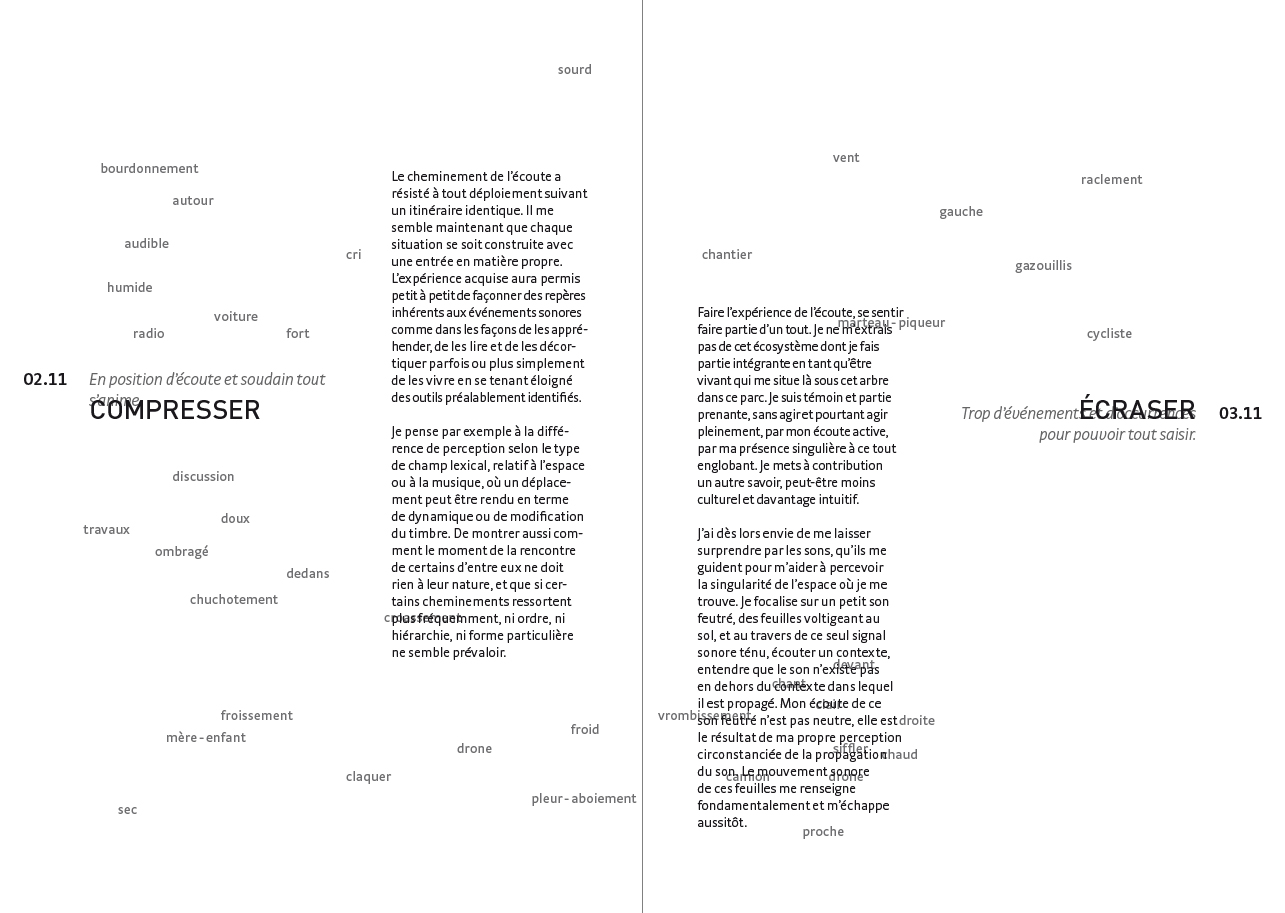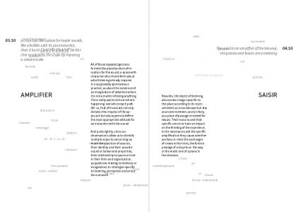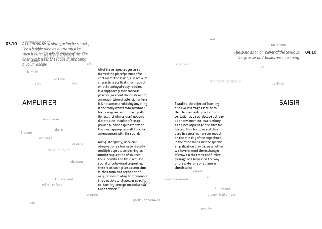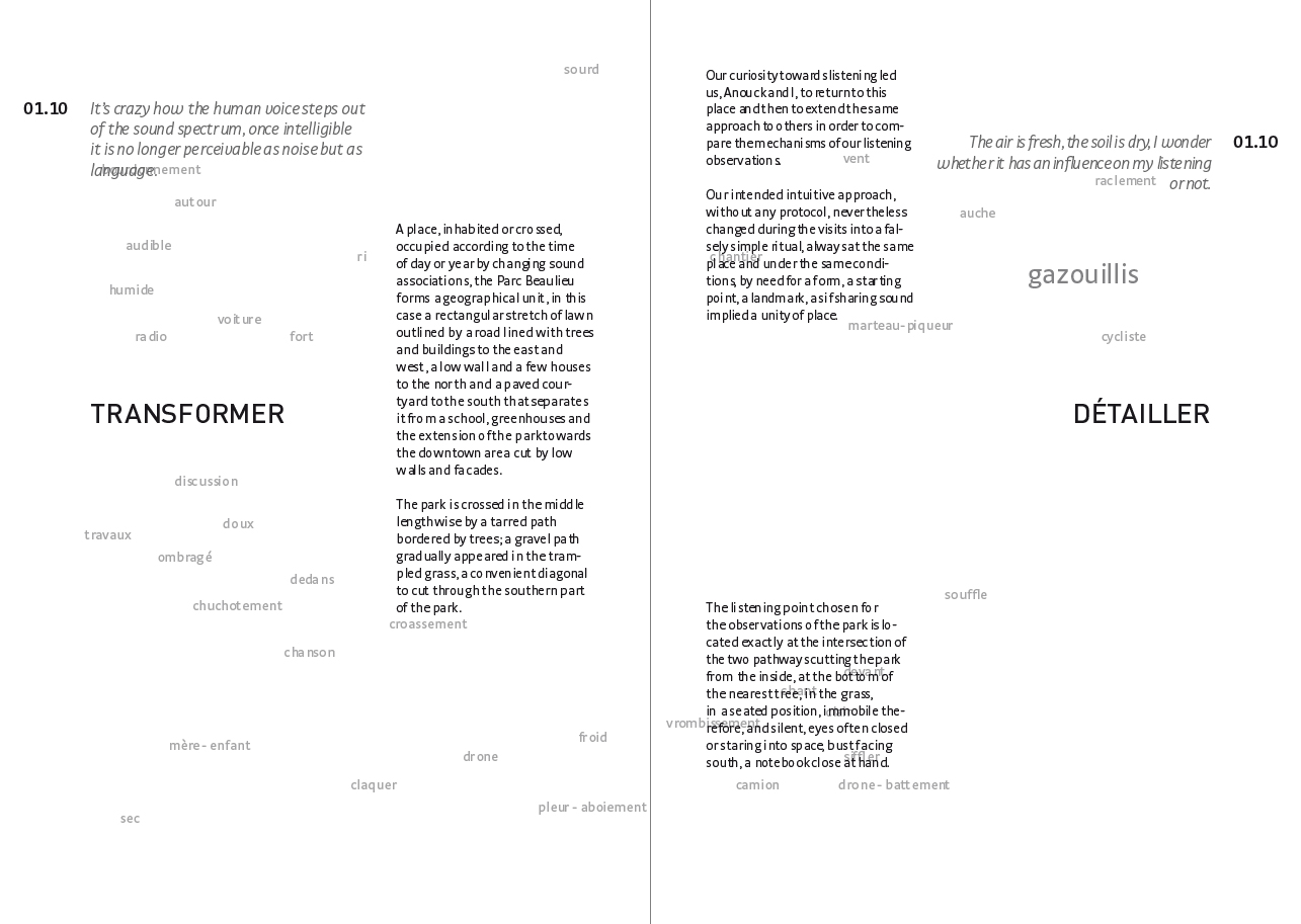 This book is the result of one year of listening at Le Parc Beaulieu in 2017-2018. This work is about listening and the different paths our sensation and understanding of a place follow through the ever-changing experience of sound, although happening in familiar environments and with the same vocabulary. With the notes and drawings from their handbooks, Anouck Genthon and Antoine Läng built a circular and immersive narrative kept in a book with no beginning and no end, as an invitation for the reader to share this continuous experience and reflection about what and how we actually hear.
