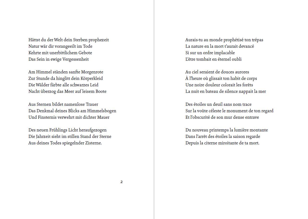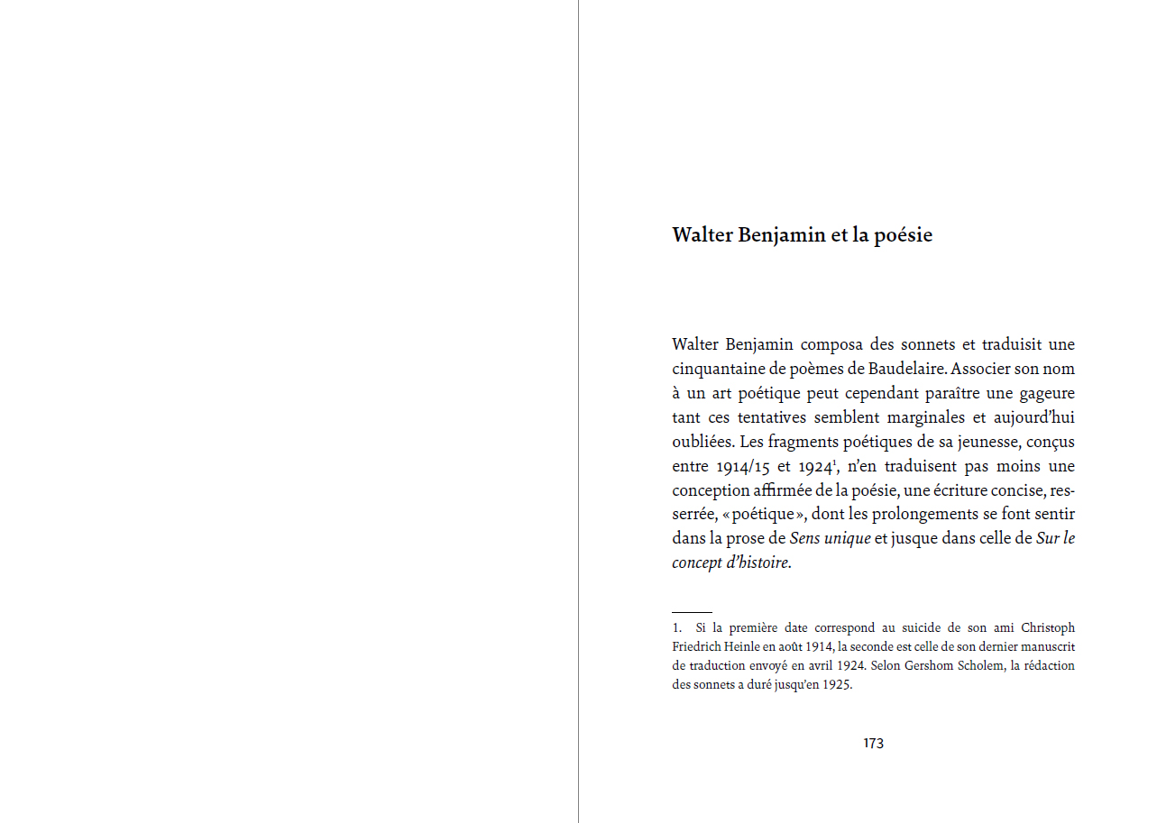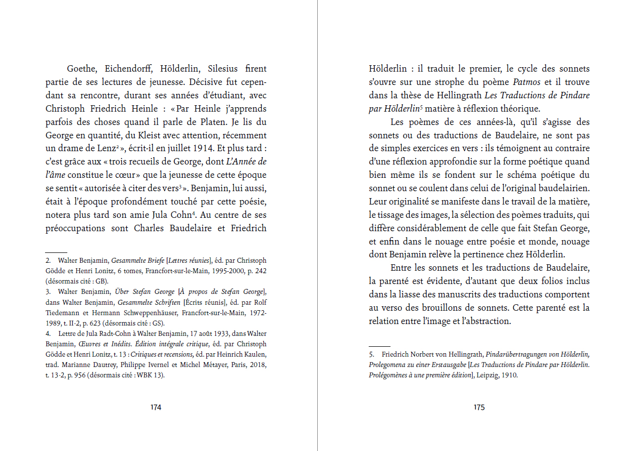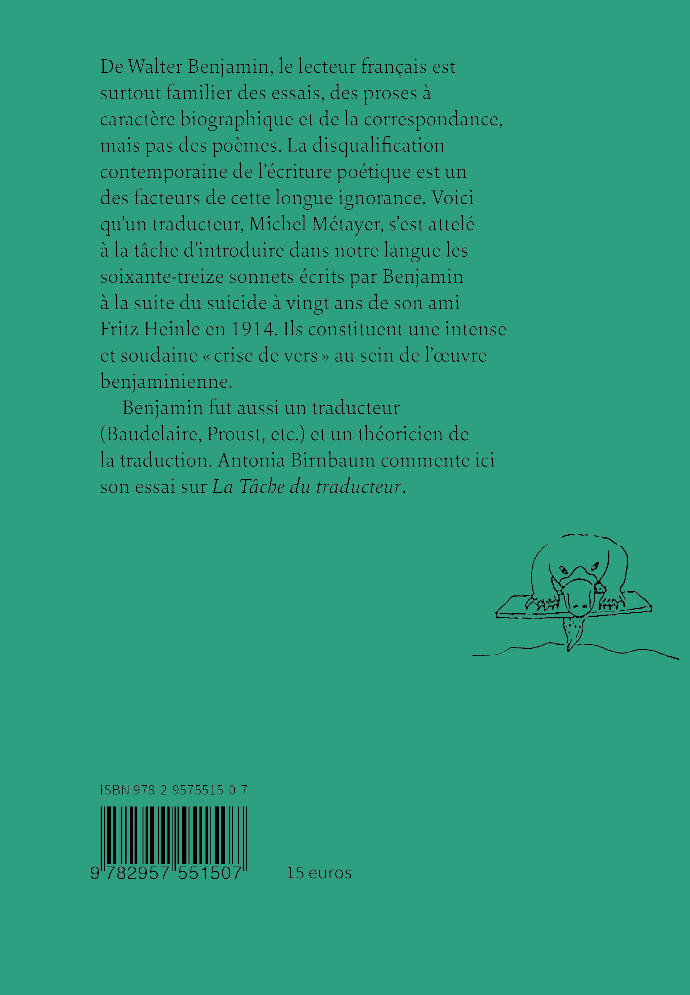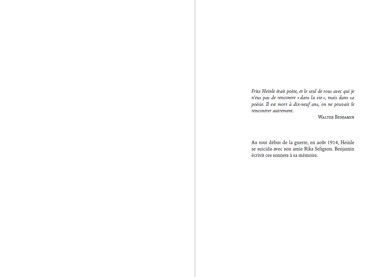 The seventy-three sonnets, unpublished in French, written by Walter Benjamin in memory of his friend Fritz Heinle, a poet who committed suicide at the age of 19, in despair or in protest against the advance of the First World War (bilingual edition).