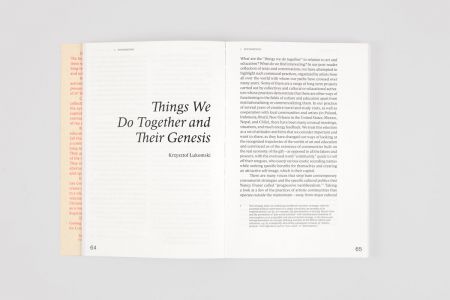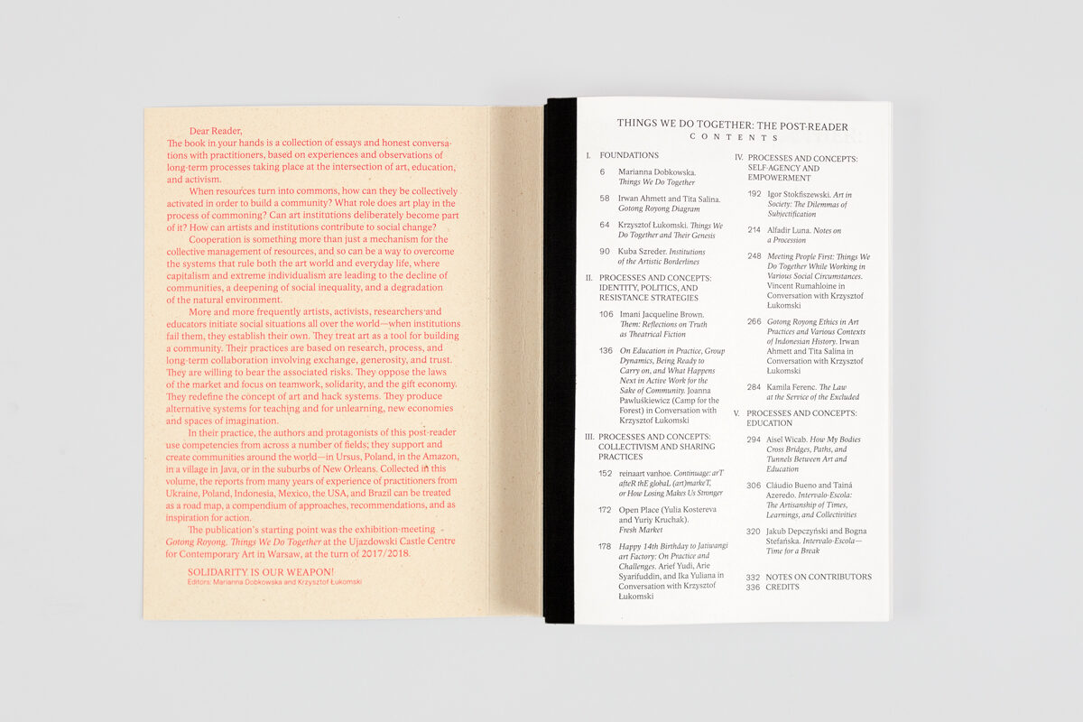 The publication's starting point was the exhibition-meeting Gotong Royong. Things We Do Together at Ujazdowski Castle Centre for Contemporary Art, Warsaw, at the end of 2017.
