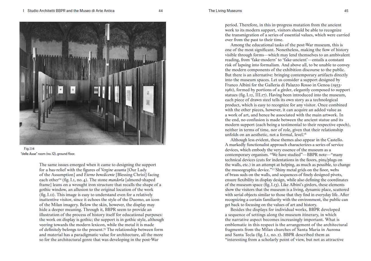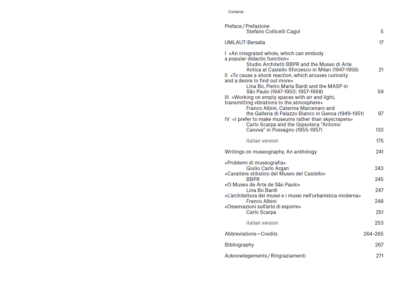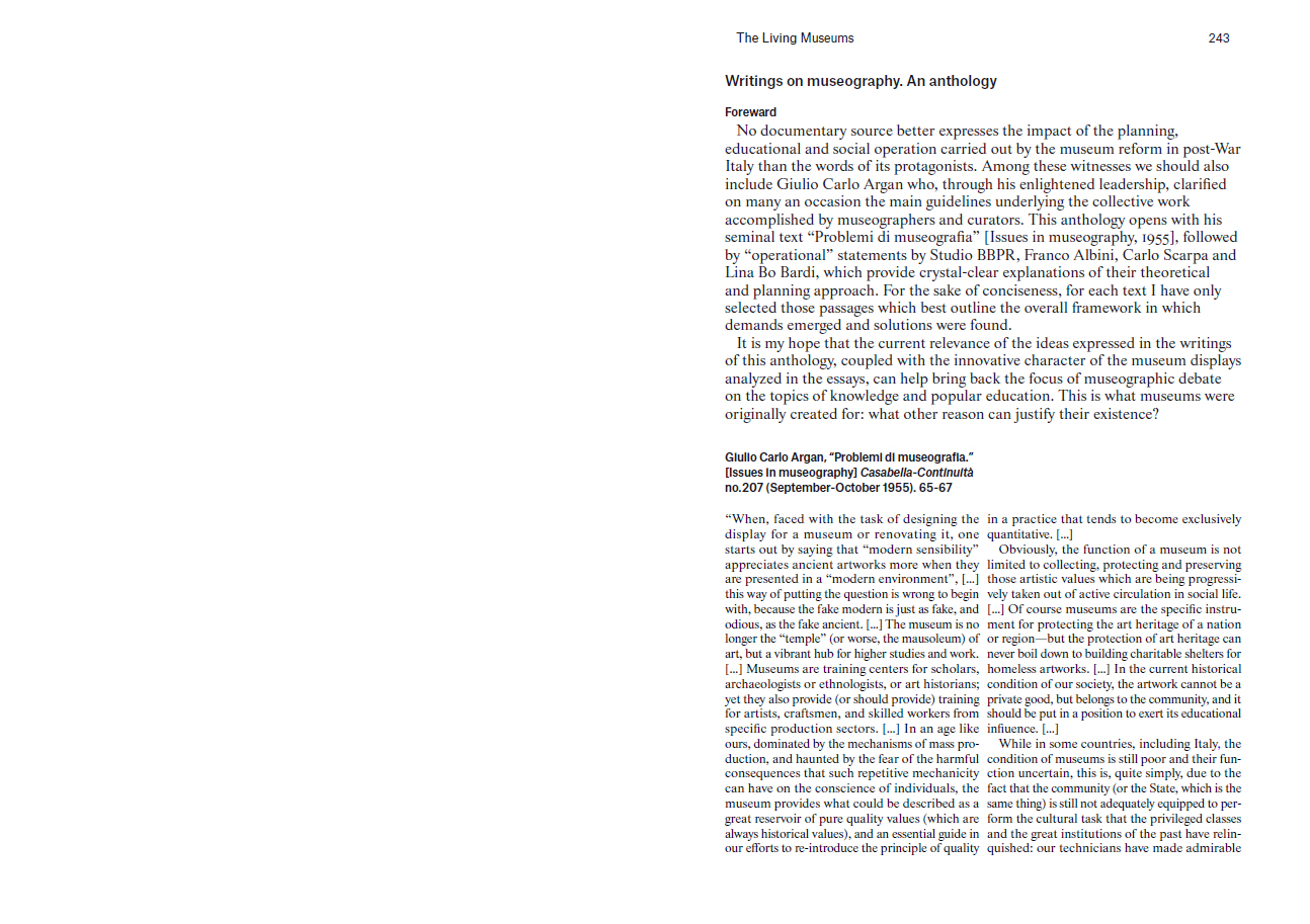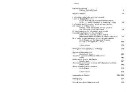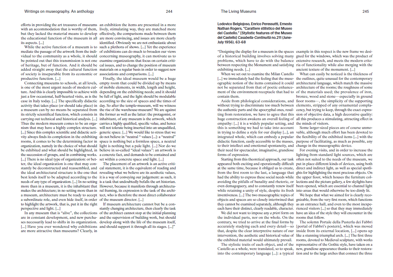 An anthology of essays by Albini, BBPR, Bo Bardi, Scarpa and art historian Giulio Carlo Argan completes the volume, drawing attention back to some themes that are crucial also for contemporary Museography.