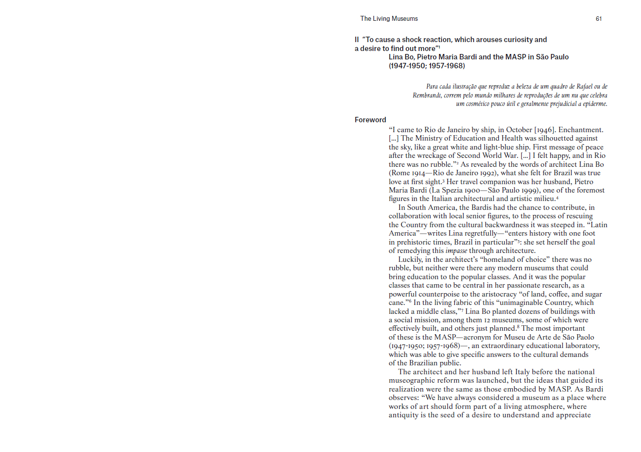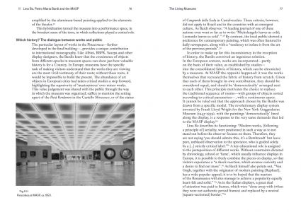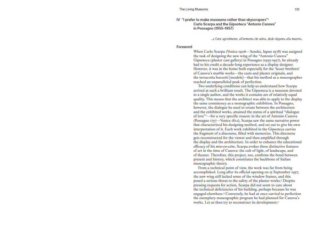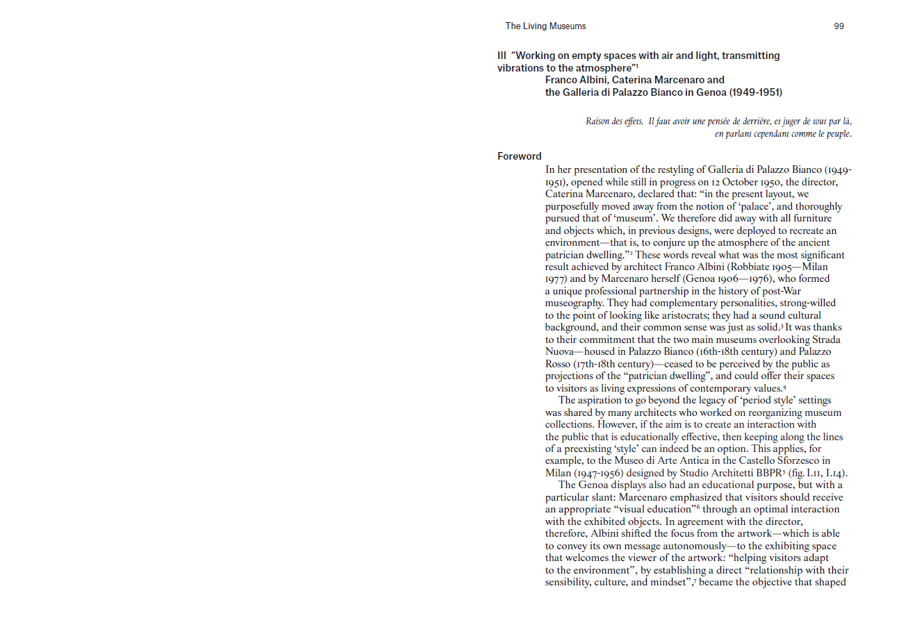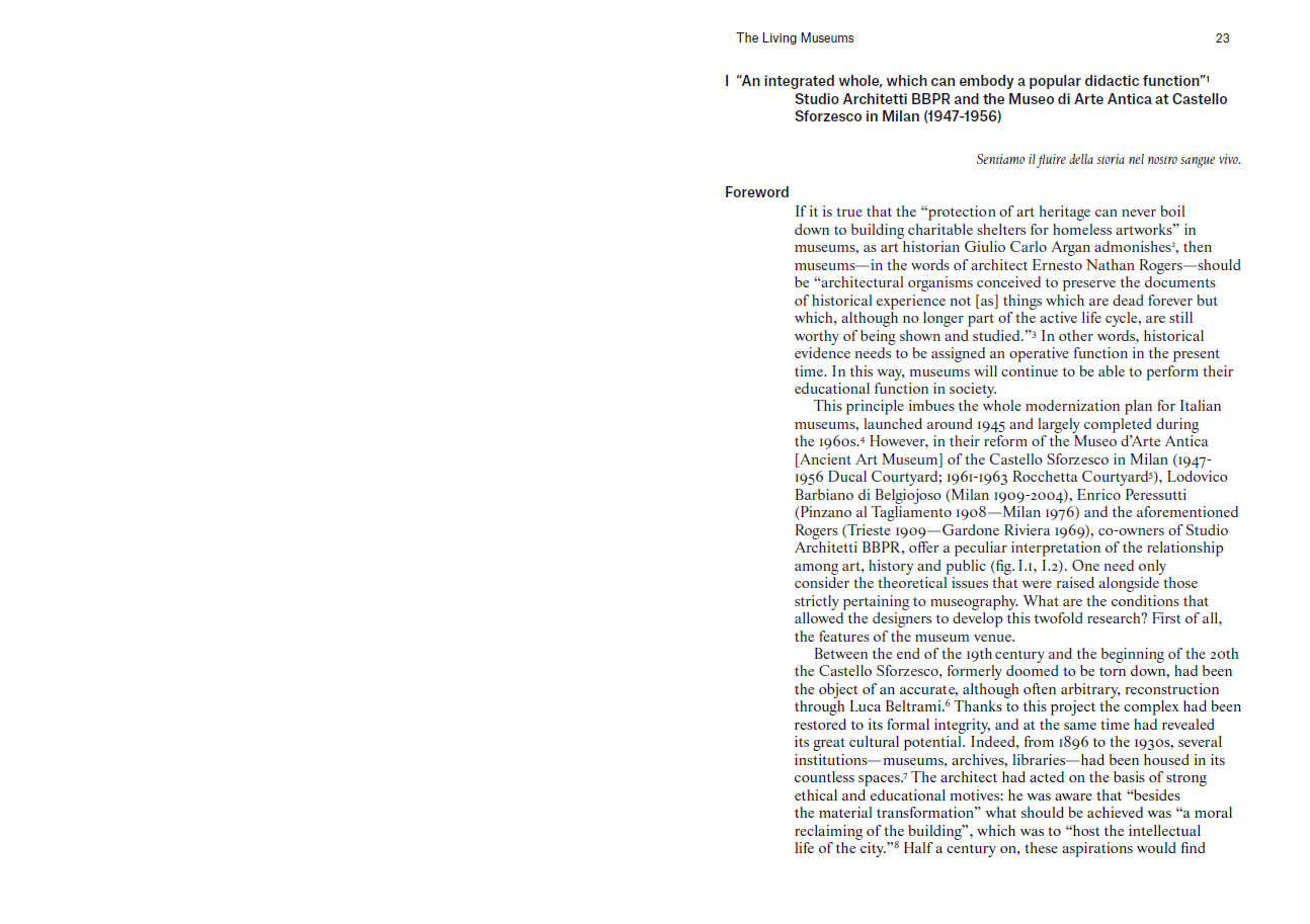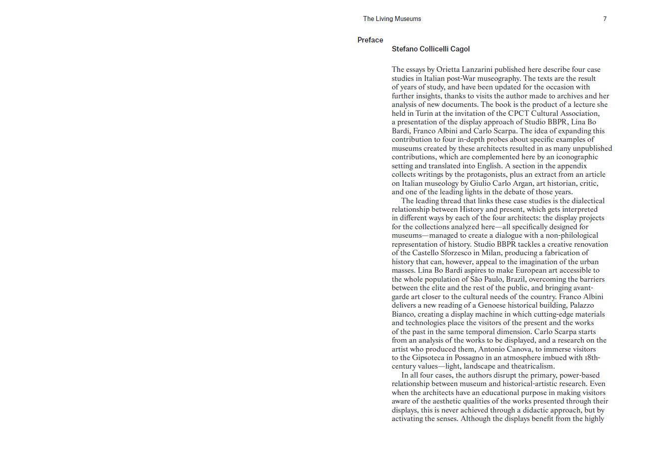 An anthology of essays by Albini, BBPR, Bo Bardi, Scarpa and art historian Giulio Carlo Argan completes the volume, drawing attention back to some themes that are crucial also for contemporary Museography.