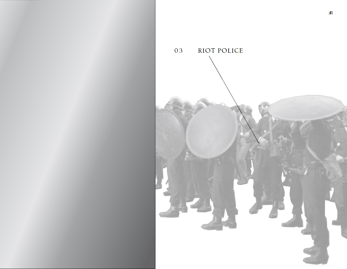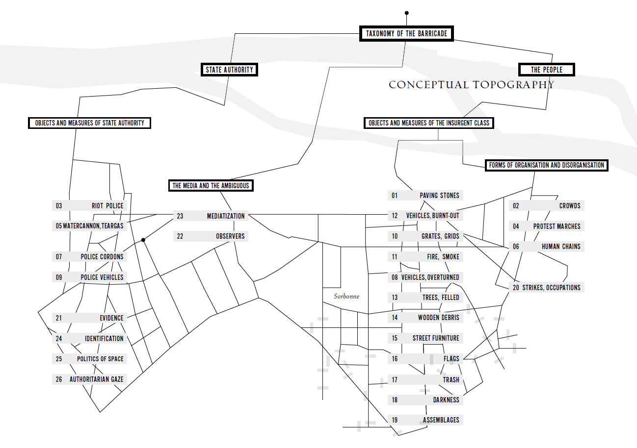 An iconographic taxonomy—researched, conceived, and ideated by Wolfgang Scheppe, also author of the book's final essay—that traces the state and police visual control through almost 500 images from the May 1968 police archives in Paris.