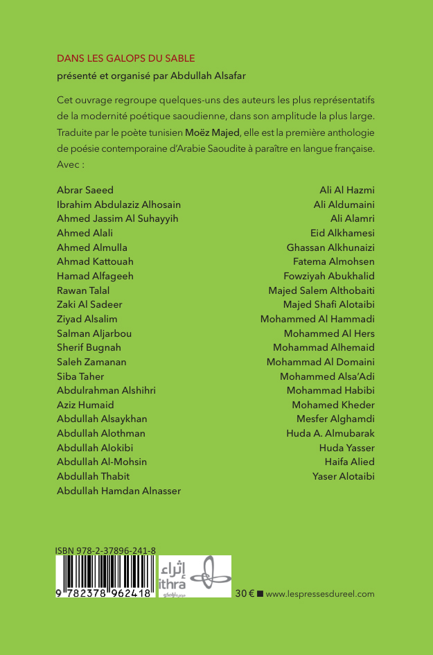 Moëz Majed, it is the first anthology of contemporary poetry from Saudi Arabia to be published in French.