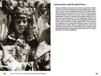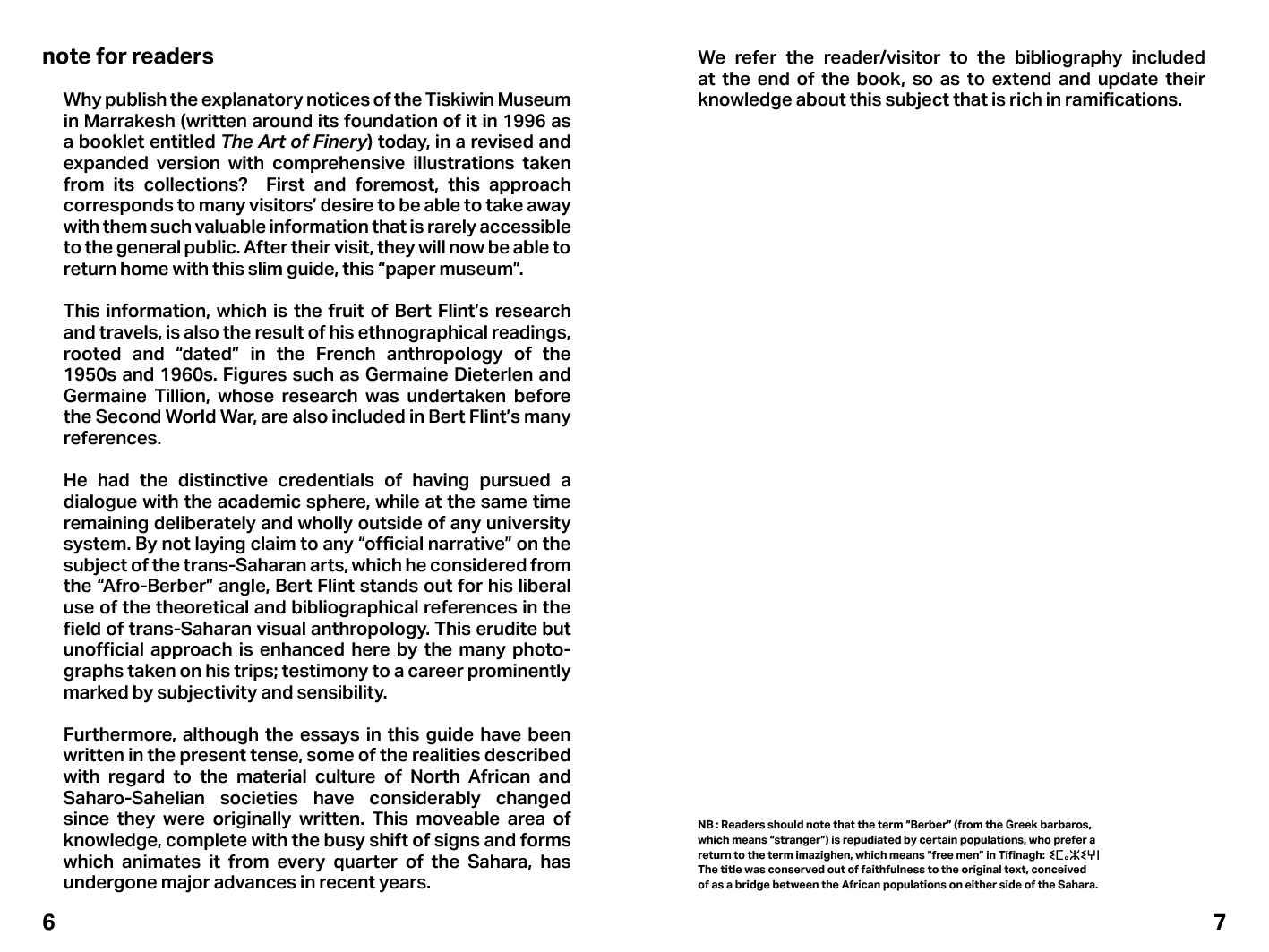 An augmented reissue of the guide to the Tiskiwin museum in Marrakech, created by collector and anthropologist Bert Flint following his various travels through Transsaharian Africa: a pocket book that aims at sharing with a large audience the great journey of Afro-Berber arts from the Eastern High Atlas to the Niger River; where emerges a visual culture both millennium and contemporary, extending from the Maghreb to Sahel countries.