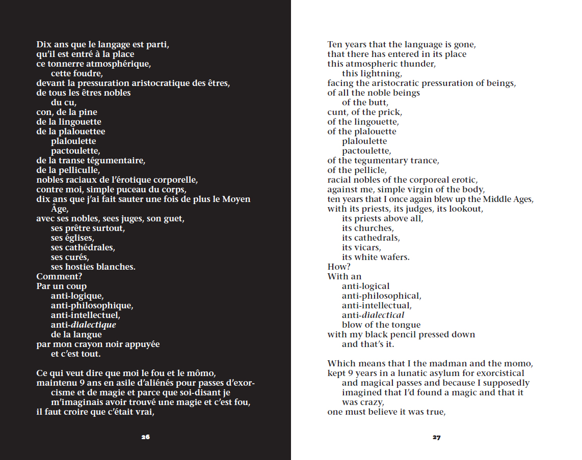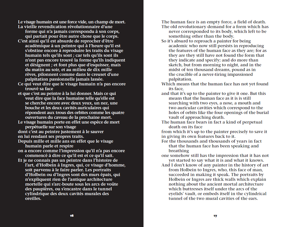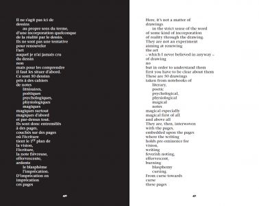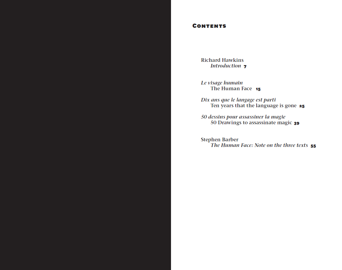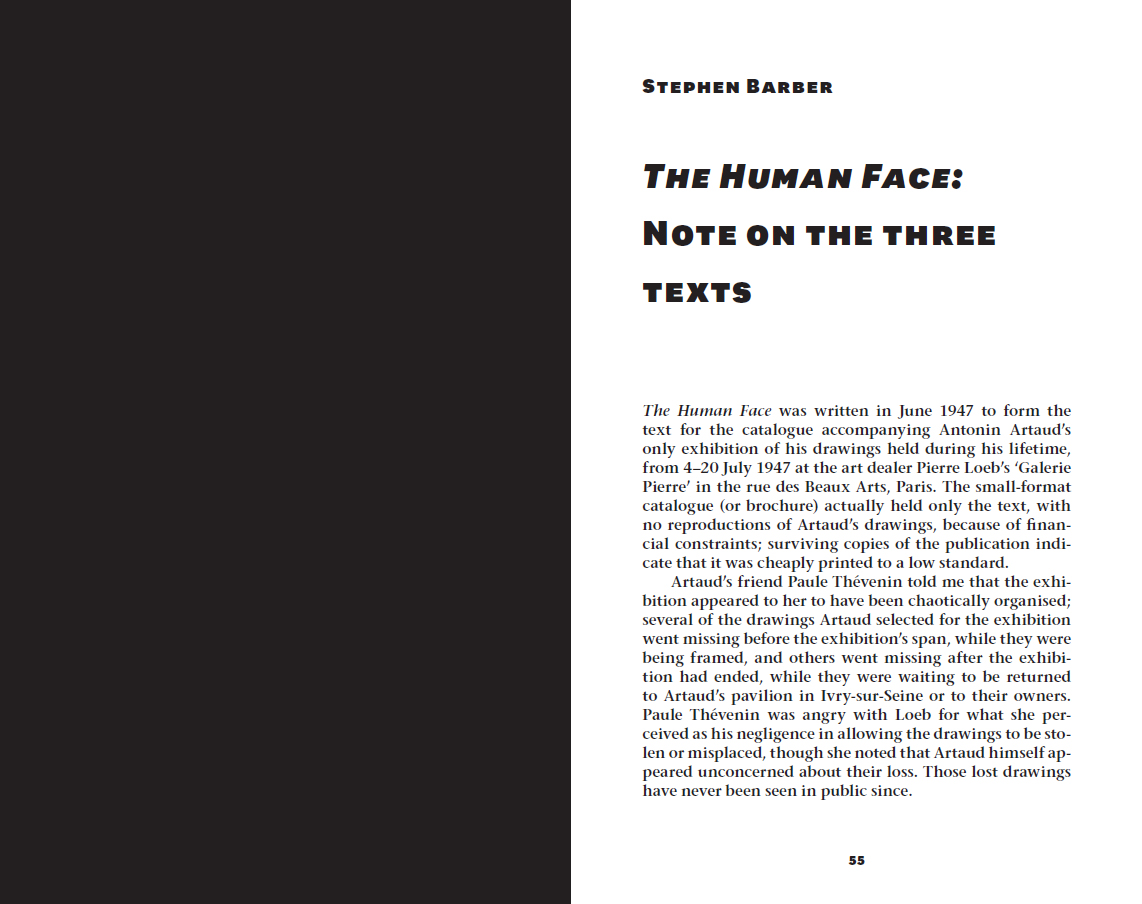 “The Human Face” (1947) was written as the catalogue text for Artaud's one and only gallery exhibition of his drawings during his lifetime, and focuses on his approach to making portraits of his friends at the decrepit pavilion in the Paris suburbs where he spent the final year of his life. “Ten years that language is gone” (1947) examines the drawings Artaud made in his notebooks—his main creative medium at the end of his life—and their capacity to spark his creativity when language failed him. “50 Drawings to assassinate magic” (1948), the residue of an abandoned book of Artaud's drawings, approaches the act of drawing as part of the weaponry deployed by Artaud at the very end of his life to combat malevolent assaults and attempted acts of assassination. Together these three extraordinary texts—pitched between writing and image—project Artaud's ferocious engagement with the act of drawing.