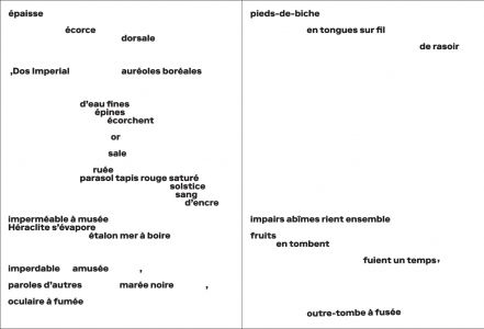 Dos Imperial gives a glimpse of the exotic and the unexpected, while revealing the banality of travel and its images. The narrative expressed through images and words, their repetitions and superpowers as well as their voids, reveals as much as it retains, assuming a fragmentary character that tends towards the dreamlike and hallucinatory. The white spaces between the images or within the photographs themselves, the text consisting almost entirely of isolated words, the recurrence of similar images, prevent a linear reading as well as a precise recollection of the images, reminding us of the fleeting nature of the lived experience and the imprecision of its recollection, as well as the impossibility of adequately transmitting a personal lived experience.