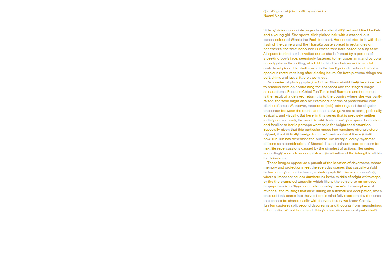 A photographic journey of rediscovery of the native country, in search of the familiar in the "exotic", childhood memories resituated in the present of a Burma that has started to open up again, questionning the Western visual understanding of the region.