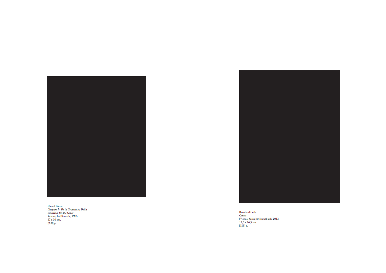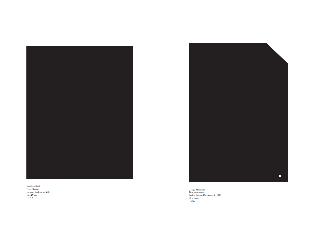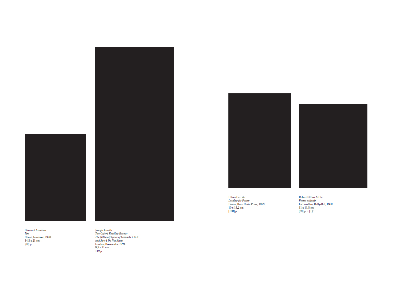 In line with "A Night Visit To The National Gallery", a book by Endre Tót, "A night visit to the library" shows only the silhouette of some of the author's favorite artists' books. The work proposes different readings based upon the selection of titles, on the relationship between the shapes and their corresponding captions.