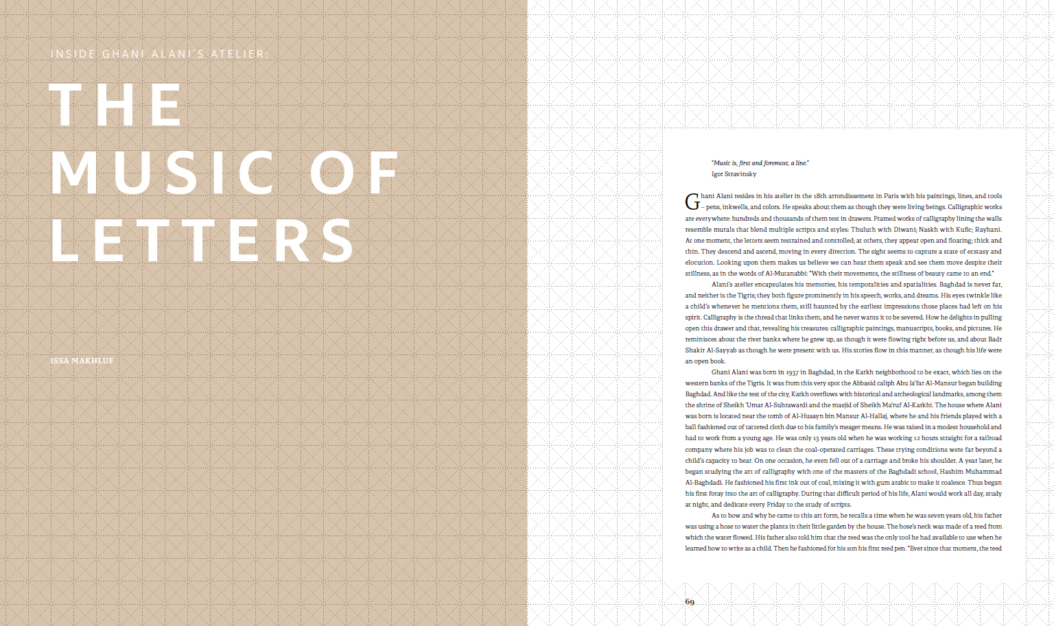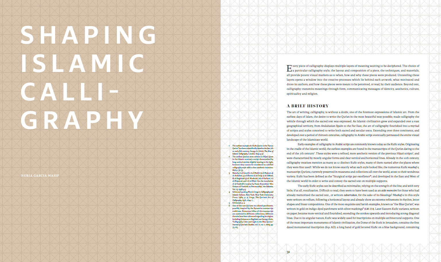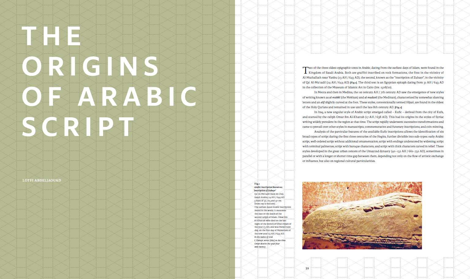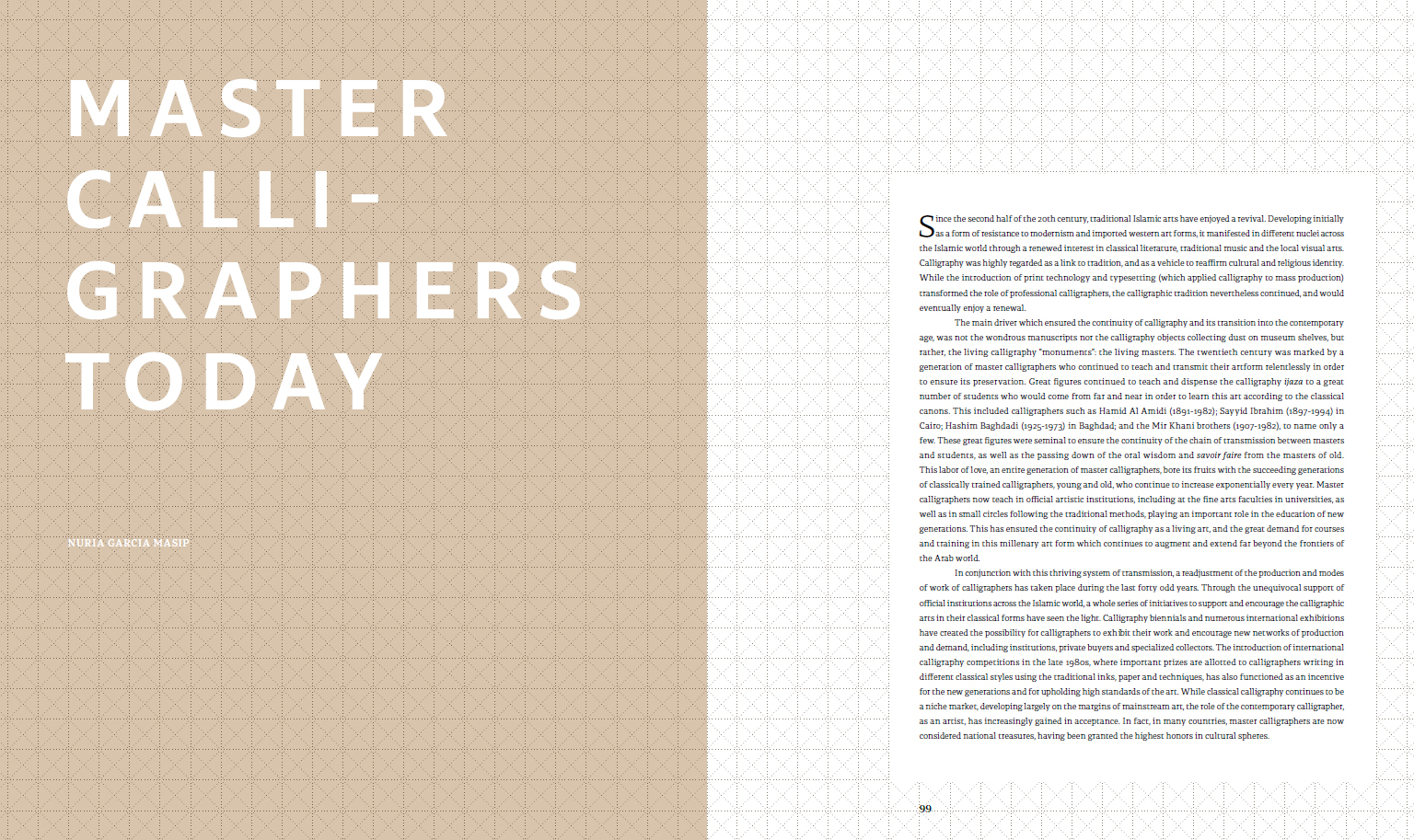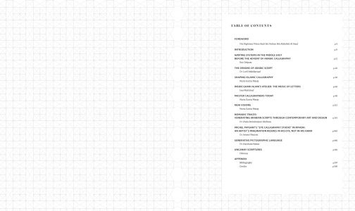 includes contributions by Lotfi Abdeljaouad (Head of research at the National Heritage Institute, Tunis), Eric Delpont (Islamic Art specialist and Director of the Museum of the Arab World Institute, Paris), Nuria Garcia Masip (classically trained calligrapher), Issa Makhlouf (writer and poet), Huda Smitshuijzen AbiFares (Founder and Director of the Khatt Foundation), and Jerome Neutres (Chief curator of the Guy & Myriam Ullens Foundation, Switzerland).