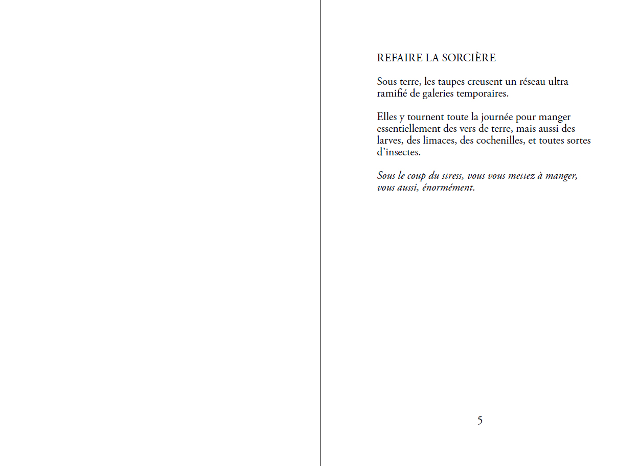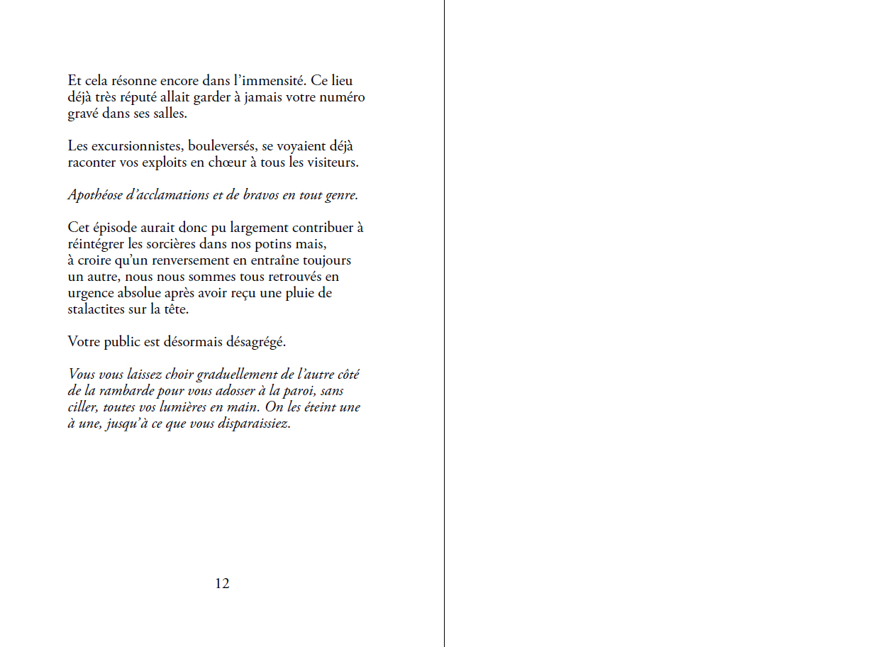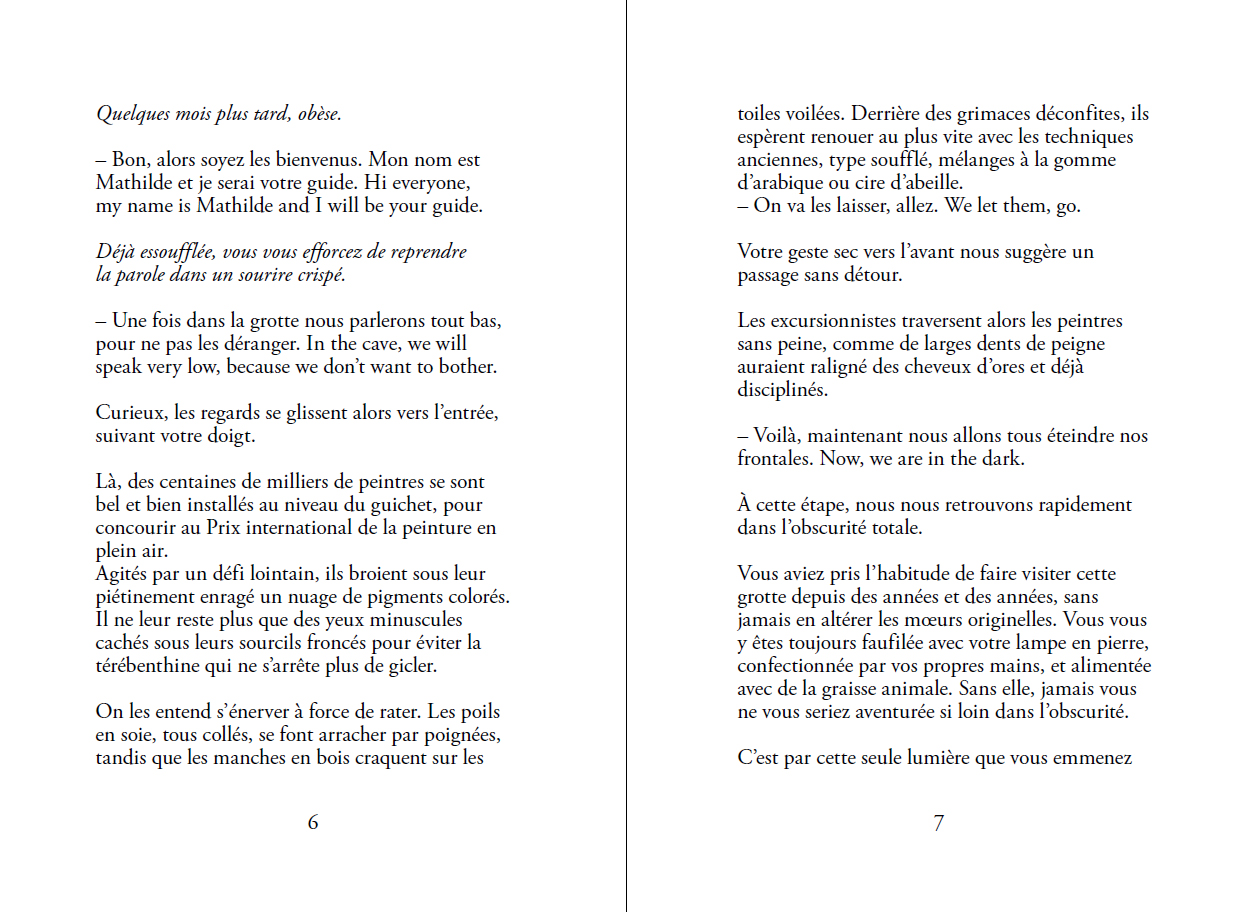 Mathilde Ganancia's writing only lets through a few rare clues to her artistic practice that are even so hard to spot - except that they outline a social, light-hearted fantasy phantasmagoria, a vaguely feminist but frankly grungy utopia, fierce and with no way out. Somewhere between Céline Minard and Alphonse Allais, the author draws the trajectories of improbable but sophisticated heroines from a so unusual imaginary world. Her short stories are little jewels of unlikelihood that nevertheless form delightful itineraries, leading to comical situations where the unbelievable eventually takes over, against all logic. With a polished language and a distinguished vocabulary that uses just the right amount of Frenglish words to echo the times, her little embedded and gently grating tales mock rather than condemn alternative practices to the establishment, like allopathic medicine—rather outdated by its need to be "in vogue"—, or space youtubers caught in their own trap of fame, a jubilant parallel with our media superheroes, when it's not about making out of the glasses revolution the prism of a desperately doomed social climb.