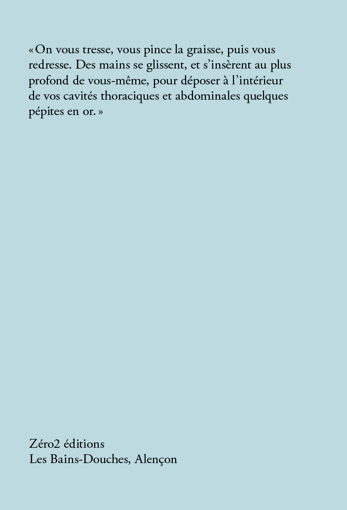 artists' writings, co-produced and co-published by Zéro2 éditions and the Bains-Douches Art Centre at Alençon. Starting from the observation that more and more artists are producing poetic and fictional texts, these two organizations have joined together to offer young artists a chance to be published. The design is by Sunny-side-up: these two Brussels-based graphic designers have created a minimal and elegant format combining an embossed title on a steel-blue cover.