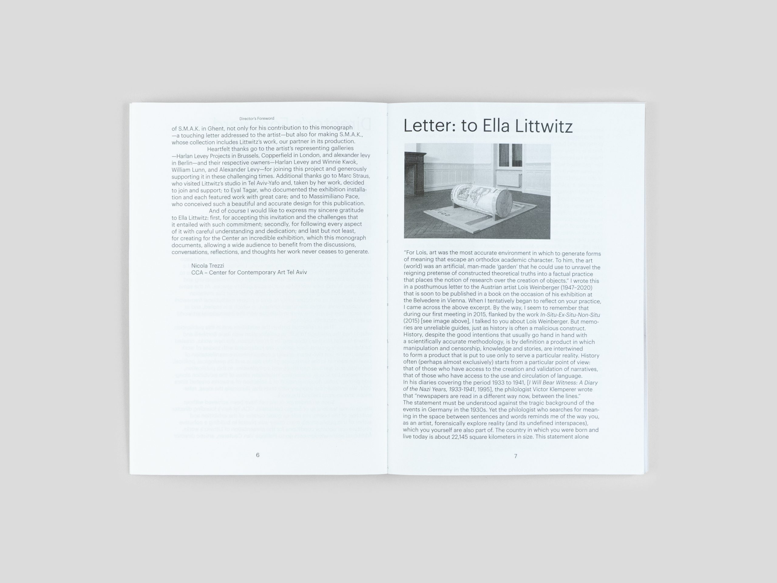 Israel) investigates political, social, and cultural landscapes by appropriating and shifting specific elements connected to the land. Pivotal to her practice the constant desire of humans to create sovereign ideologies by drawing limits, borders, and frontiers, sometimes even controlling nature and moving soil. Littwitz's interest in a specific stretch of land—namely Israel and Palestinian territories—stems from its status as a crossroads of religions, geography, and politics; water, soil, and sky; mythologies, beliefs, and momentous transitions. Littwitz's works echo its biblical and modern narratives, presenting us with diverse examples of transition, transfiguration, and the formation of political constructs through acts of belief. In her cosmos, the field of action comprises both the artistic objects she presents to us and their non-presence in their original sites. Trail markers removed from a path, tin triangles that indicated minefields, floaters that once marked the border between Jordan and Israel, barrels that delineated military firing ranges, and books that once had a place on people's shelves are all elements intended to trigger personal and collective memories, and thereby probe received assumptions and beliefs.