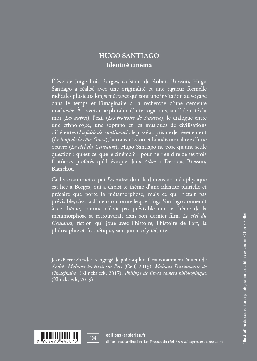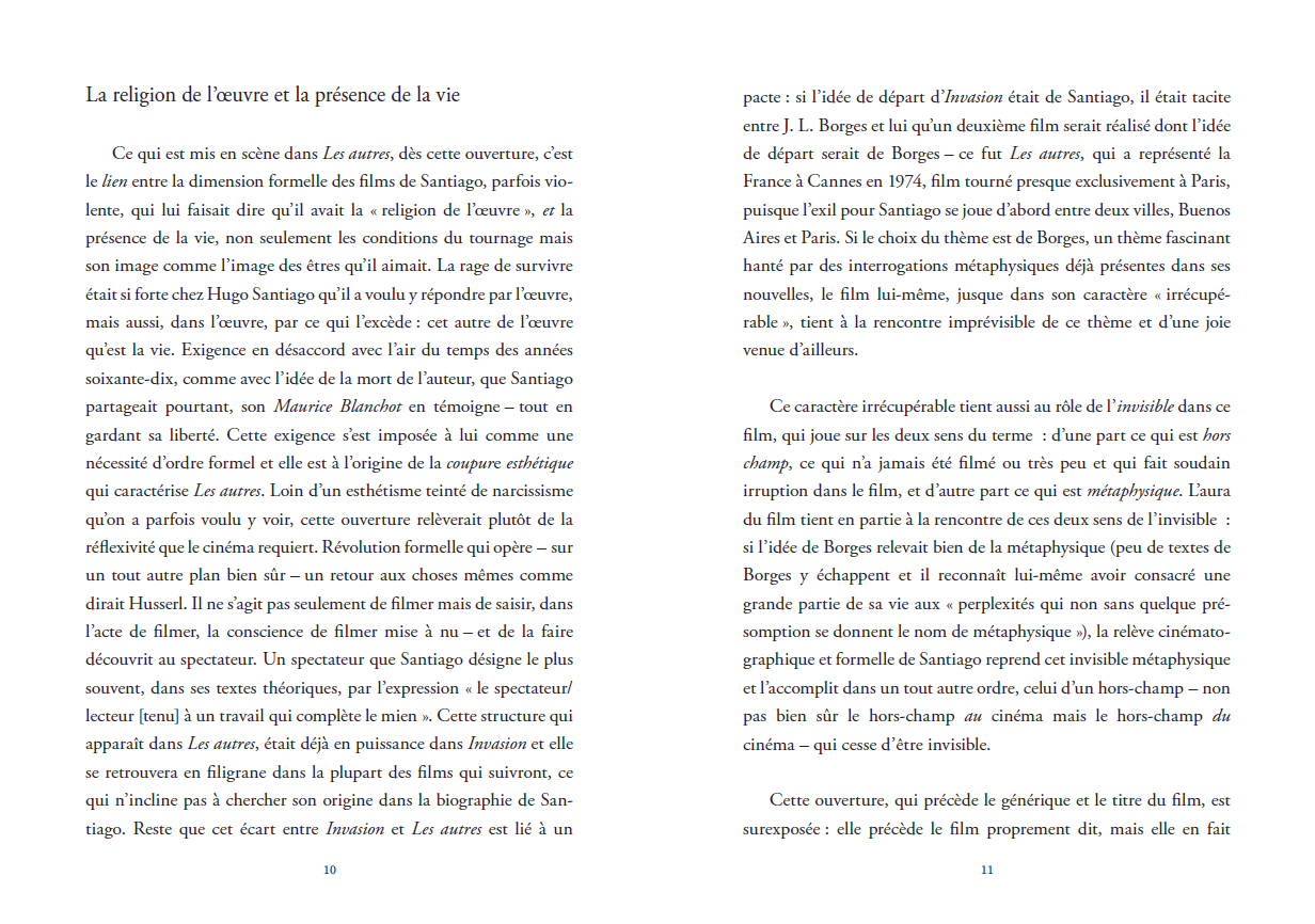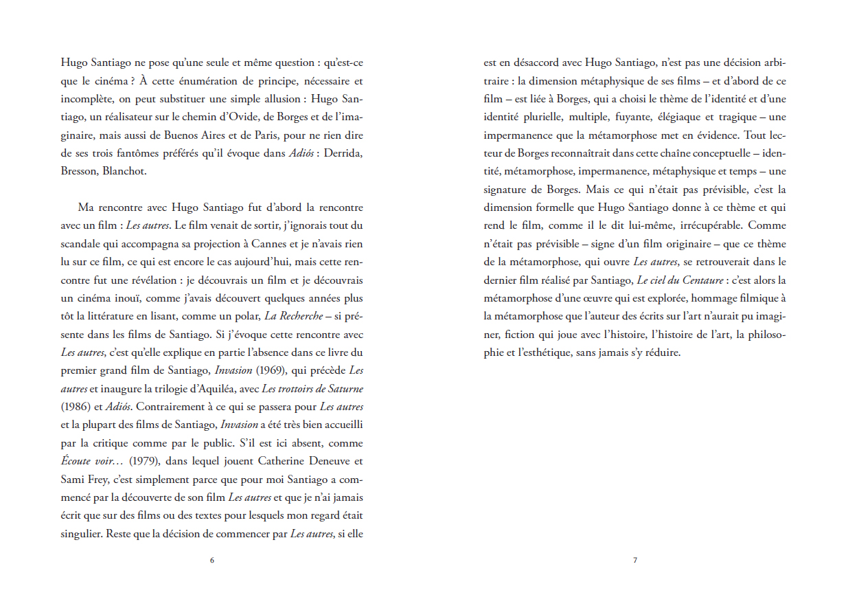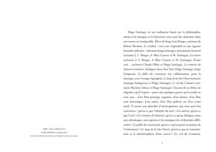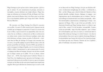A pupil of Jorge Luis Borges, assistant to Robert Bresson, Hugo Santiago is a director inhabited by history, by exile, and first of all by cinema, by cinema itself. His films are a journey through time and the imagination, to the frontier of philosophy. Through a plurality of questions, on the identity of the self (