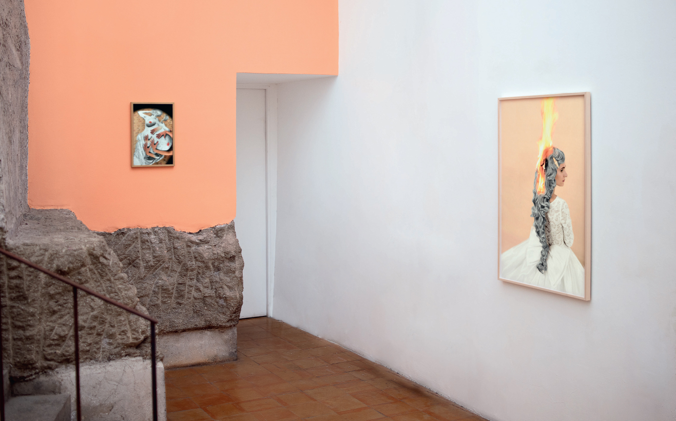 From the first historical pieces (1993-1998), to the very recent series of fairy brides (Les humeurs des fées, 2020-21), including works dedicated to the Brazilian actress Carmen Miranda, a legendary figure of Hollywood cinema in the 1940s, representations of the feminine inhabit the exhibition, often disturbing, always ambiguous. Through interventions on distinctive identity markers, hair and clothing envelopes, vehicles and symbols of the masquerades of femininity, through the exploration of dedicated roles and normative models—bride, mother, princess, actress, dancer, etc.—by the subversion of the injunctions to beauty, youth or thinness, Natacha Lesueur seeks to reveal, not without humor, the manifestations of the expression of a social and cultural constraint. Stuffy hairstyles, accessorized hair, XXL makeup and food postiches are all recurring enigmas in the tableaux-recits.