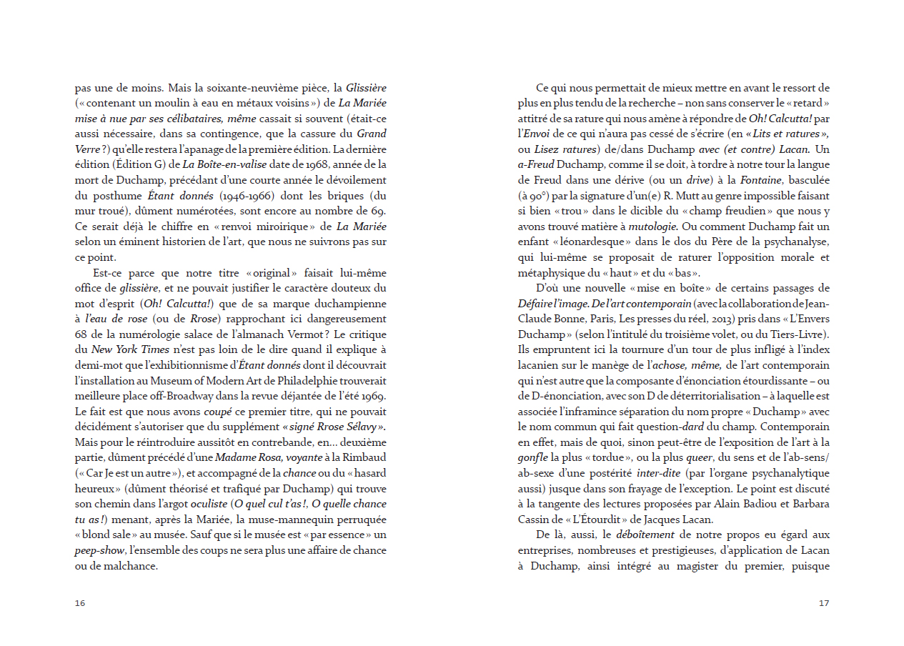 Marcel Duchamp's legacy in relation to contemporary art and the image, psychoanalysis and gender: pursuing Duchamp's love of wordplay and tracks his transformation into Rrose Sélavy, revelling in contradiction, unmaking sense and disrupting gender and genre, Alliez's "essay in mutology" gives us a queer Duchamp who defies all (psycho)analysis.