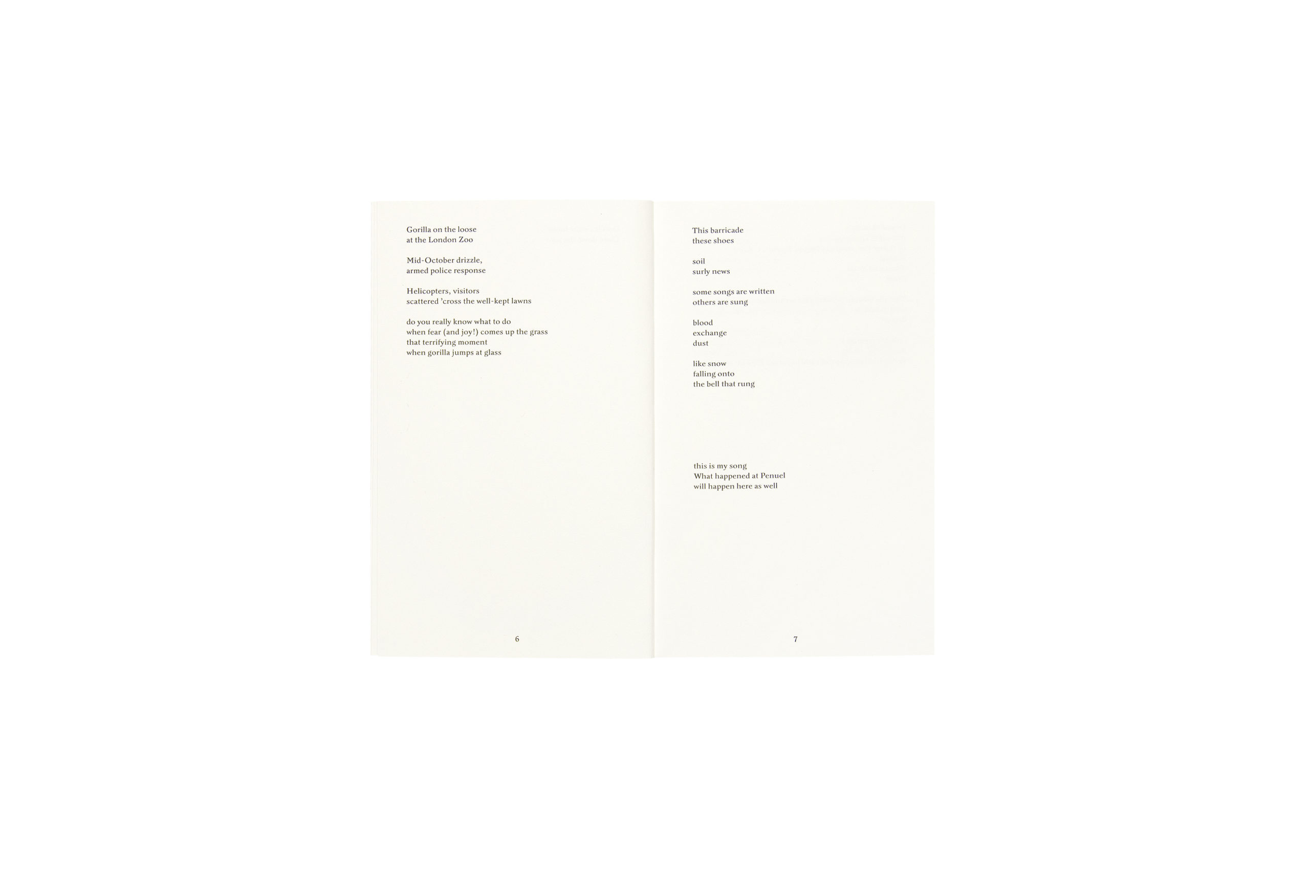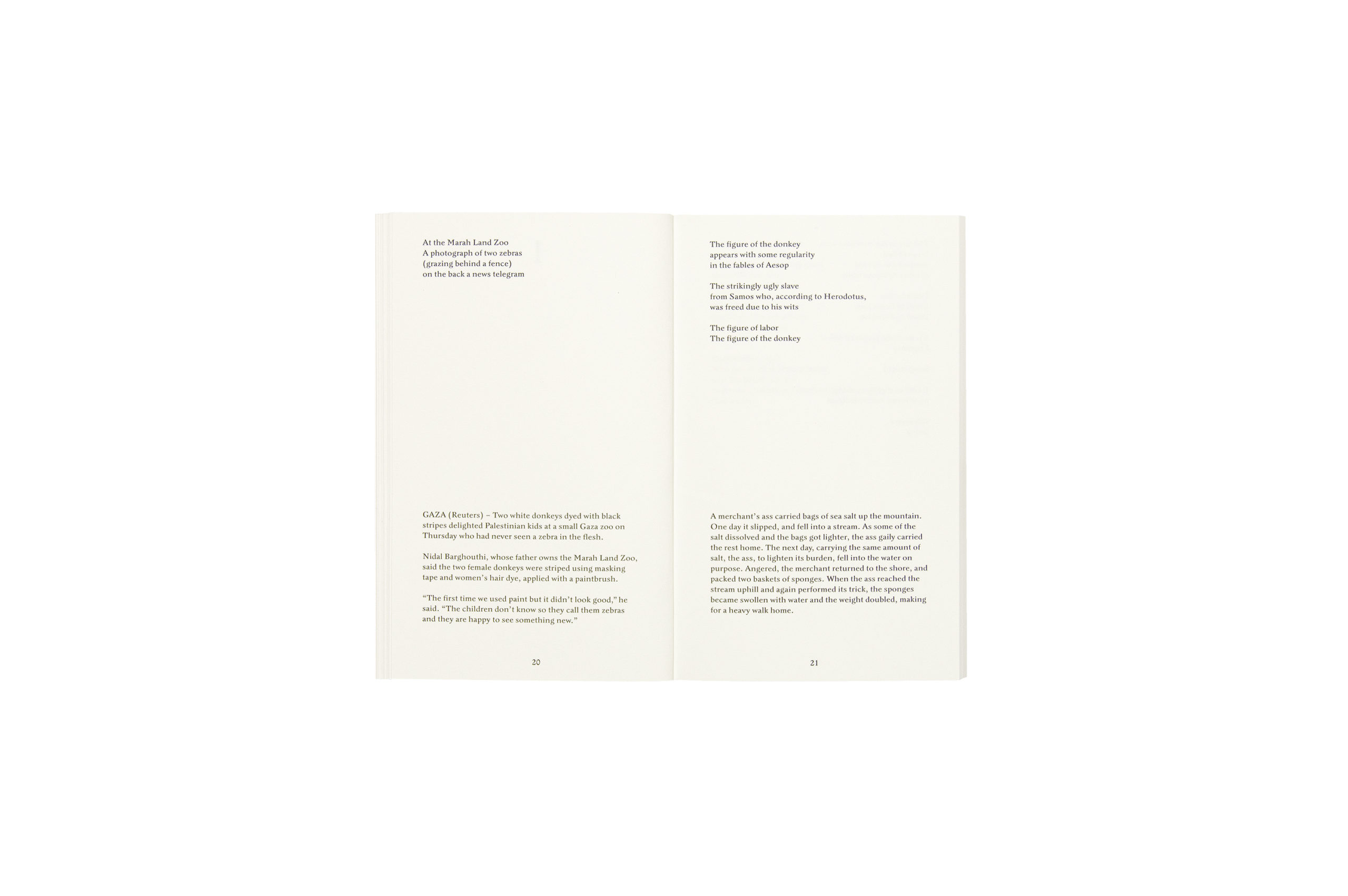 Poems and Parables on the Political Utility of Art is a small book. It looks like poetry, but it is better described as a kind of criticism. Taking up some recent disqualifications of art's political potential, it refutes them in a threefold movement: against the notion of commodification of works of art; against the act of denouncing art as always-already reified from the safe position of a pure, untouched theory; against the notions that art must either reveal our alienation, or produce immediate effects on the social sphere. Outlining art's transformative possibilities in the figure of a certain labor, the argument is shaped among fables of donkeys, zebras from Gaza, apes from Adorno, and a particular barricade from the Paris Commune.