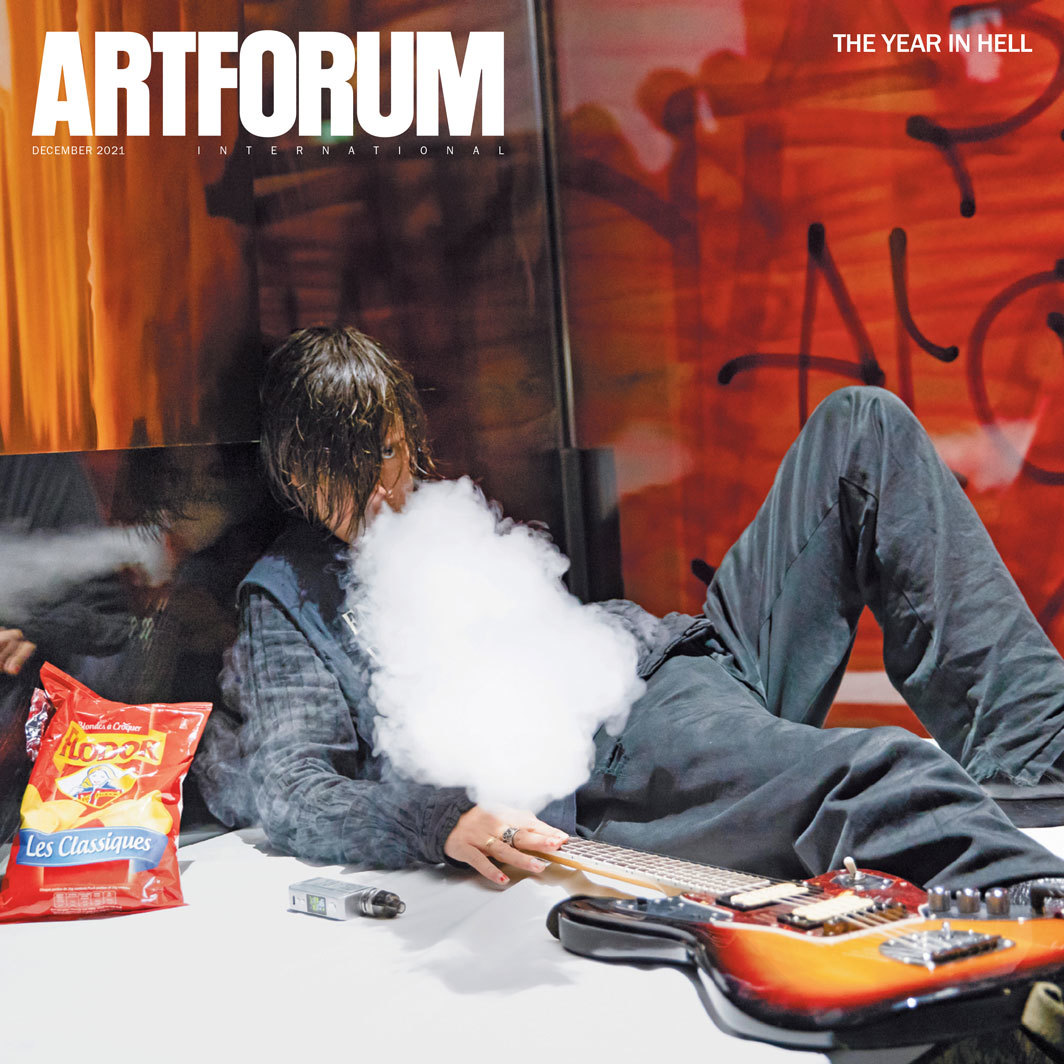 Hannah Baer and Monica Huerta on the Year in Hell; best of 2021: a renowned group of critics, artists, and curators from around the world—Lynne Cooke, Cecilia Alemani, David Joselit, Erin Christovale, Miguel A. López, Malik Gaines, Johanna Fateman, Amy Sillman, Jack Bankowsky, Darby English, Sky Hopinka, Caroline Busta and Lil Internet, Susanne Pfeffer, John Kelsey—take stock of the year in art; "Illiberal Arts" by David Joselit; Anne Imhof by Caroline Busta; five celebrated cineastes—John Waters, Amy Taubin, J. Hoberman, James Quandt, and Cassie da Costa—select the top films of the year; five musicians and critics—Alan Licht, JJJJJerome Ellis, Sasha Geffen, and Harmony Holiday—name their highlights of the year; nine writers, artists, scholars, and curators—Bruce Hainley, Joan Kee, Negar Azimi, Dennis Cooper, Molly Warnock, Dodie Bellamy, Colby Chamberlain, Thomas (T.) Jean Lax, Jackie Ess—choose the year's outstanding titles.