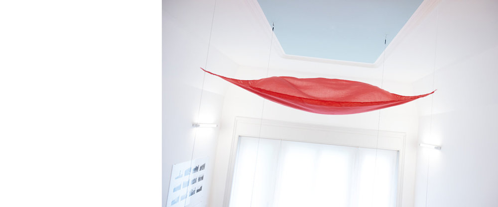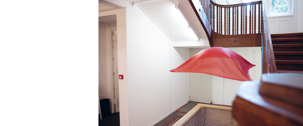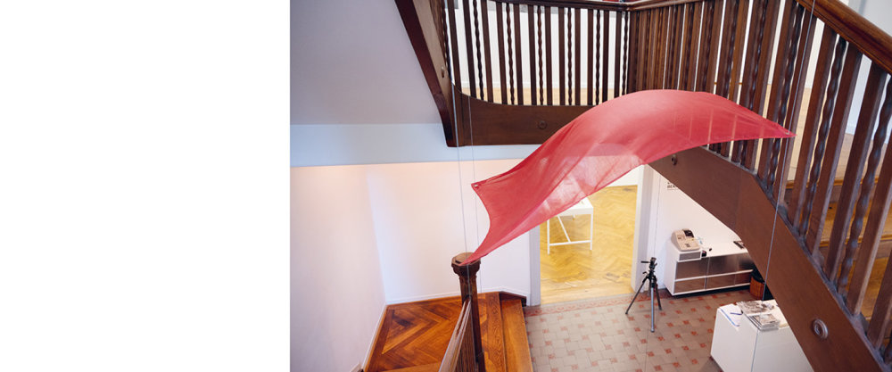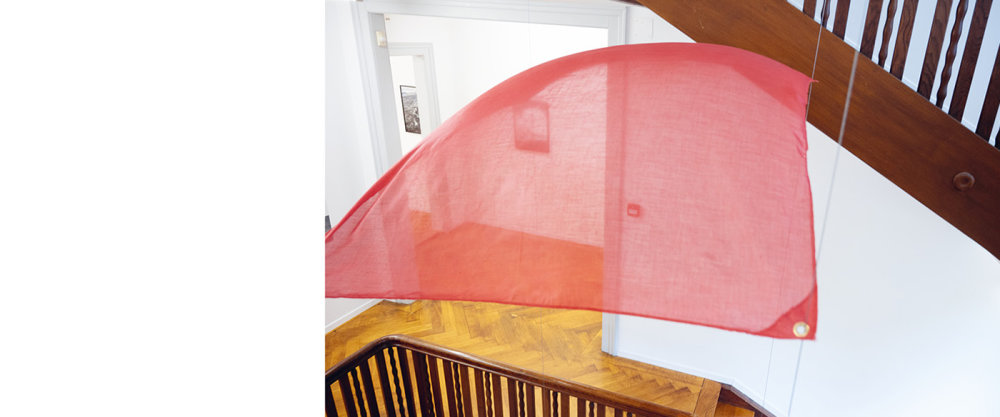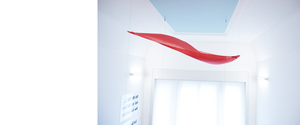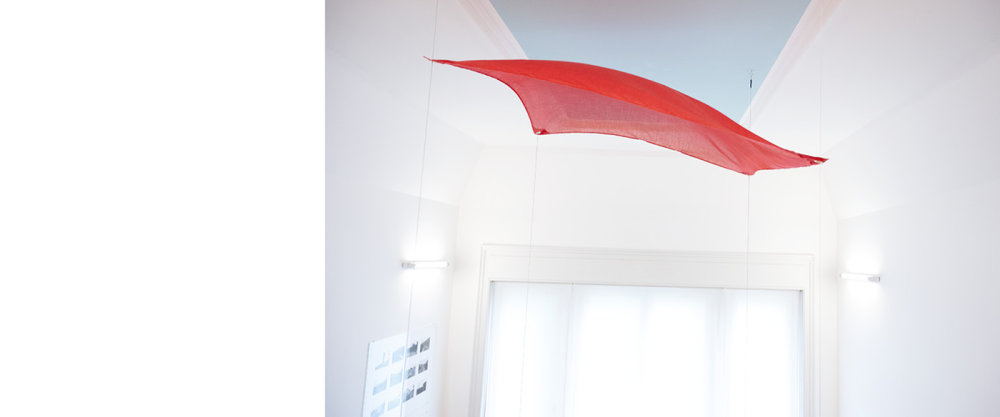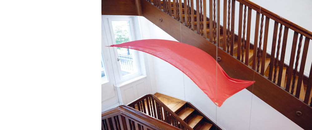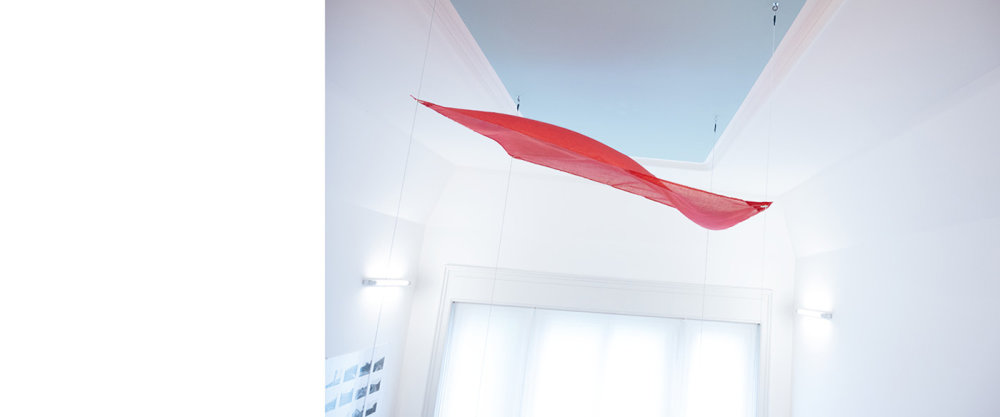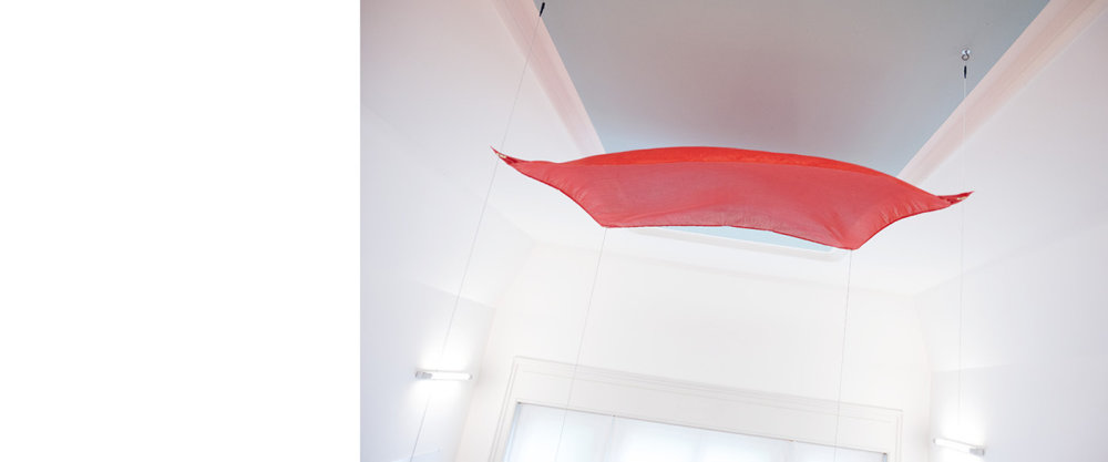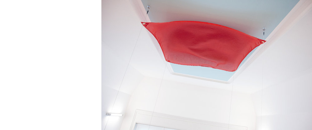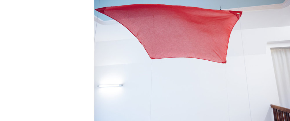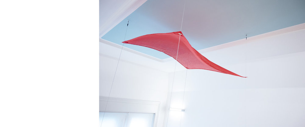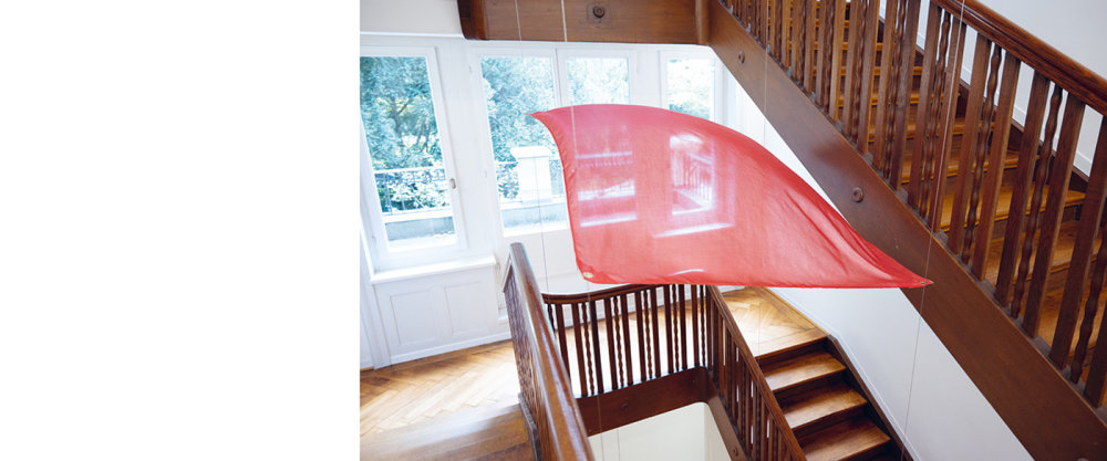 "A red flag was stuck soaking wet on a flagpole in Beijing. Back in Switzerland on August 1st, I saw a red flag that had become wet from the rain and was stuck to a flagpole. In both cases I only saw a red strip of cloth on a pole. I thought it can't be the color that annoys some people here in Switzerland. It's rather the shape of a flag. A red flag. In this installation a piece of cloth rises to the ceiling and then slowly floats back to the floor. The cloth has the shape of a square and is RED. For me, color is not political."