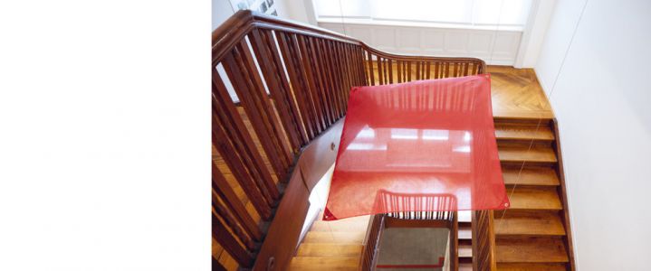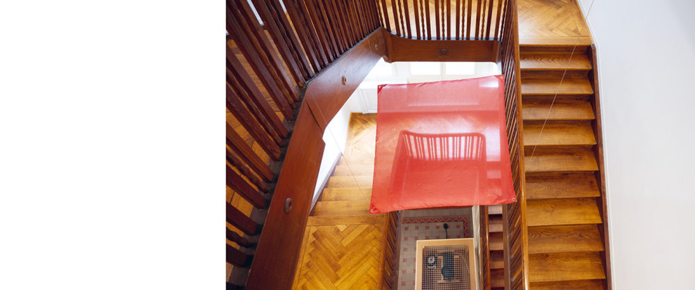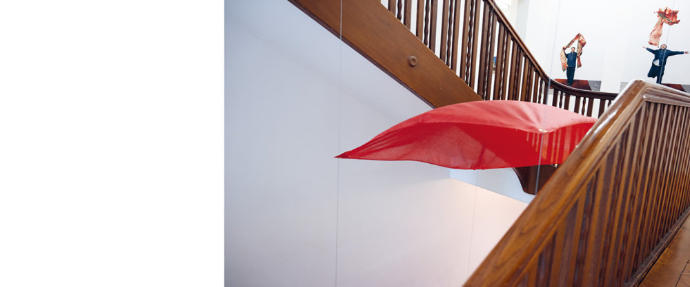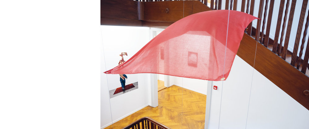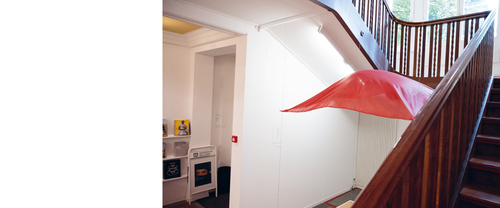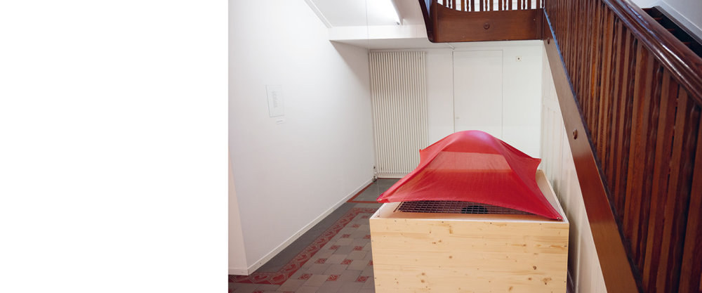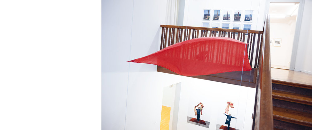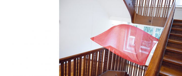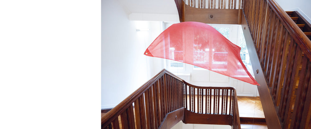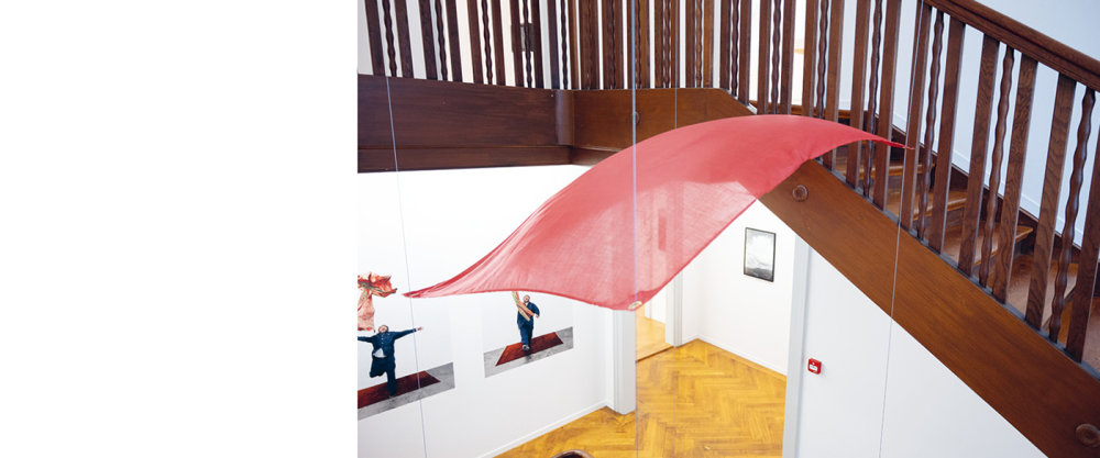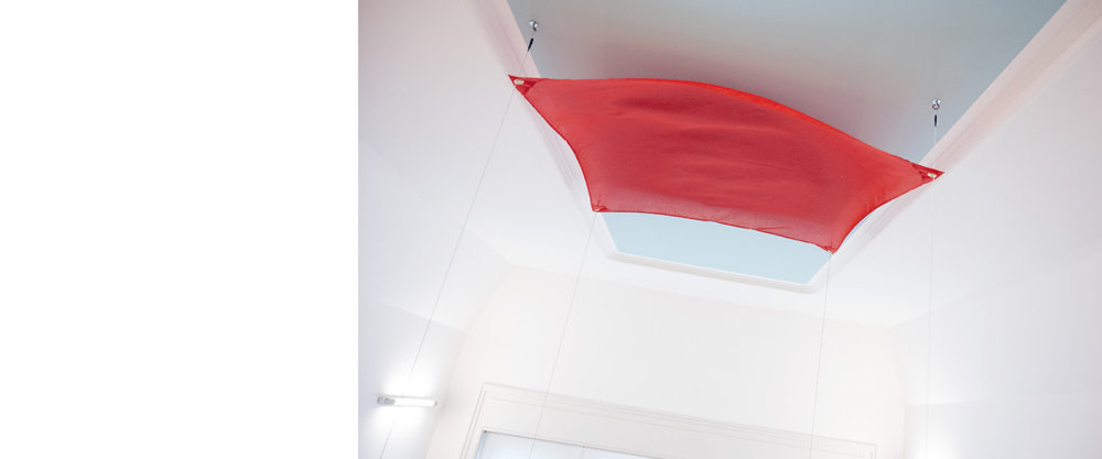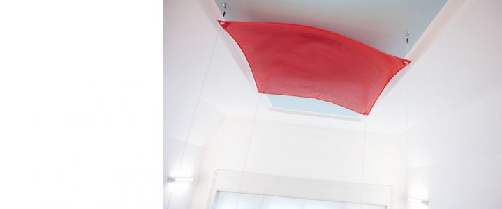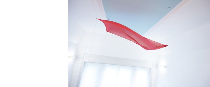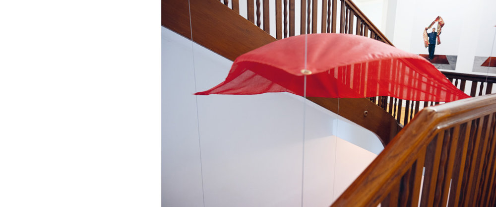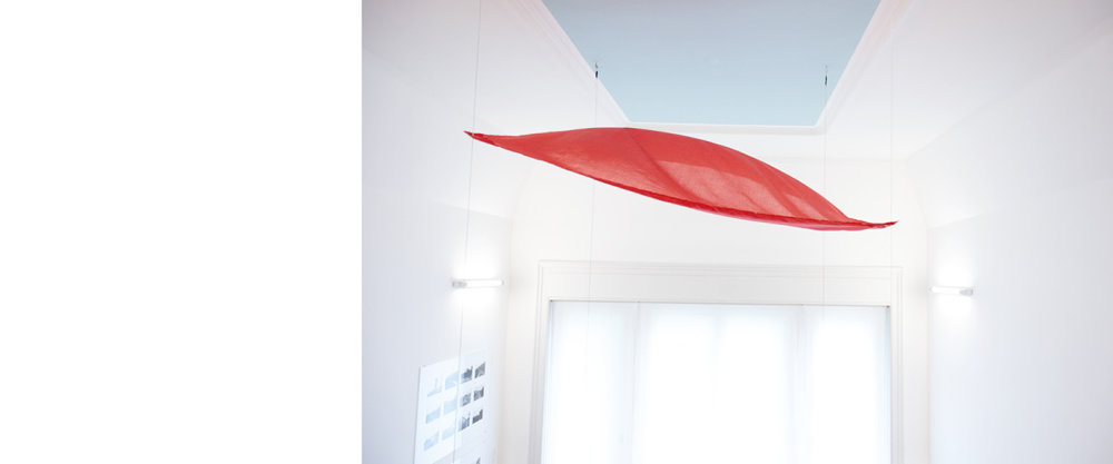 "A red flag was stuck soaking wet on a flagpole in Beijing. Back in Switzerland on August 1st, I saw a red flag that had become wet from the rain and was stuck to a flagpole. In both cases I only saw a red strip of cloth on a pole. I thought it can't be the color that annoys some people here in Switzerland. It's rather the shape of a flag. A red flag. In this installation a piece of cloth rises to the ceiling and then slowly floats back to the floor. The cloth has the shape of a square and is RED. For me, color is not political."