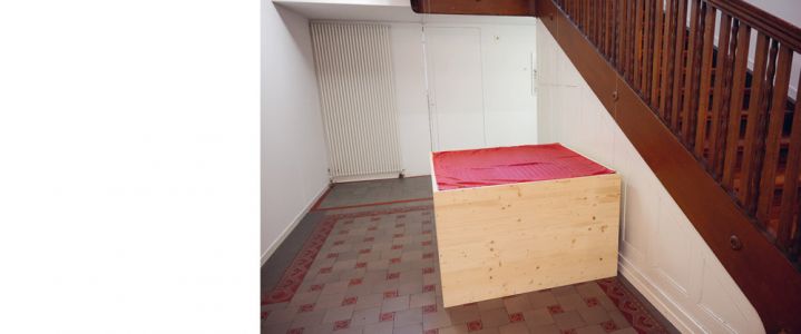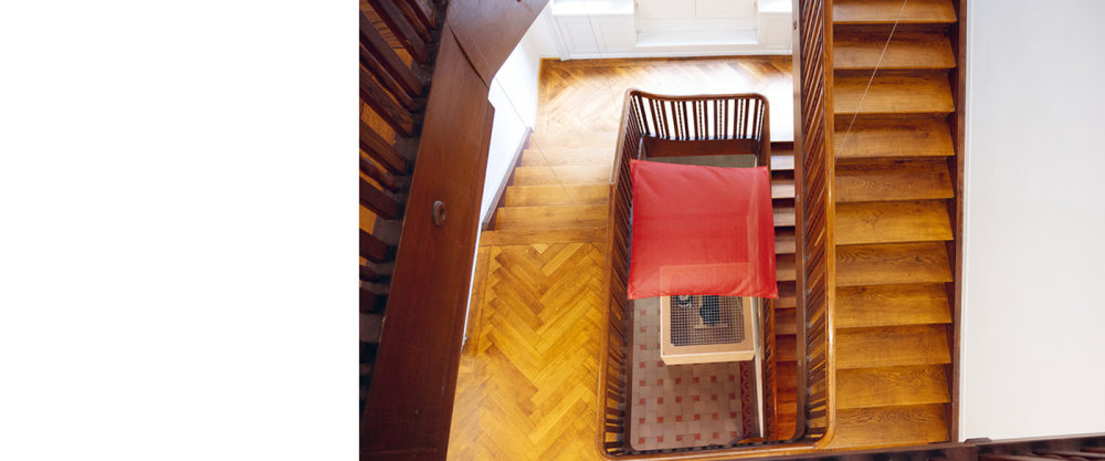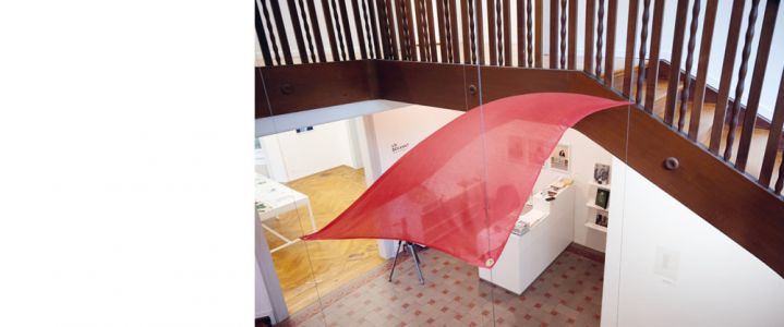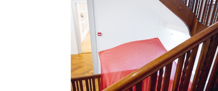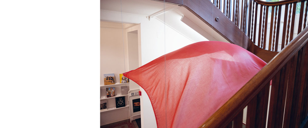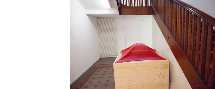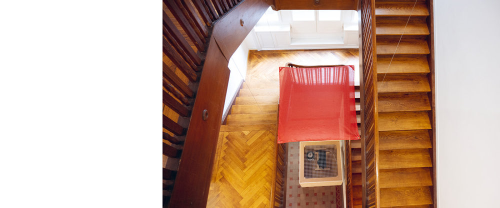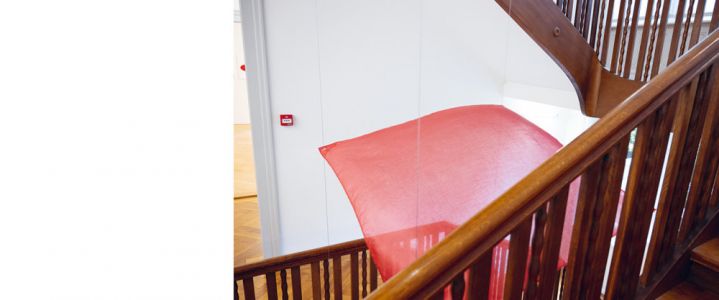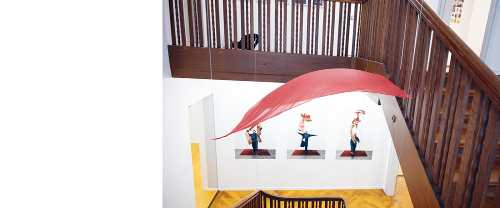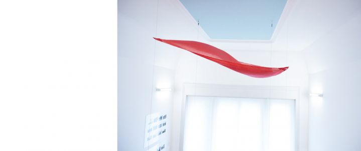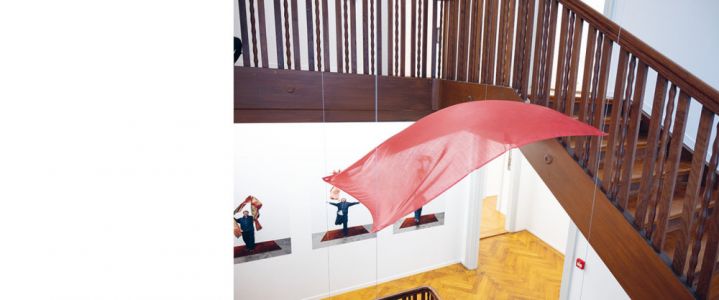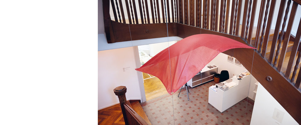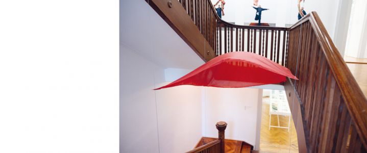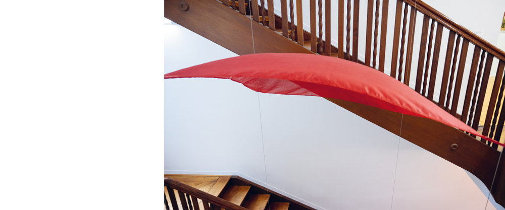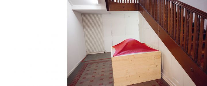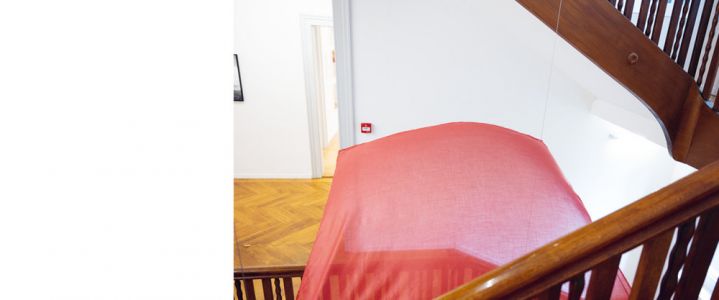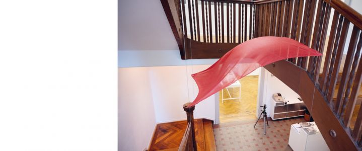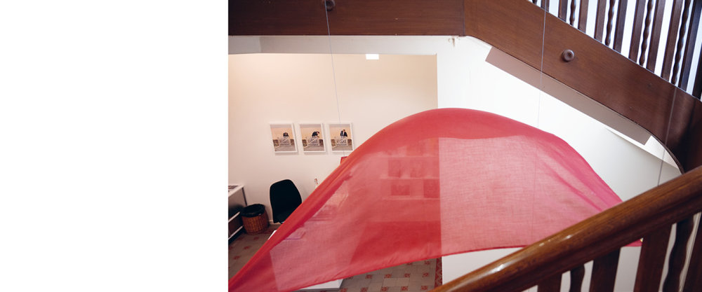 "A red flag was stuck soaking wet on a flagpole in Beijing. Back in Switzerland on August 1st, I saw a red flag that had become wet from the rain and was stuck to a flagpole. In both cases I only saw a red strip of cloth on a pole. I thought it can't be the color that annoys some people here in Switzerland. It's rather the shape of a flag. A red flag. In this installation a piece of cloth rises to the ceiling and then slowly floats back to the floor. The cloth has the shape of a square and is RED. For me, color is not political."