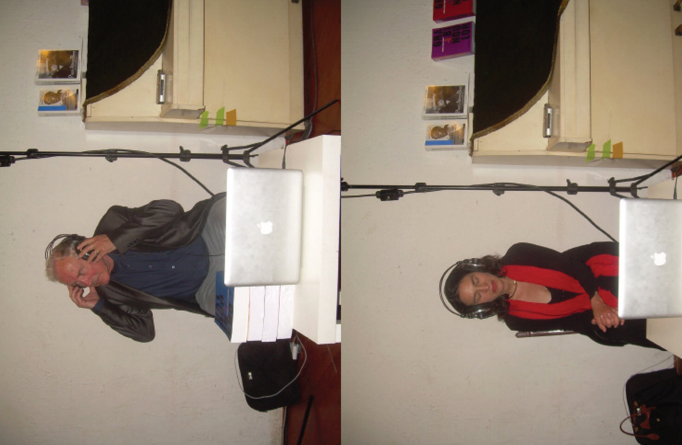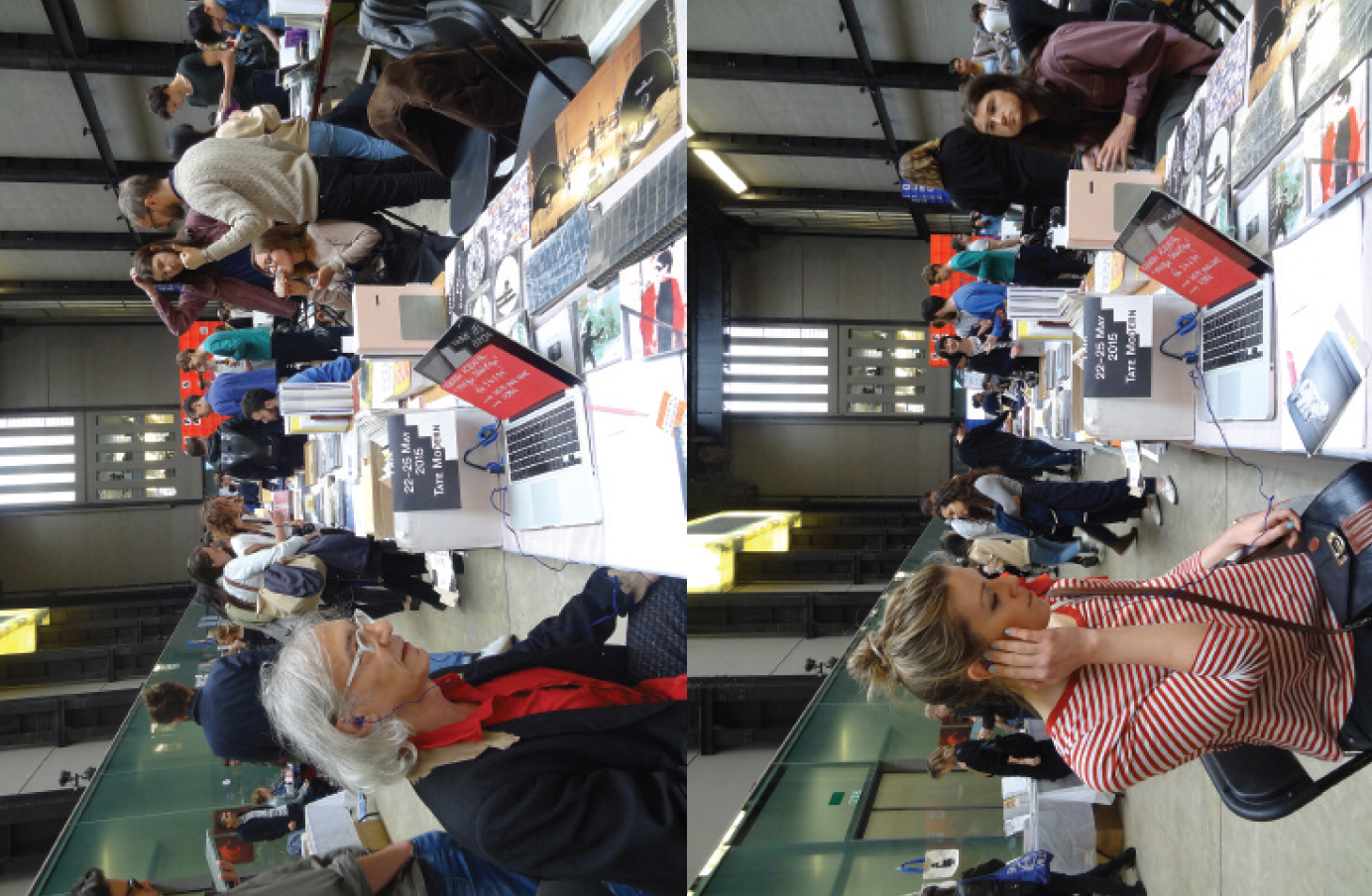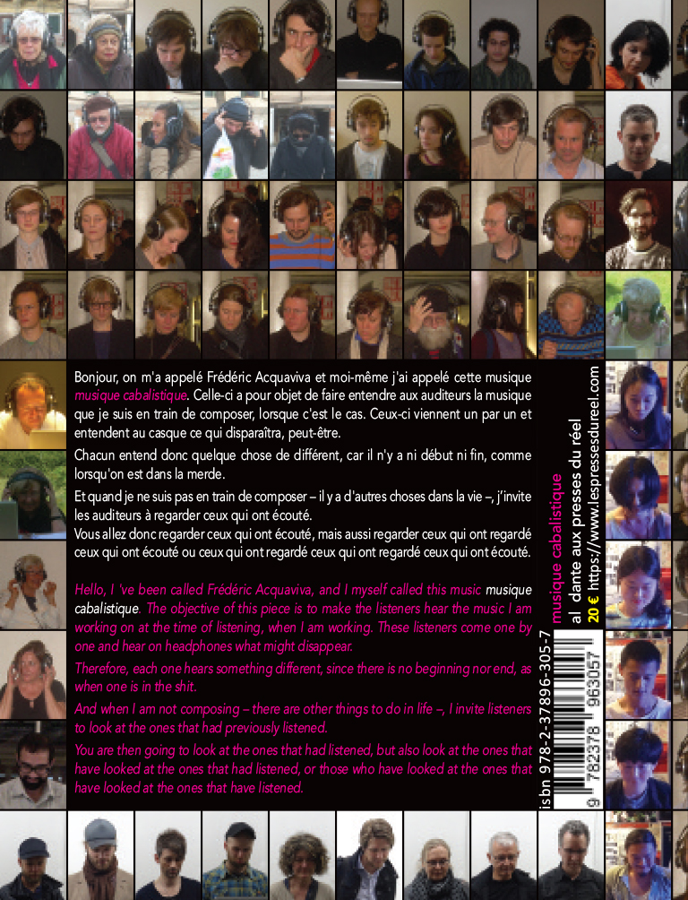 A gallery of portraits of people listening to a work by Frédéric Acquaviva in progress, laid out like a flip book.