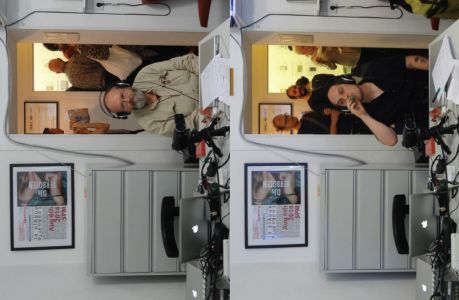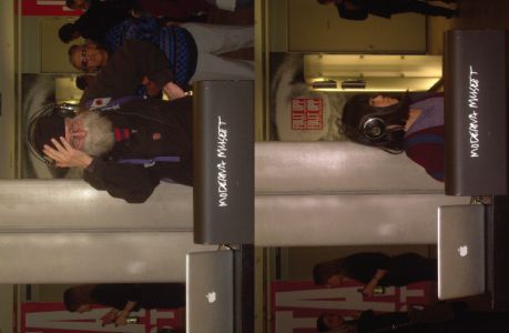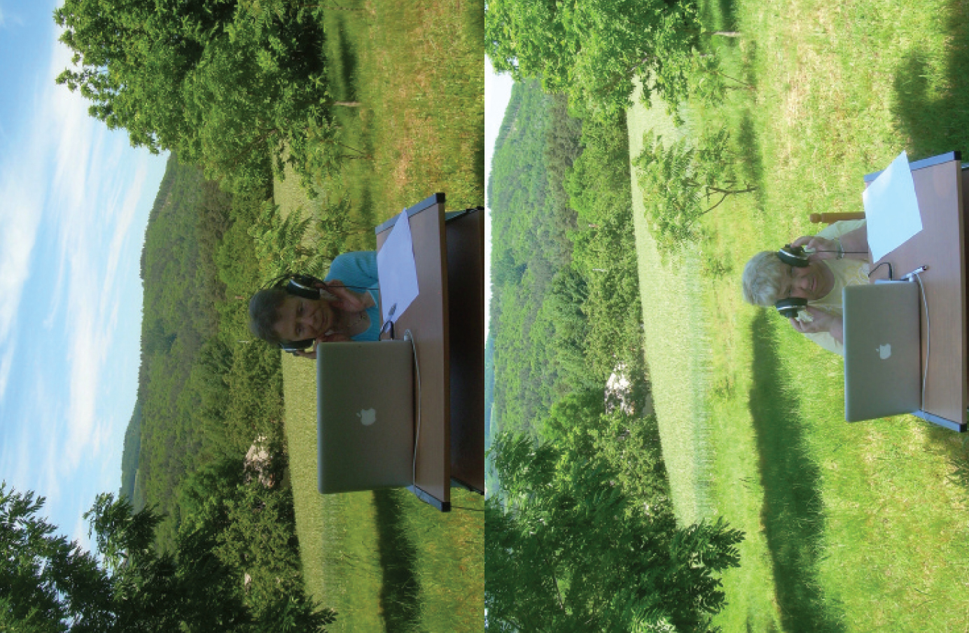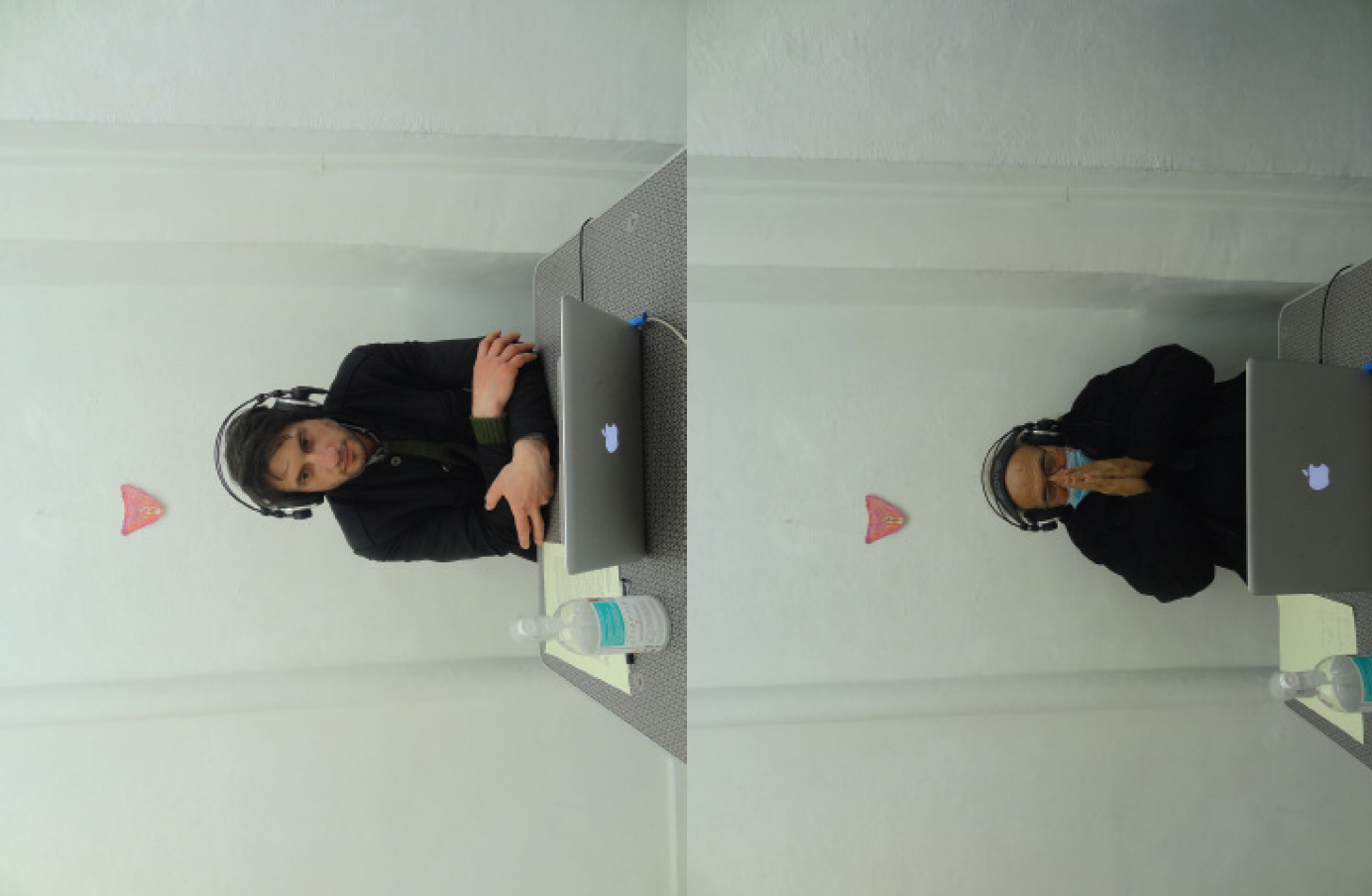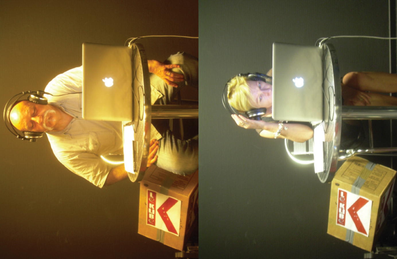 A gallery of portraits of people listening to a work by Frédéric Acquaviva in progress, laid out like a flip book.
