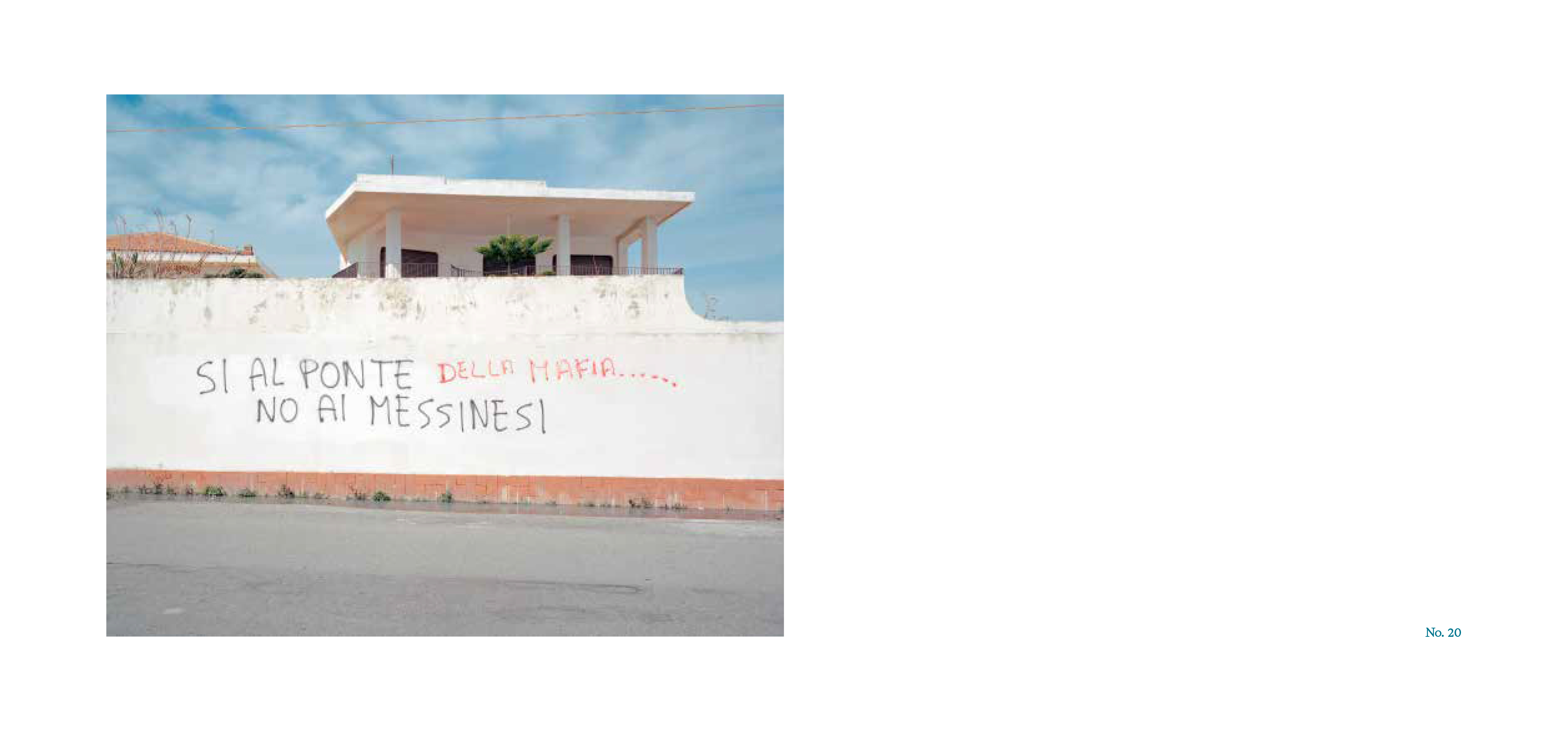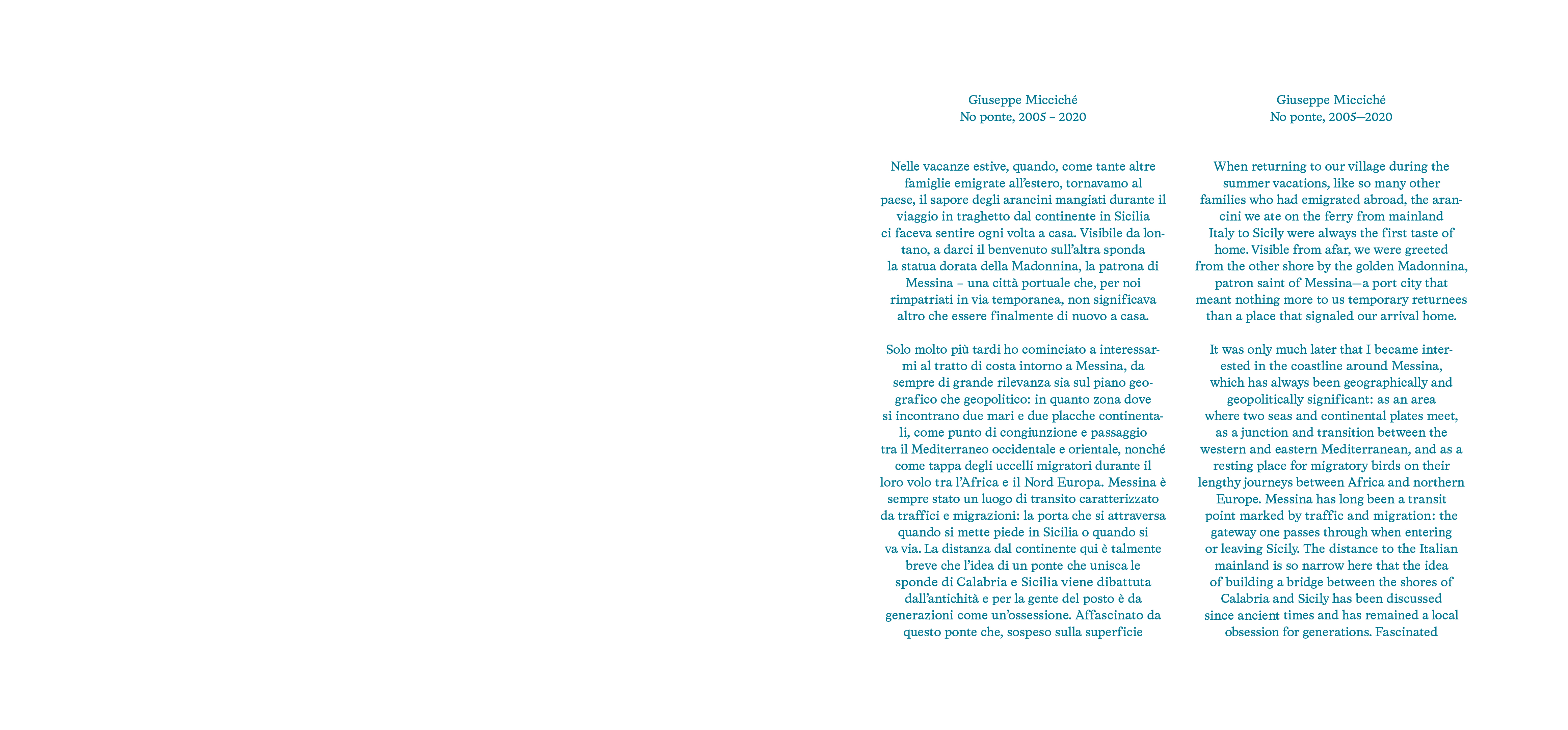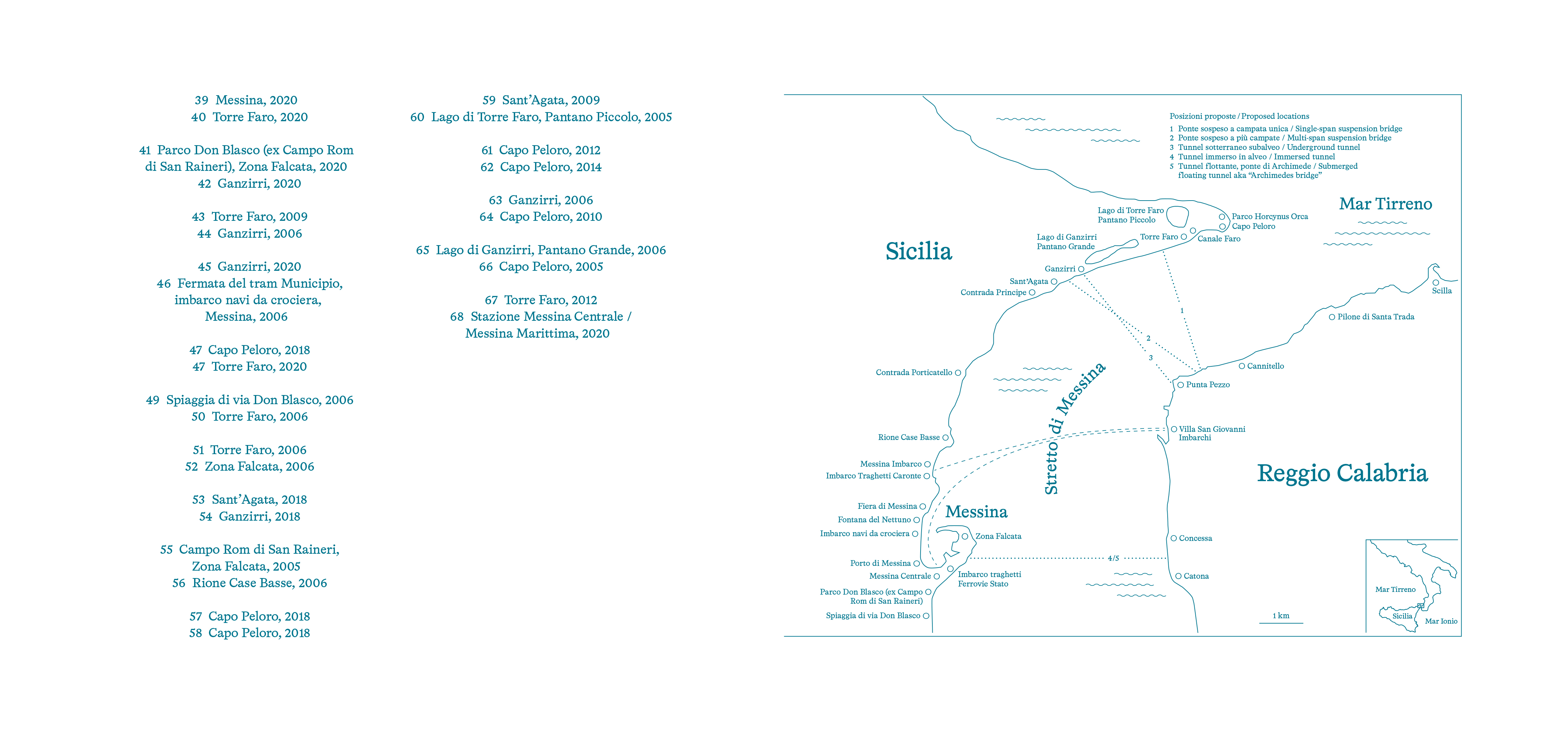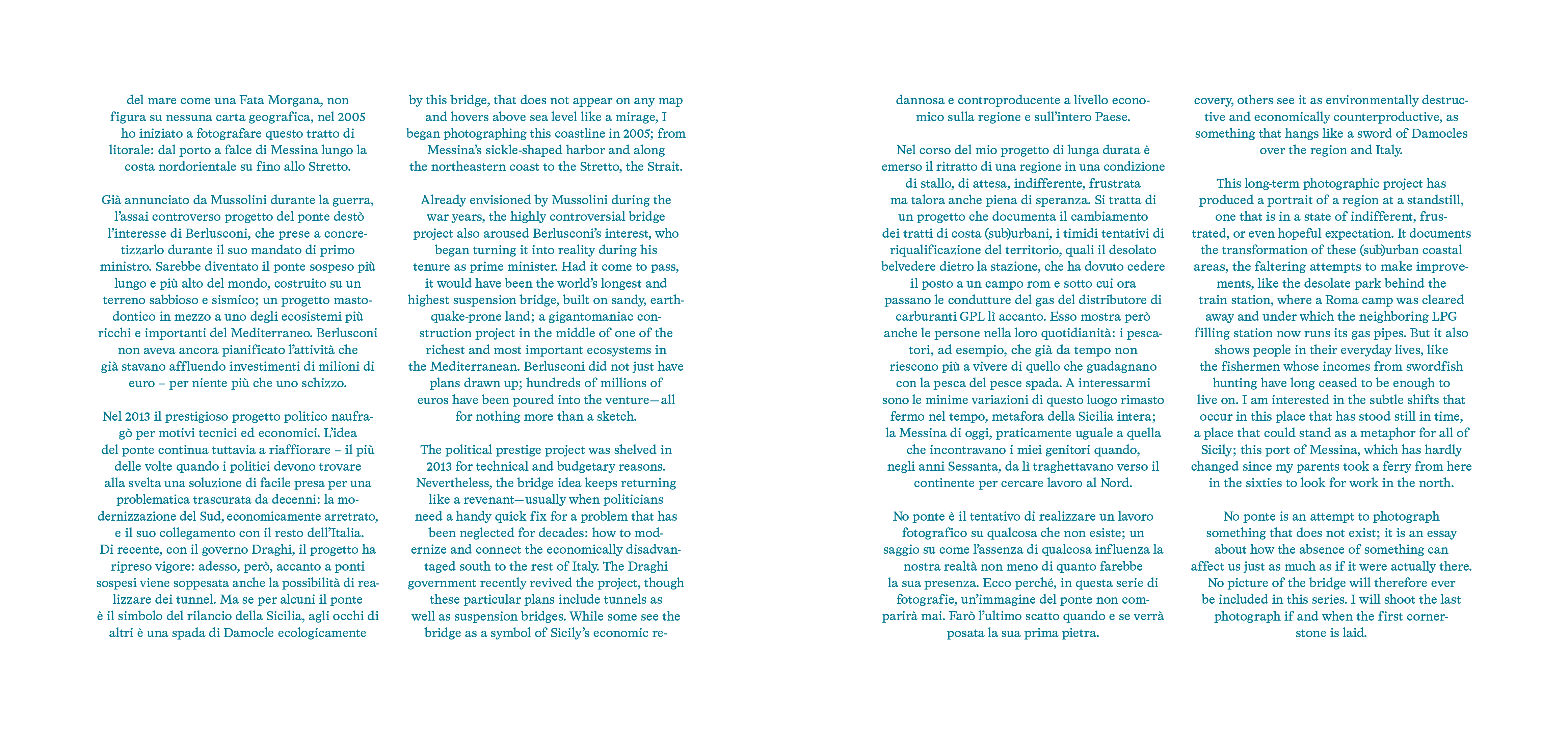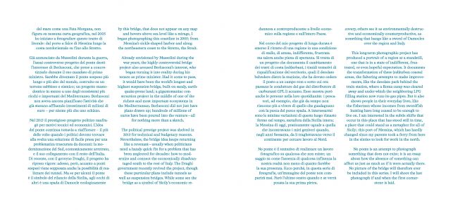 A photographic essay on the abandoned project of a suspension bridge between the Calabrian and Sicilian coasts and on the coastline of the Strait of Messina, documenting the transformation of suburban coastal areas and the daily life of the inhabitants.