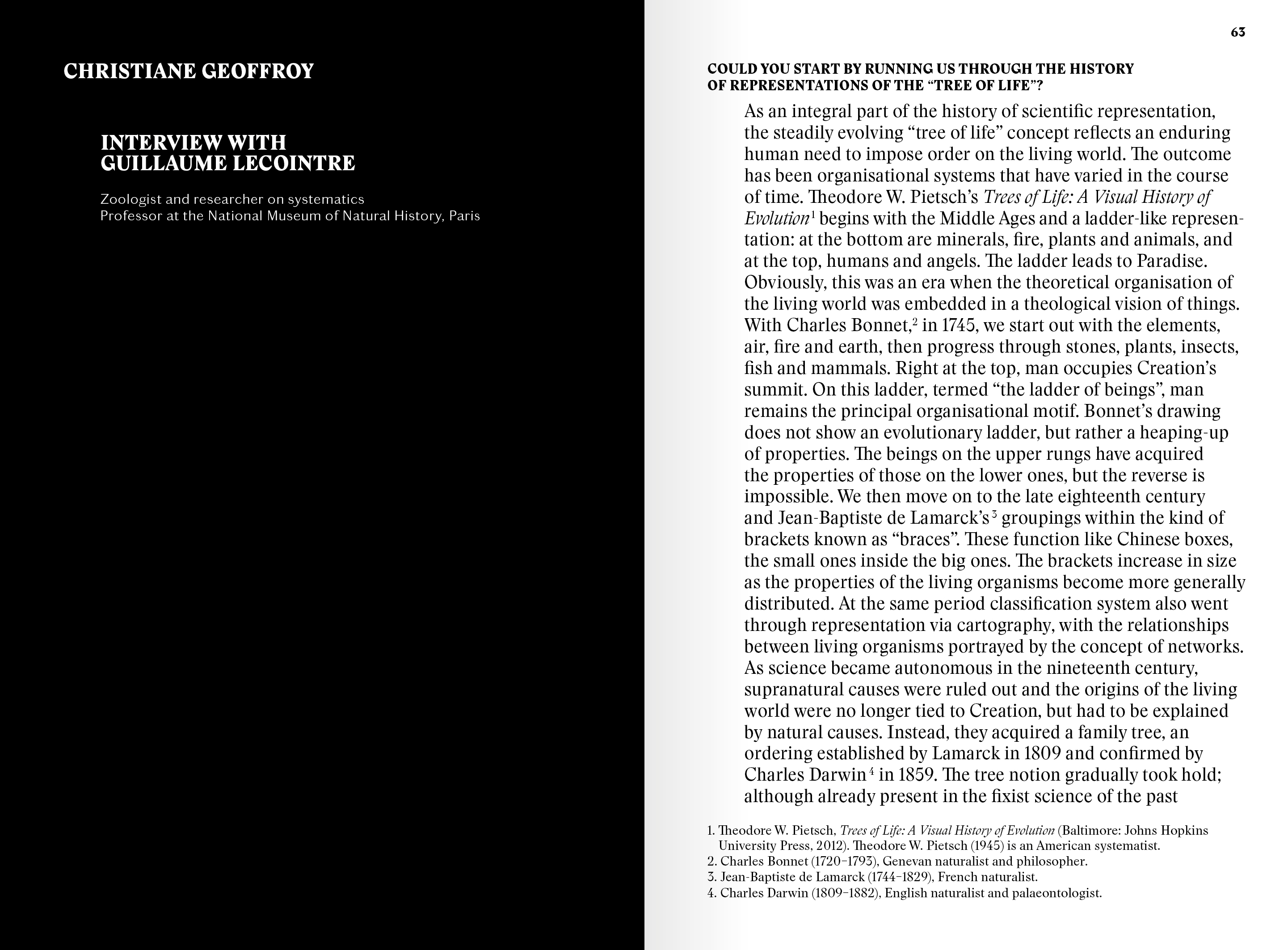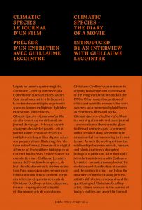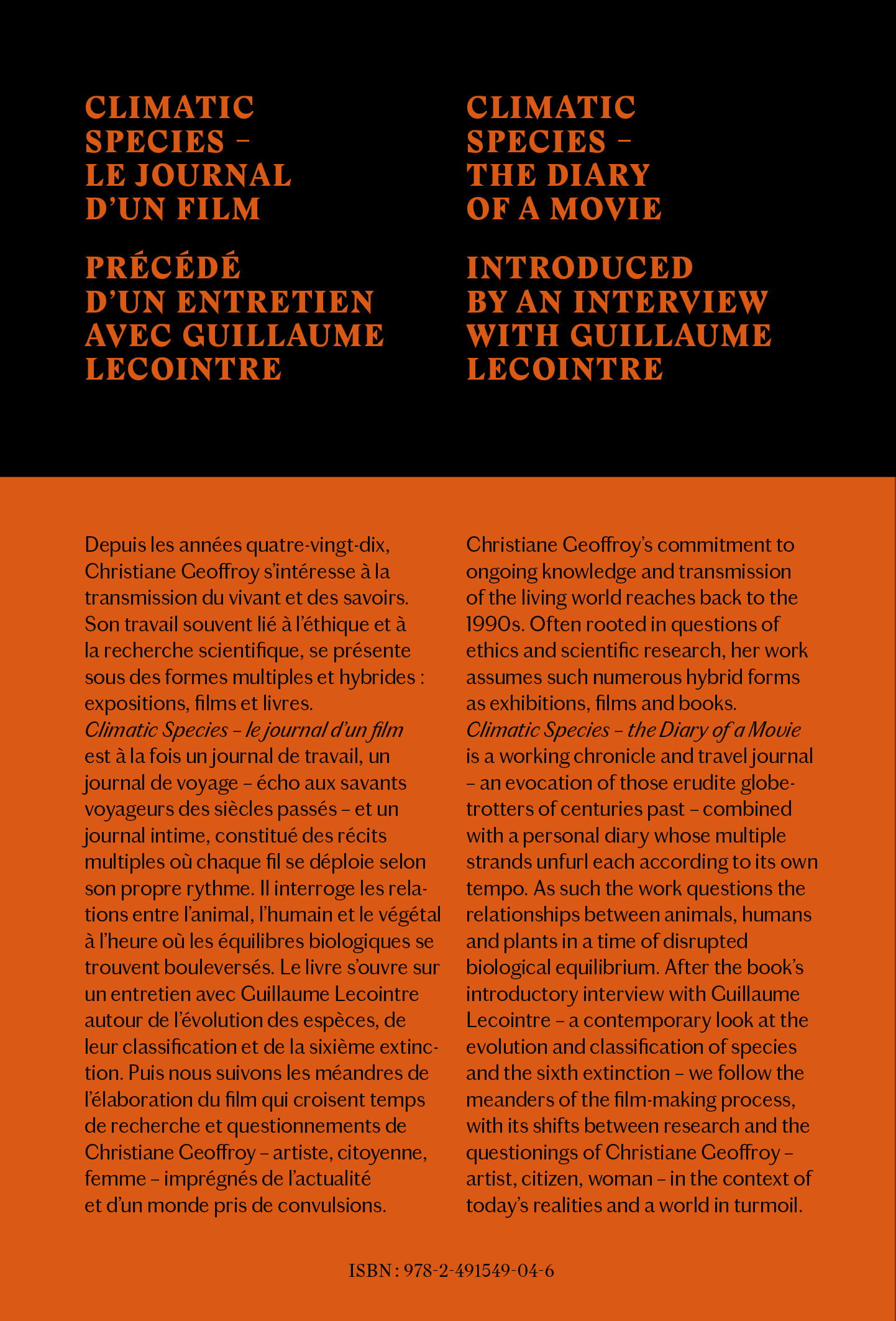 Christiane Geoffroy's commitment to ongoing knowledge and transmission of the living world reaches back to the 1990s. Often rooted in questions of ethics and scientific research, her work assumes such numerous hybrid forms as exhibitions, films and books. Climatic Species: Diary of a Movie is a working chronicle and travel journal—an evocation of those erudite globetrotters of centuries past—combined with a personal diary whose multiple strands unfurl each according to its own tempo. As such the work questions the relationships between animals, humans and plants in a time of disrupted biological equilibrium. After the book's introductory interview with Guillaume Lecointre—a contemporary look at the evolution and classification of species and the sixth extinction—the film offers a meander through current research and the issues addressed by this artist, citizen, and woman, in a context of today's realities and a world in turmoil.