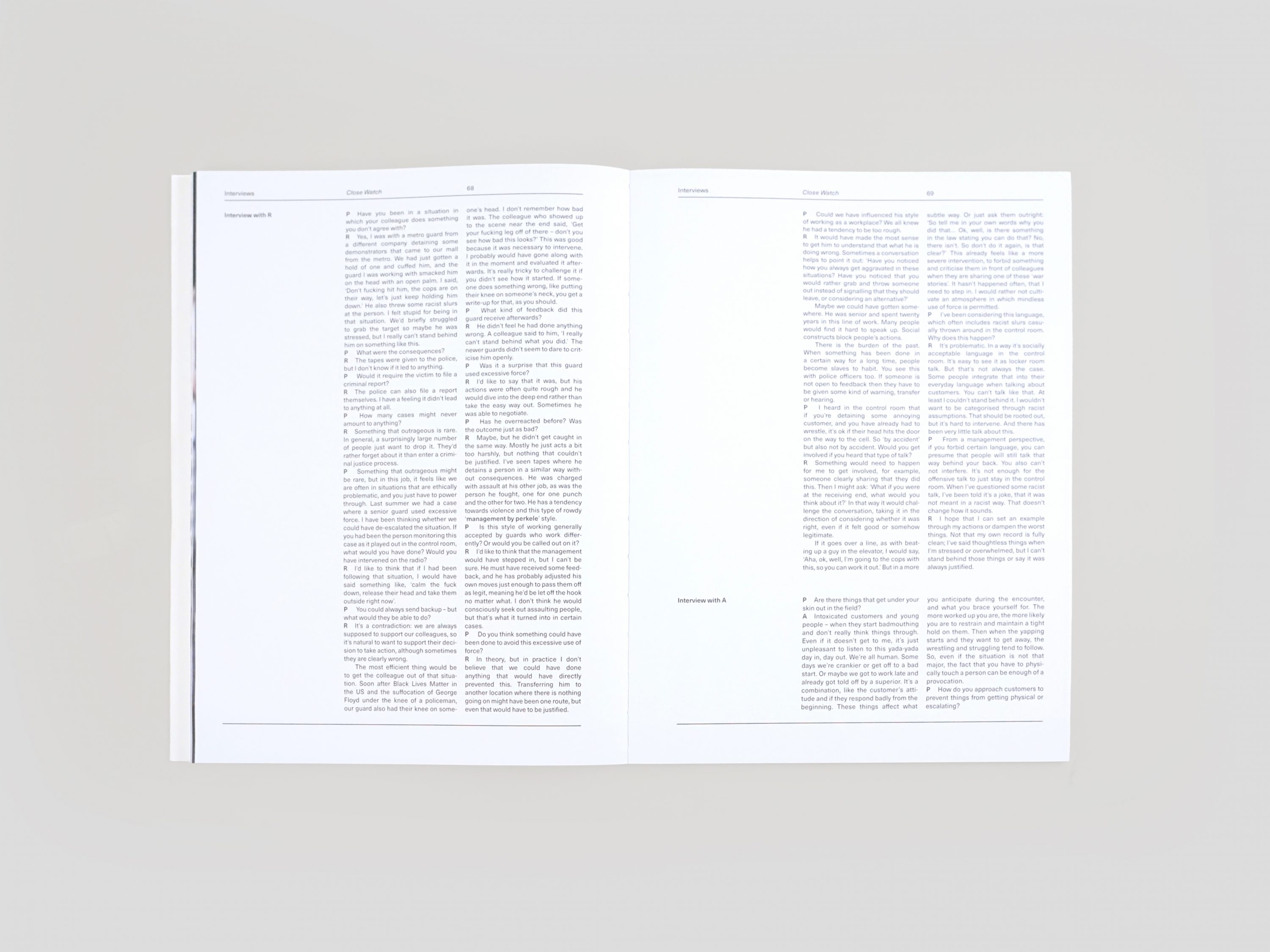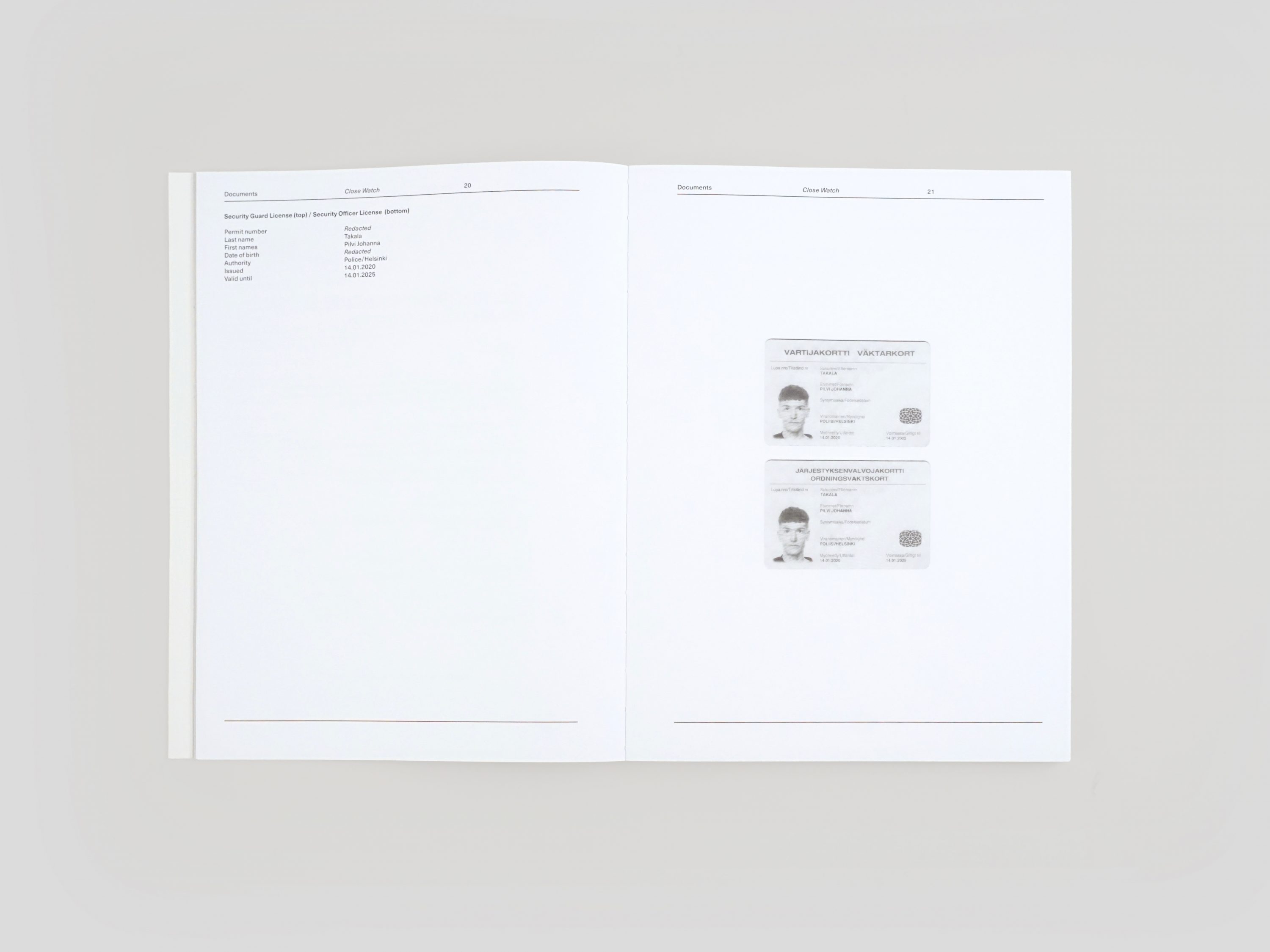 This publication is part of Close Watch, Pilvi Takala's new commission for the Pavilion of Finland at the 59th Venice Biennale, 23 April – 27 November 2022. The multi-channel installation is based on the artist's experience in the private security industry, where she worked as a fully qualified security guard in one of Finland's largest shopping malls. During her six-month employment period, Takala was interested in navigating the difficulties and ethical dilemmas she would encounter on the job. Featuring notes, interviews and other materials, the publication encapsulates the extensive preparation and field research that informed the work's development to further open up the complexities around private security as both a concept and an industry.