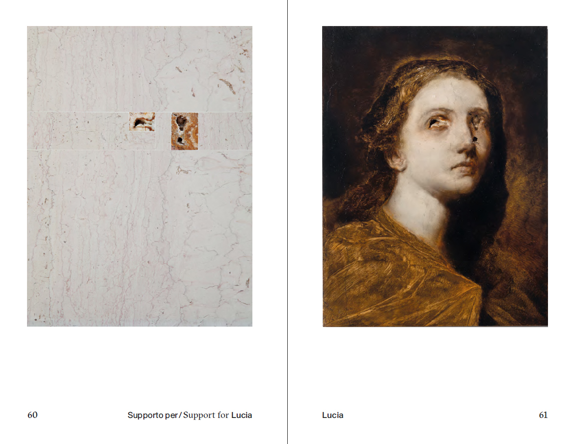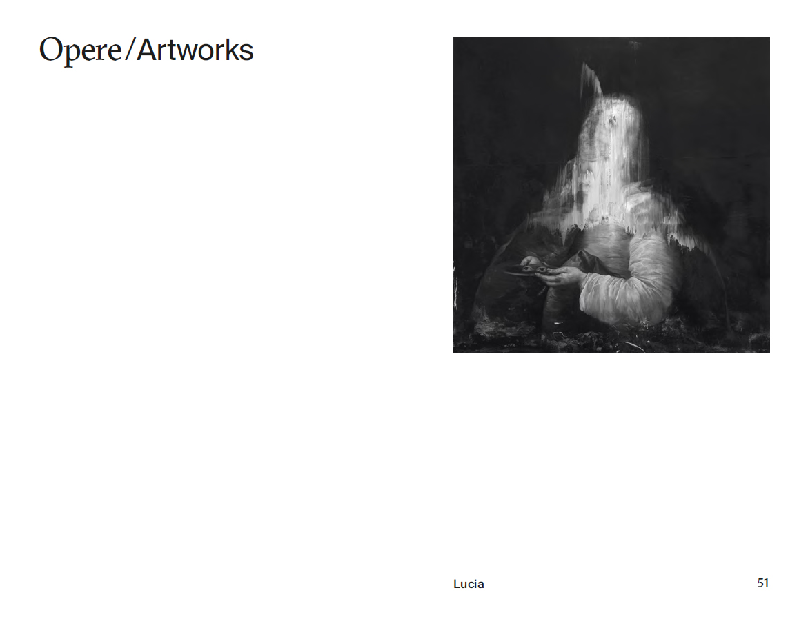 Lucia, to whom the exhibition is dedicated, is present in many forms: Samorì beheads her, blinds her, dazzles her, even stabs her neck with a paintbrush. The artist's intervention also includes other women, using paint to deform them and to change the perception of the viewer, who is constantly forced to wonder what the meaning of this butchery is. Samorì does not give his subjects any rest, he tortures them but doesn't allow them to die. He comes as close as possible to death, imposing on his characters an endless suffering, because it is precisely in the deepest pain, in the eternal resistance, that the pathos of this works is manifested.