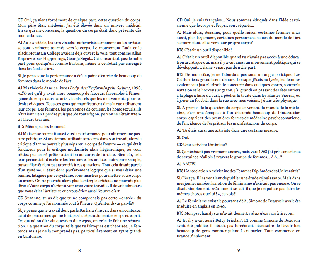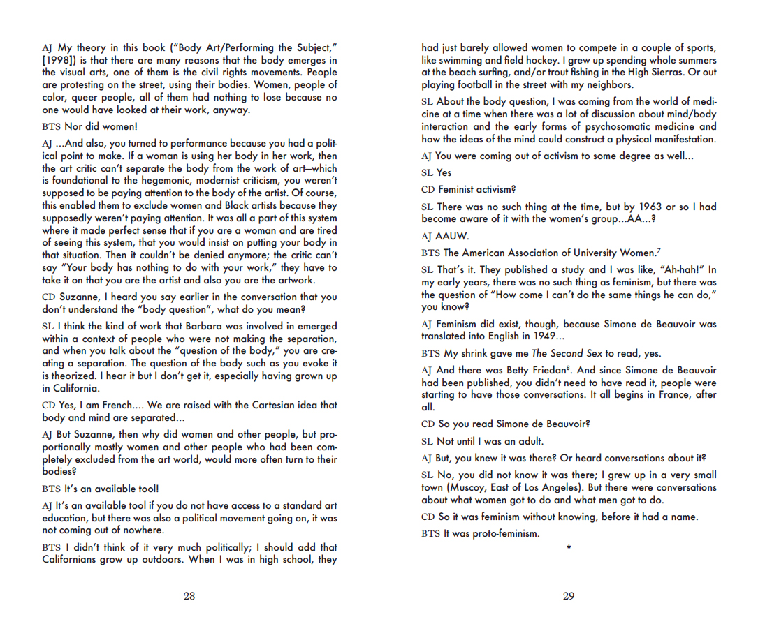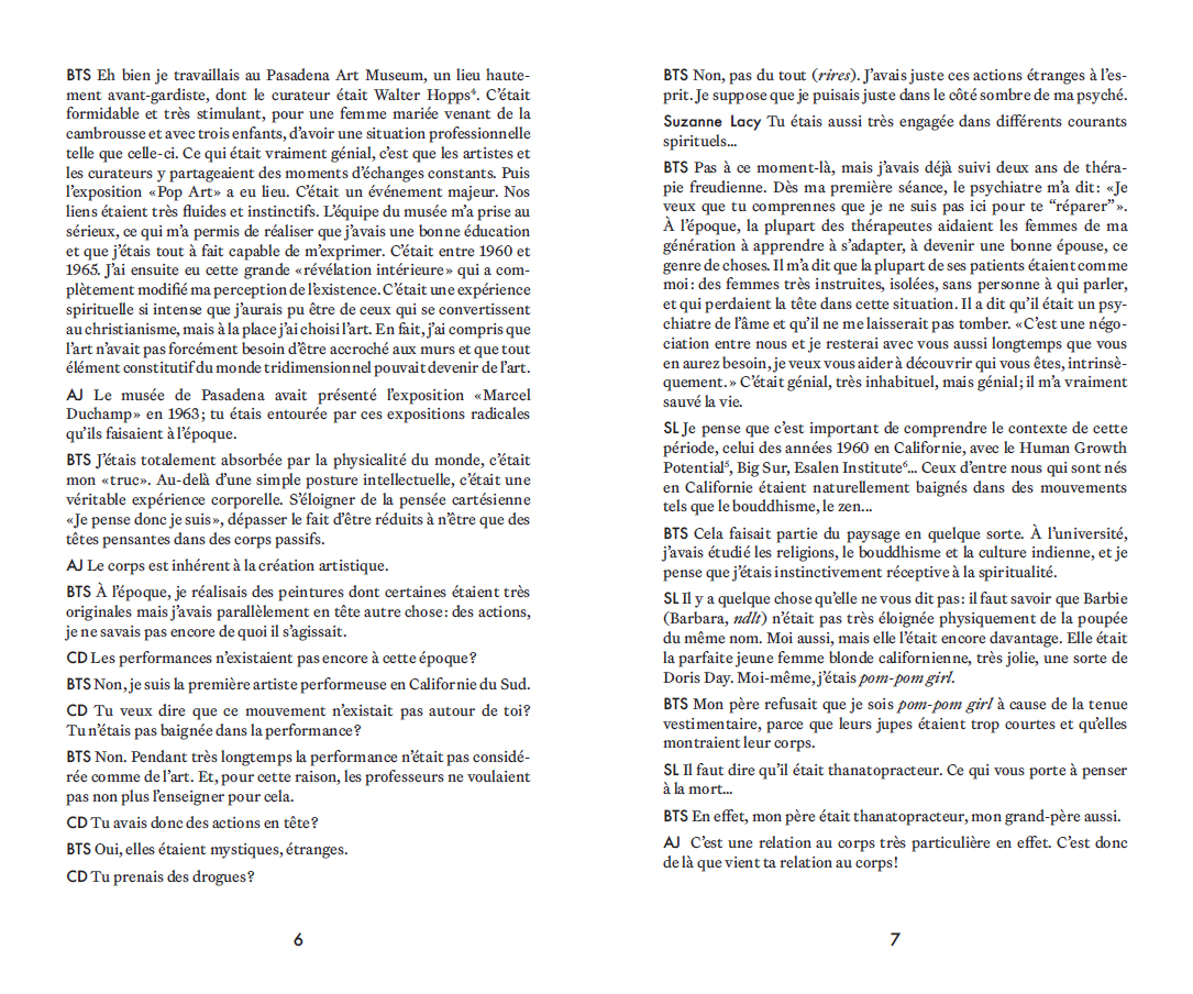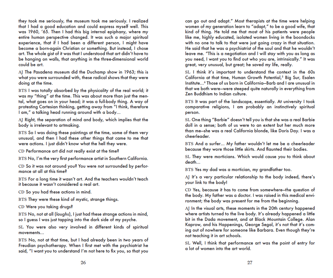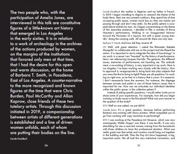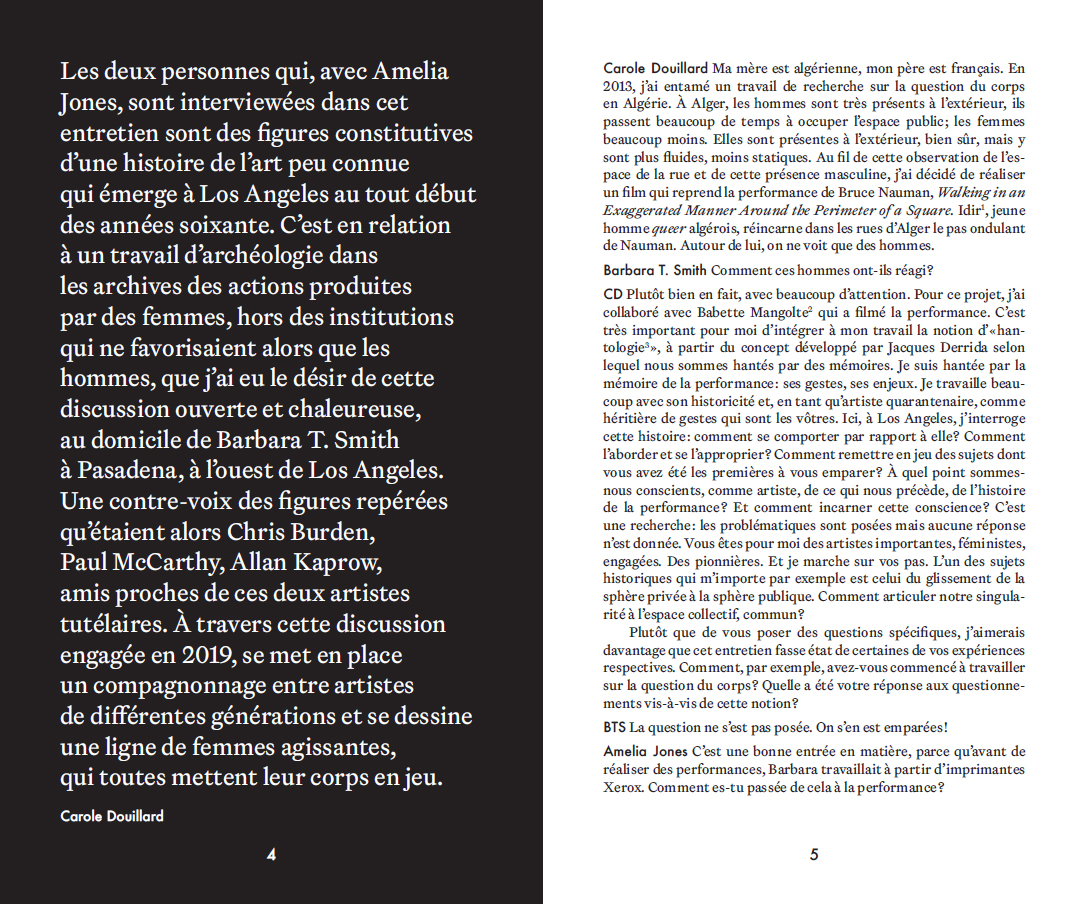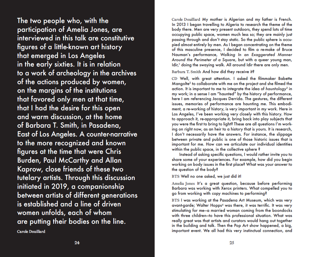 "The two people who, with the participation of Amelia Jones, are interviewed in this talk are constitutive figures of a little-known art history that emerged in Los Angeles in the early sixties. It is in relation to a work of archeology in the archives of the actions produced by women, on the margins of the institutions that favored only men at that time, that I had the desire for this open and warm discussion, at the home of Barbara T. Smith, in Pasadena, East of Los Angeles. A counter-narrative to the more recognized and known figures at the time that were Chris Burden, Paul McCarthy and Allan Kaprow, close friends of these two tutelary artists. Through this discussion initiated in 2019, a companionship between artists of different generations is established and a line of driven women unfolds, each of whom are putting their bodies on the line."