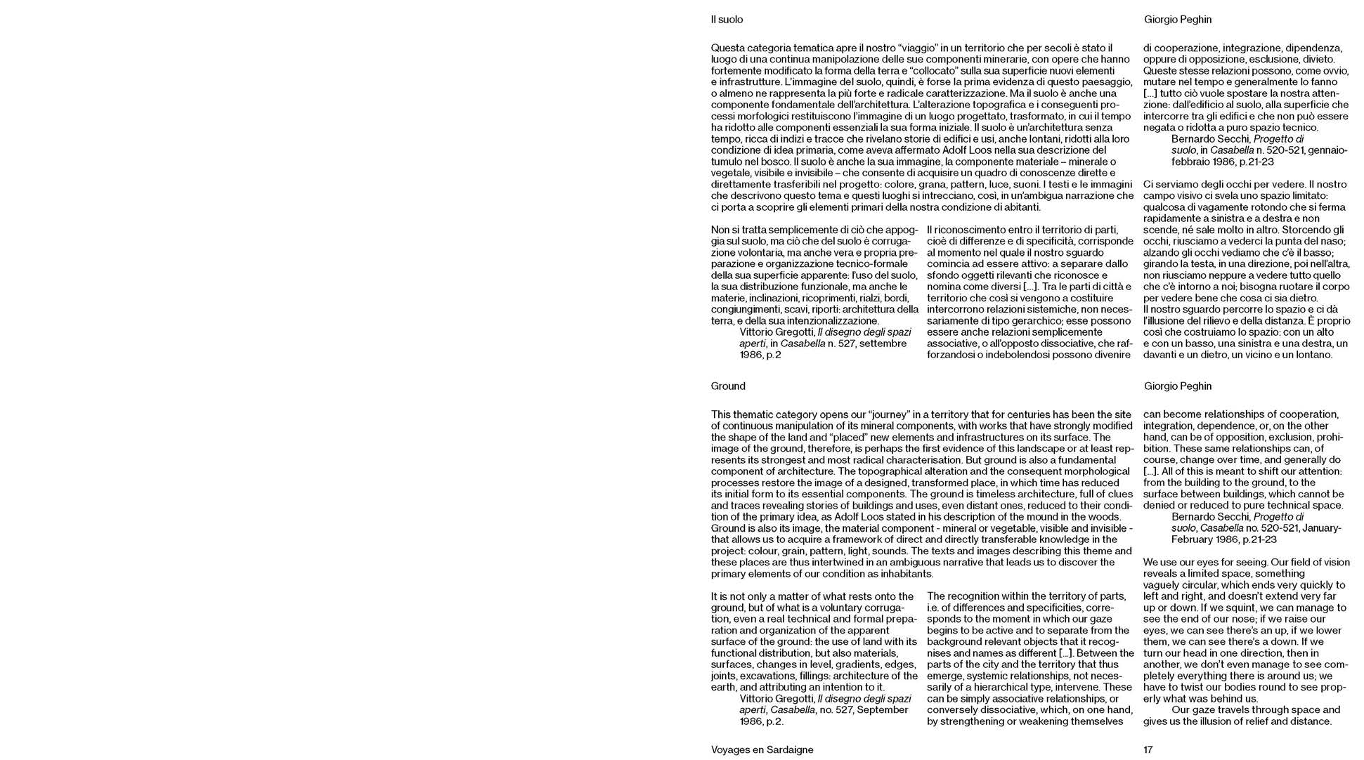 Voyages en Sardaigne is a collection of unconventional thematic guides on this island in the middle of the Mediterranean. They offer to the reader different ways of observation and restitution of its territory, always characterized by an uncertain temporality:the present and the past merge to build a unique landscape, far from the convulsive setting of the contemporaneity. The Sardinian context becomes a paradigm to go beyond the debate between the two opposite poles: novelty and tradition. To weave this portrait, photographs and texts take part in the production of an anthology capable of offering a multiplicity of possible representations. Words and images form a linguistic whole in which the word and the gaze reveal the possible relationships and directions to discover these places.