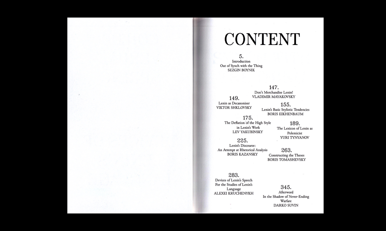 The publication is edited by Sezgin Boynik, who wrote an extensive introduction to the translations by contextualising the experiments of the Russian avant-garde through theories of conjuncture, or more precisely, the theory of contemporaneity within the revolutionary moment. Darko Suvin in his afterword discusses the actuality (and limits) of Lenin and Formalists in the shadow of never-ending warfare.
