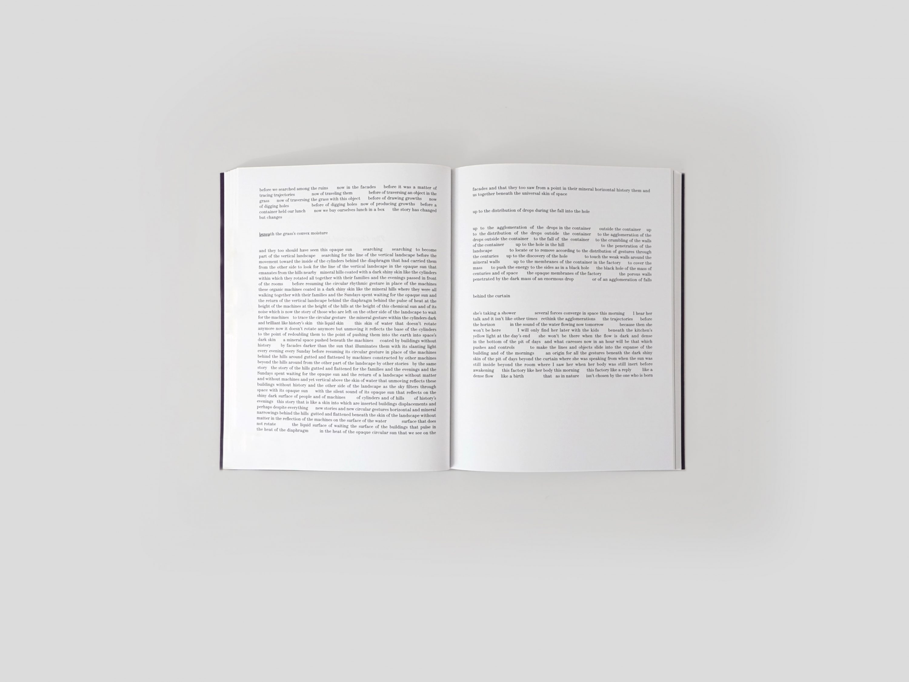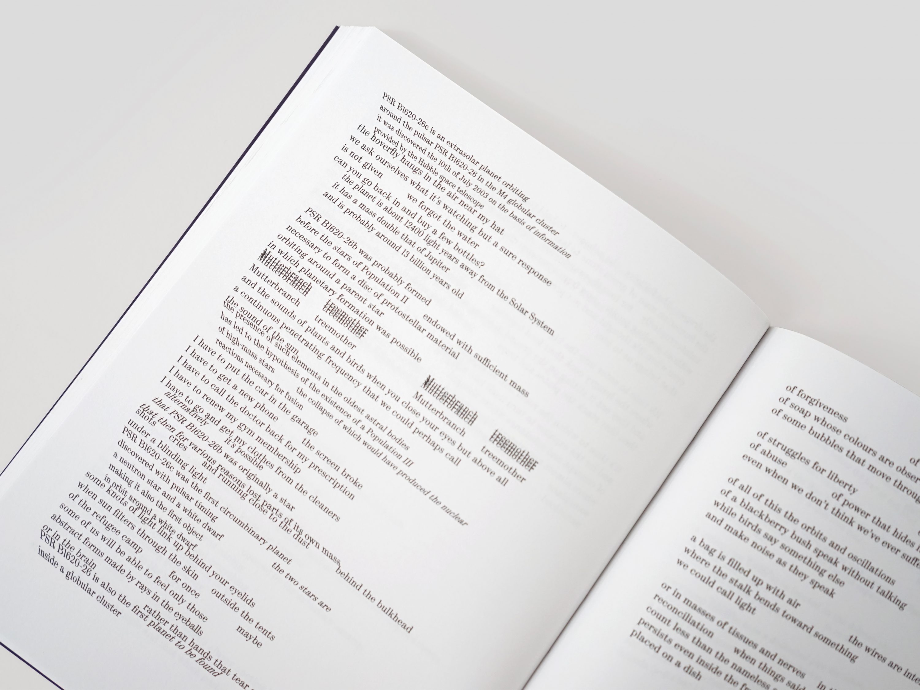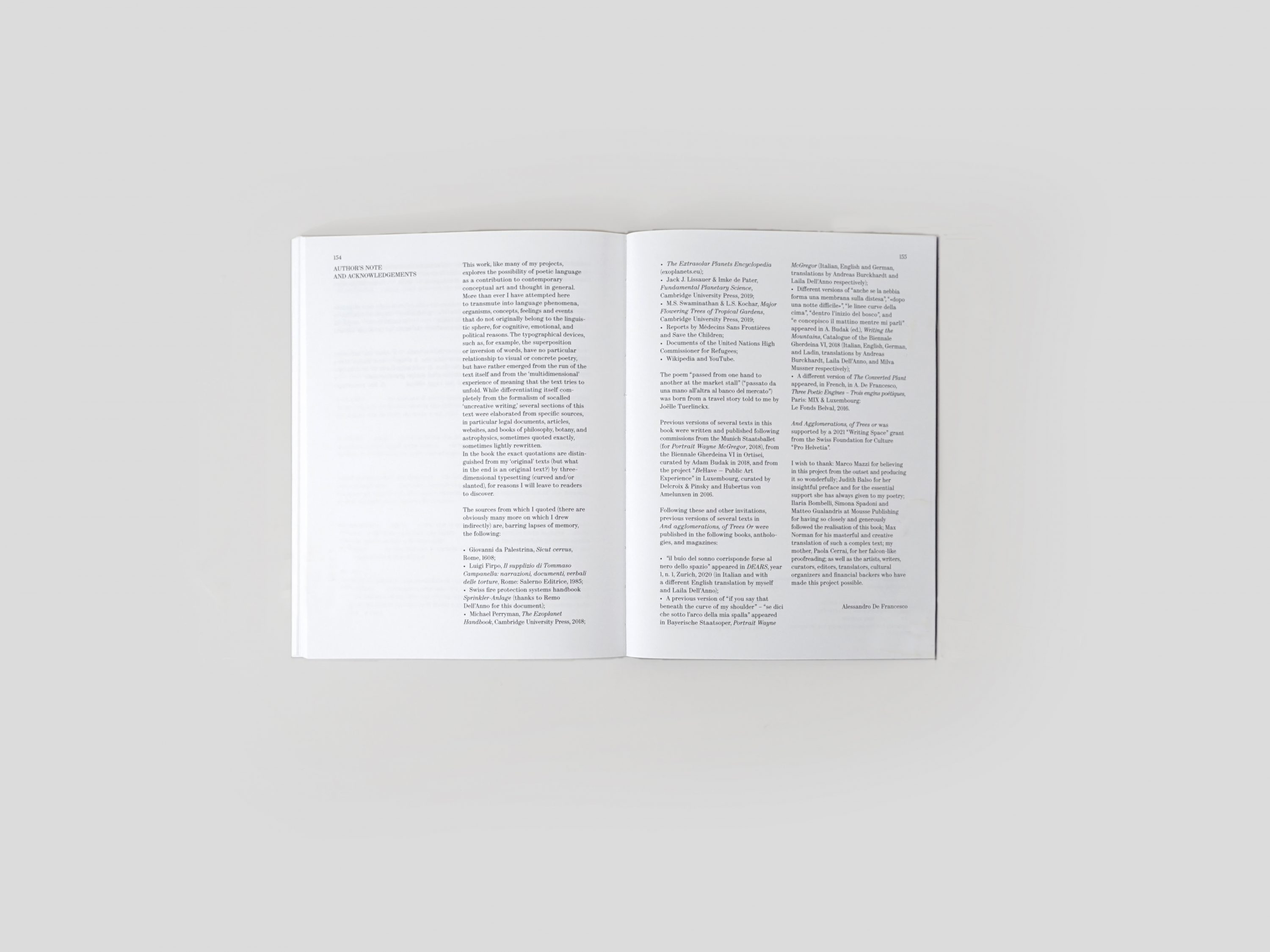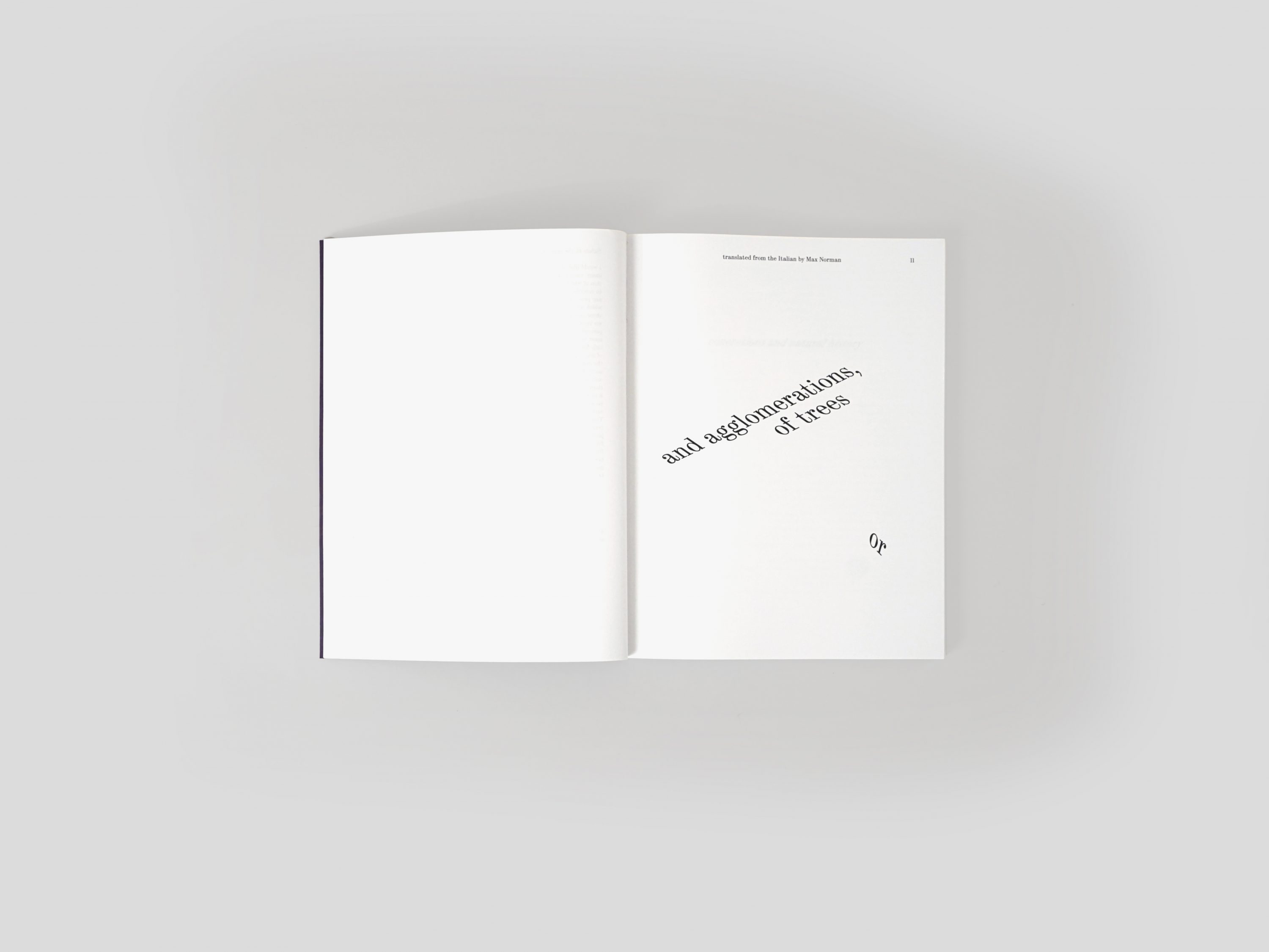 Alessandro De Francesco has been blurring the boundaries between poetry and artistic practice for over fifteen years. In his radical and increasingly influential work, the bare text, often in multiple languages, becomes an environment, a living organism, a set of relations, and a junction in spacetime where things appear. With conceptual complexity and emotional intensity, his dense writing explores in unexpected ways the relations between history and nature, thought and meaning, (mental) images and feelings, language and space. While his internationally exhibited projects span digital voice processing, virtual reality, printmaking, archive research, and community-oriented actions, the book and the text—like here with