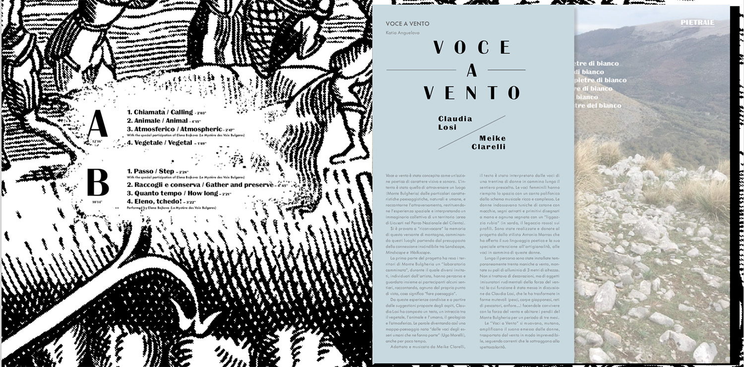 Voce a vento (a vinyl LP + an artist's book) represents the result of a choral, visual and performative intervention realized by Claudia Losi in the Cilento countryside in Southern Italy in 2018.