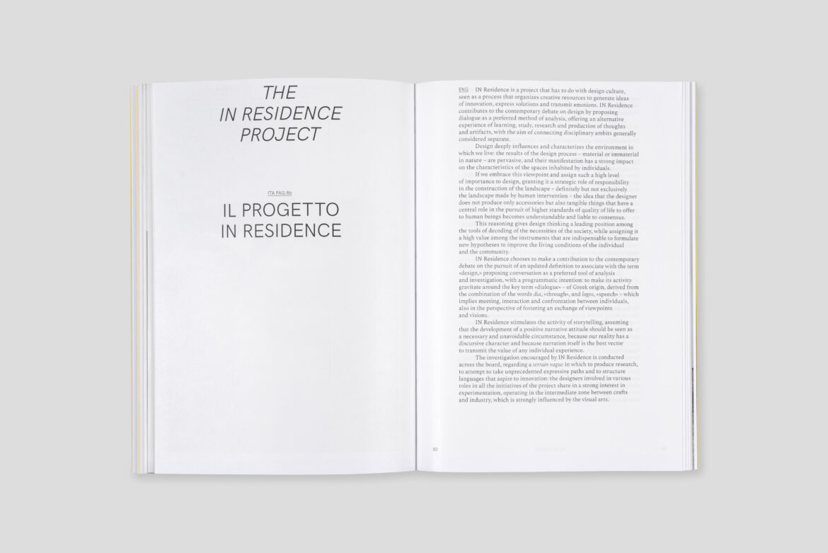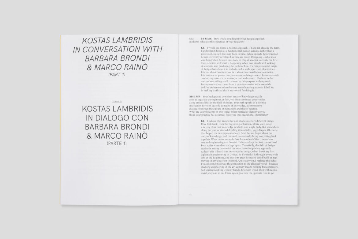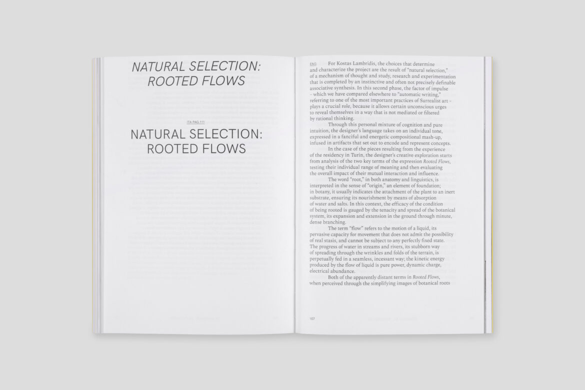 Illustrated by a rich photographic series, the book presents the results of Lambridis' creative thought through some selected projects; written by Barbara Brondi & Marco Rainò, the volume recounts the experience of the Design Residency inspired by the theme "Rooted Flows" Lambridis was the protagonist of, which is part of the broader project IN Residence, a research program dedicated to design that has elaborated new reflections in the field of education and training, as well as in the support and promotion of creative talent, through an intense and recognized activity.