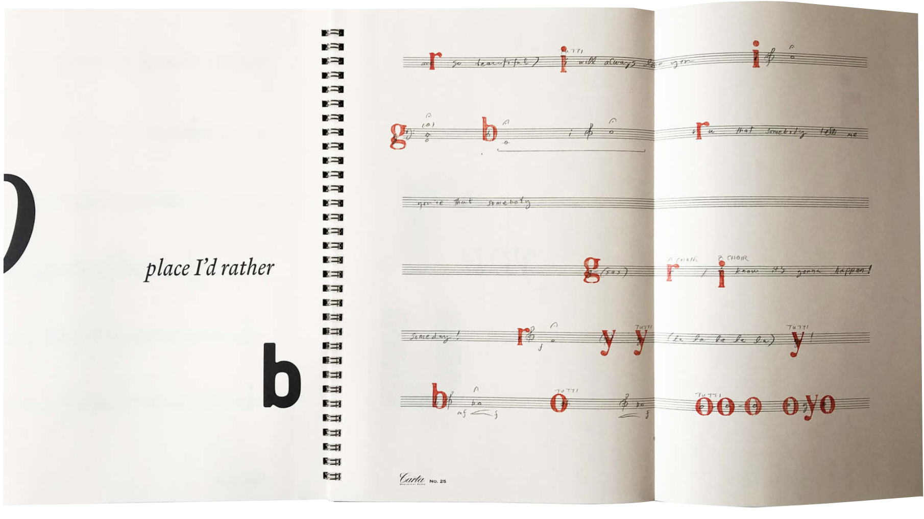 A punning riff on spectral composition, the score from the work hinges on the misapprehension of the letters "r-o-y-g-b-" as song lyrics ( "are you that somebody…" "oh, oh, oh…" "why should my heart…" "just be…"). A choir is instructed to recall and re-perform in dense clusters of call-and-response, song fragments prompted by the familiar letters of the spectrum, which in the work's premiere, were collected and projected vertically into the architectural volume of MoMA's atrium in the implied form of a rainbow.
