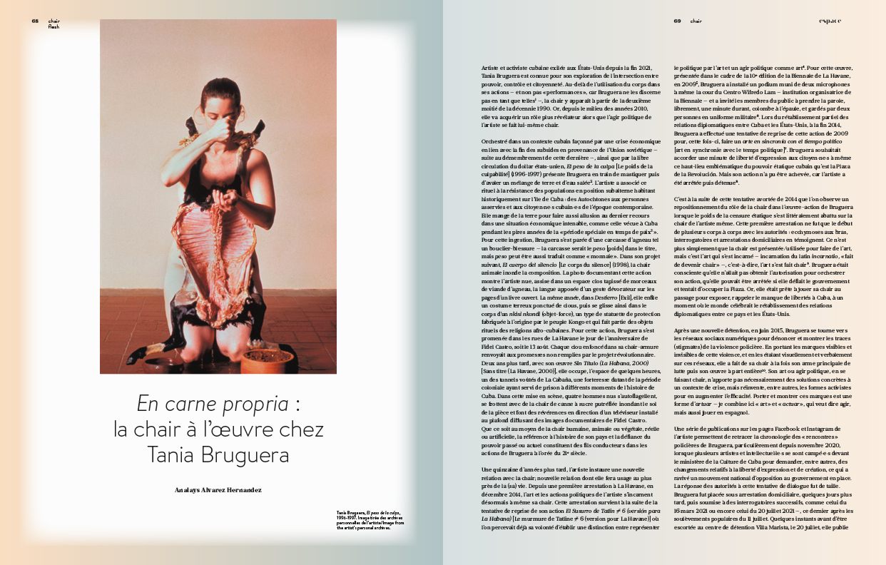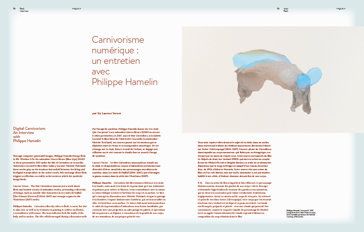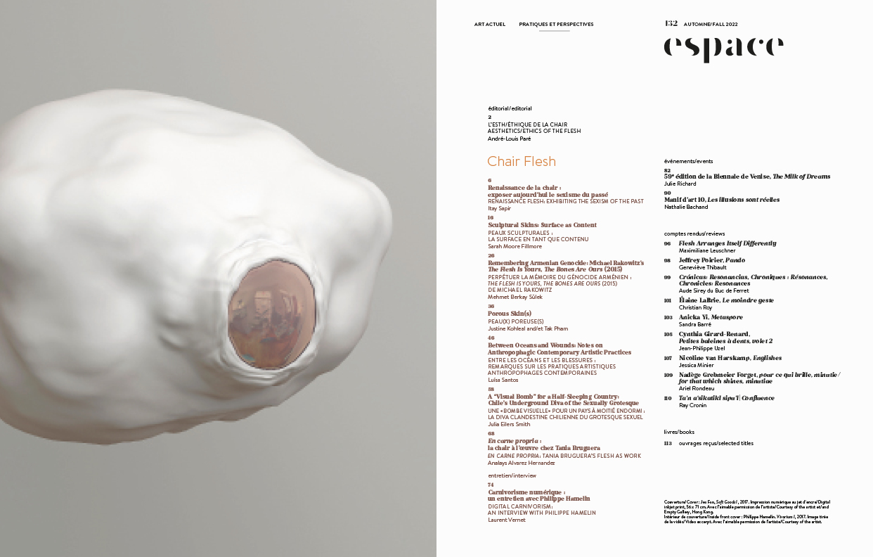 Cette chair (2017), a work by Haitian-born artist Stanley Février, is one example. The plaster sculpture is a life-sized reproduction of the artist. It shows him clothed only in underwear, kneeling with his arms raised, as though he is being threatened. Coated in white paint, the work implies a negation of his natural skin colour on behalf of one symbolizing the dominant culture. This is the spirit in which this issue's feature section, edited by artist and Assistant Editor Didier Morelli, reflects on the subject of the flesh. As "a material and sentient understanding of being," flesh is not experienced through a mode of asceticism. Intrinsically political, especially when associated with diverse cultural communities, we express the flesh through how we understand ourselves, but also through how different bodies of power perceive us.