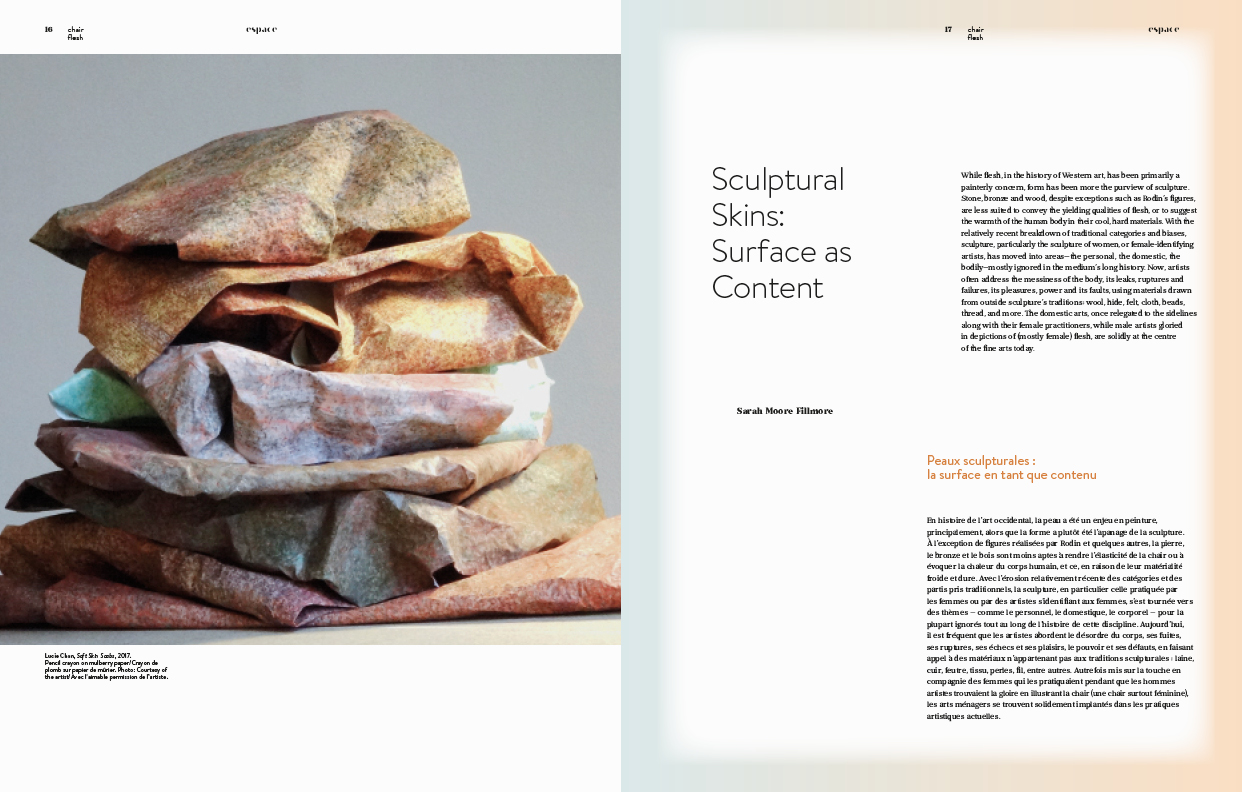 It is possible that flesh has long been a matter of pictorial depiction because sculpture has mainly been concerned with form. It would take the advent of contemporary art for the exploration of "sculptural skins" to address the idea of flesh in other ways. In her essay, Sarah Moore Fillmore, Chief Curator and Deputy Director of Programs of the Art Gallery of Nova Scotia, analyzes the work of artists Lucie Chan, Janice Wright Cheney, Ursula Johnson, Amy Malbeuf and Sarah Maloney. These artists think of the body "as a site for investigating colonialism, racism and sexism."They use "the body's corporeality" to construct new ways of being. Art historian Mehmet Berkay Sülek focuses his article on a work by Iraqi-American artist