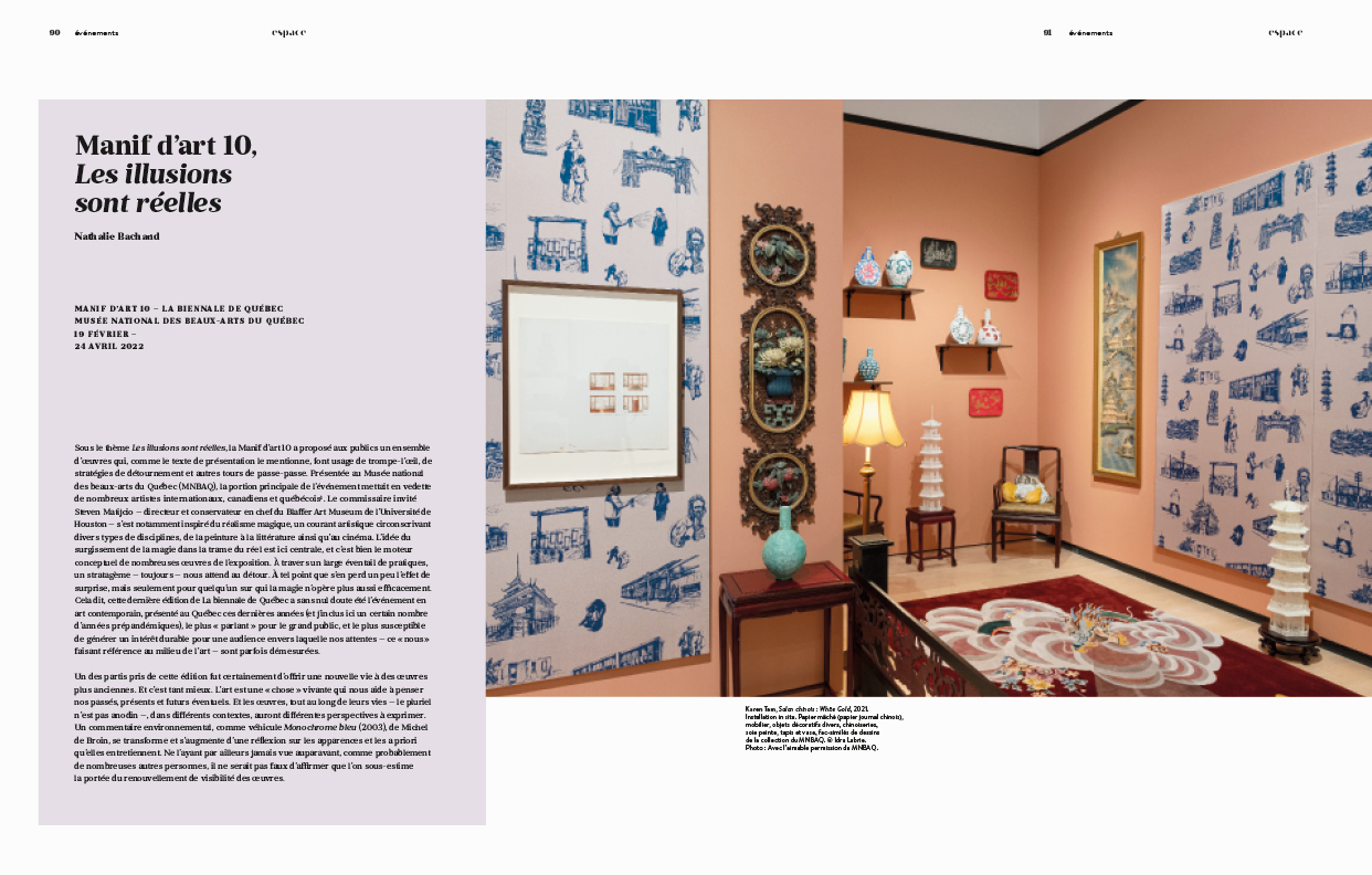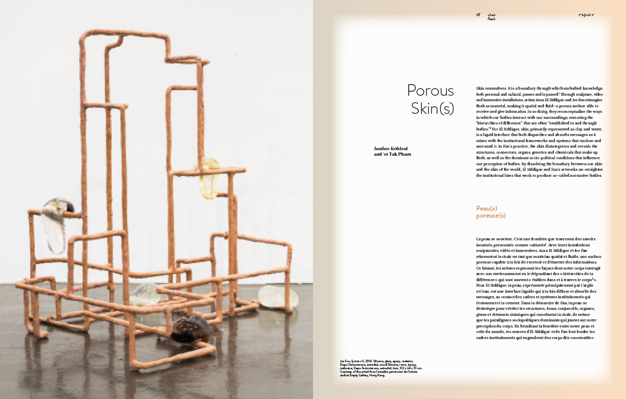 In a different context, Tak Pham and Justine Kohleal discuss a few works by artists Azza El Siddique and Jes Fan that deal with a recovery of the body. Through their work, these artists reconsider how our bodies interact with the environment by stripping it of "hierarchies of difference." To do this, their immersive video and sculptural installations reinvent the flesh as a spatial and fluid material, a porous surface capable of both receiving and transmitting information. Originally from Korea, Fan is particularly interested in the body in the act of transformation. Reproduced on the cover of this issue, the work