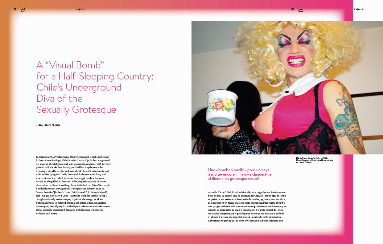 Thus understood, the aesthetics of the flesh takes us into a universe where salvation comes no longer from prescribed rules for an ideal purity, but from our willingness to experience the self in relation to others in our lives. With this in mind, Analays Alvarez Hernandez recalls the practice of Cuban artist and activist Tania Bruguera, who turns her own flesh into a work of political resistance that makes her confront the law enforcement of her country. This resistance to power, whether religious or political, is boldly expressed in the punk aesthetic of drag artist Hija de Perra (1980–2014), whom Julia Eilers Smith discusses in her essay. Smith presents several of de Perra's actions that involve transgression, in particular the one in which the artist parodies an abortion of a pig's head. The experience of the flesh, intimately tied to sexuality, is presented here in its most obscene iteration.
