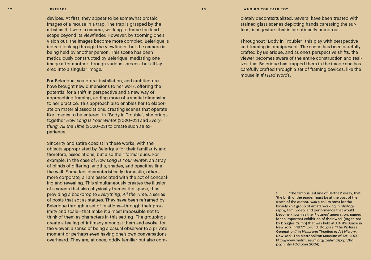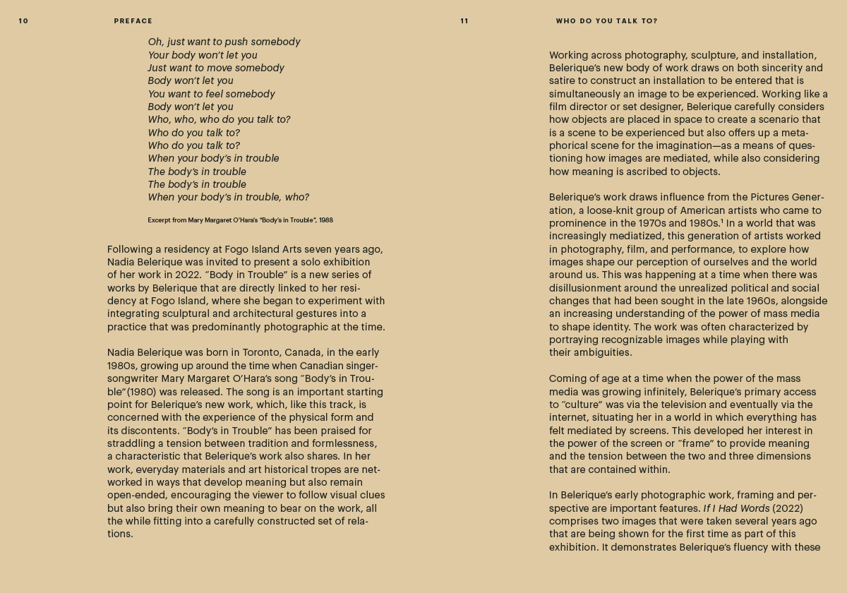Faisant suite à résidence et à une exposition organisée par Claire Shea et Nicolaus Schafhausen à la Fogo Island Gallery, cette publication abondamment illustrée, qui contient des textes critiques de Tom Engels et Ruba Katrib et une conversation entre Nadia Belerique et les commissaires, documente les expérimentations de l'artiste canadienne développées au cours de son séjour sur l'île Fogo, où elle a commencé à intégrer des gestes sculpturaux et architecturaux dans une pratique jusqu'alors principalement photographique.